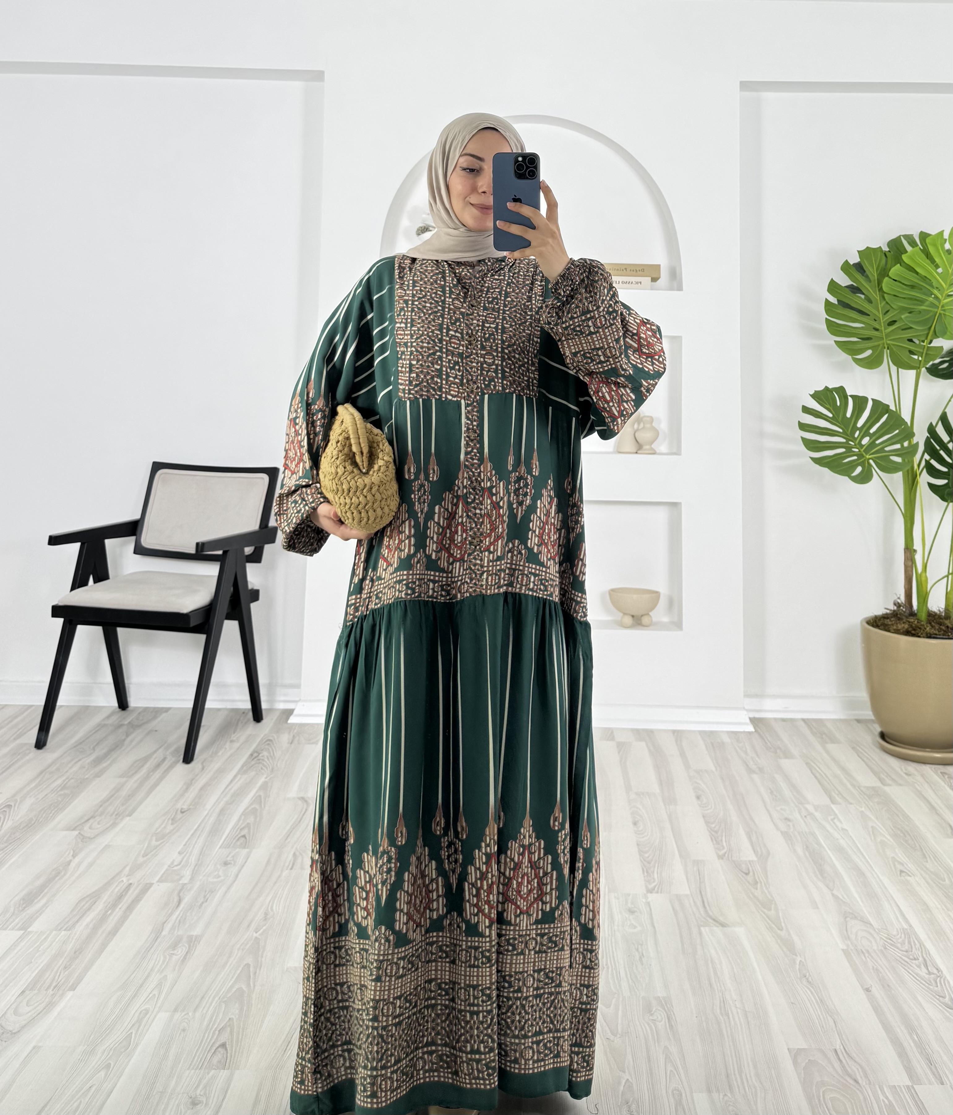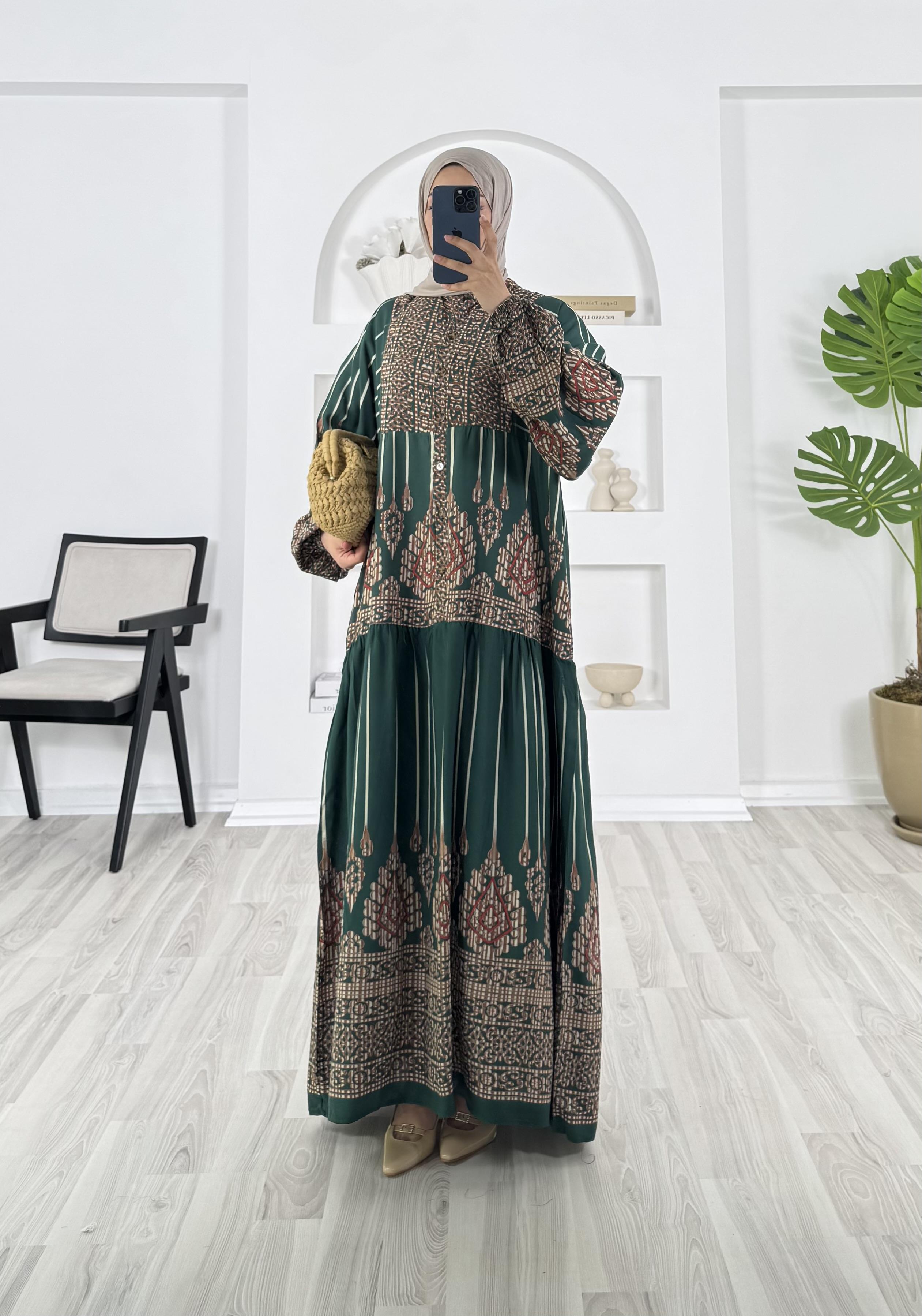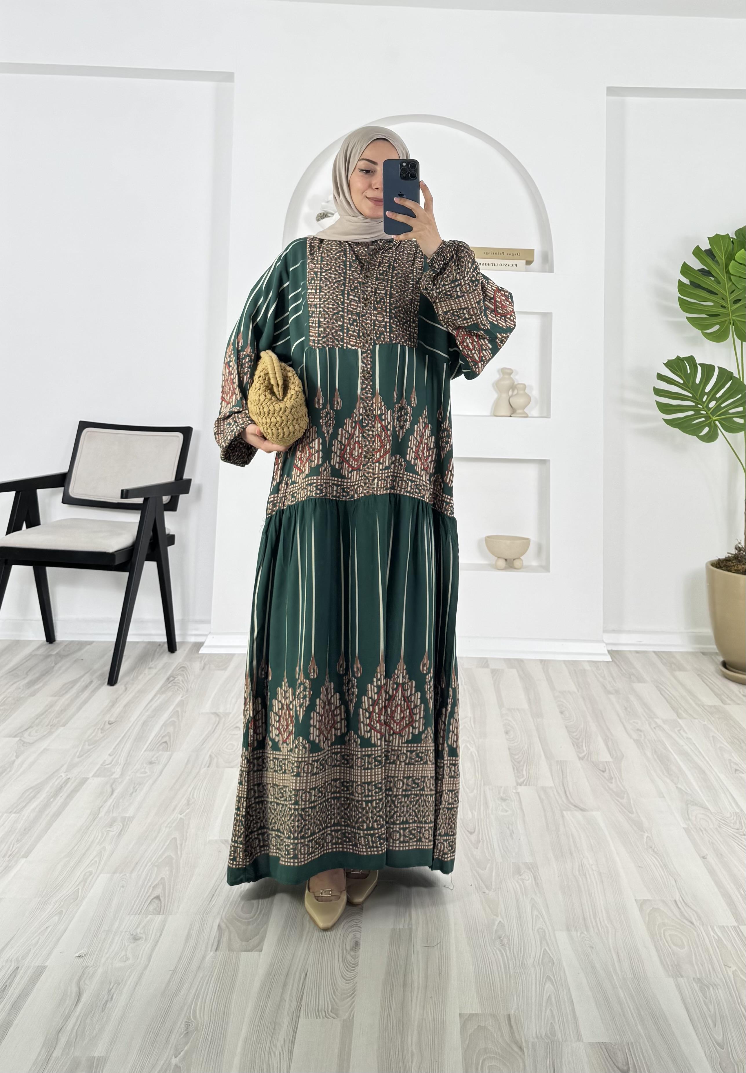 yarım düğmeli desenli elbise