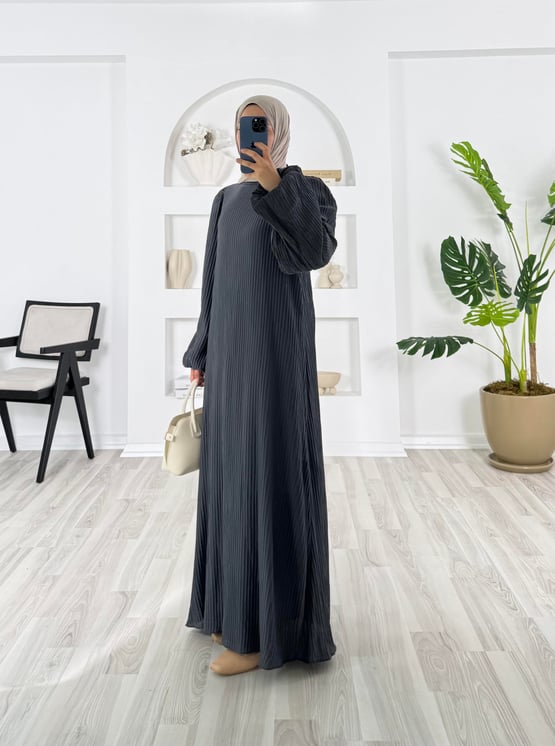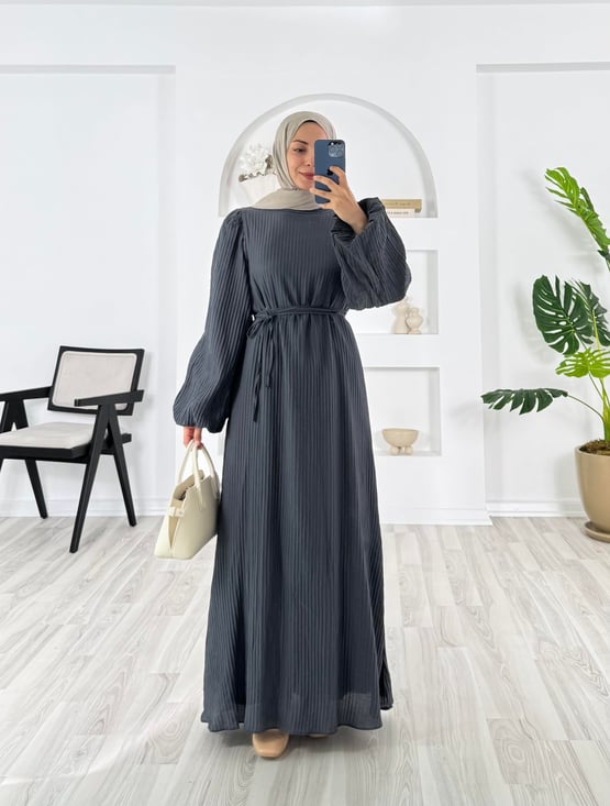 4172-vrn polyester kumaş-balon kol hakim yaka kemerli elbise-füme (4172)