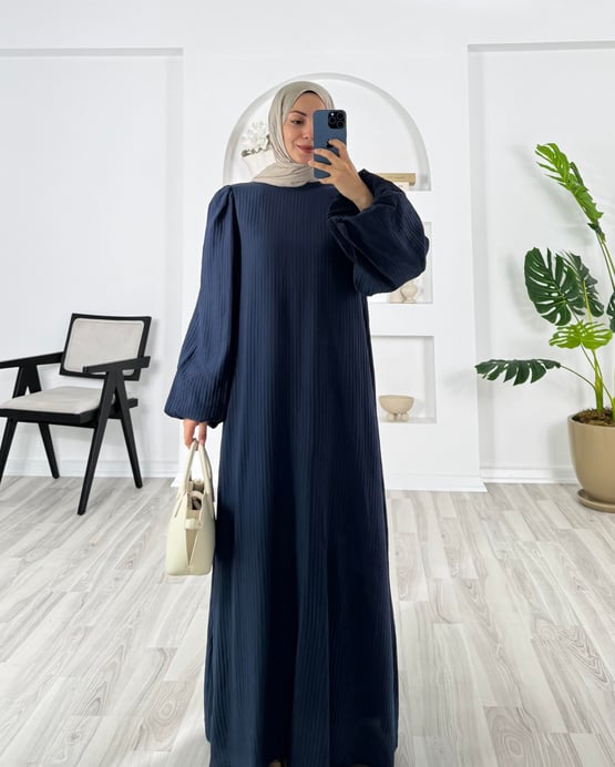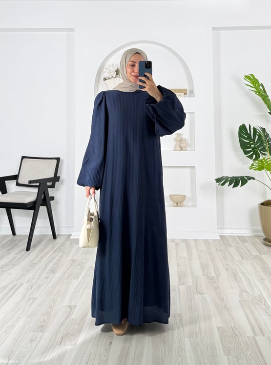 4172-vrn polyester kumaş-balon kol hakim yaka kemerli elbise-lacivert (4172)