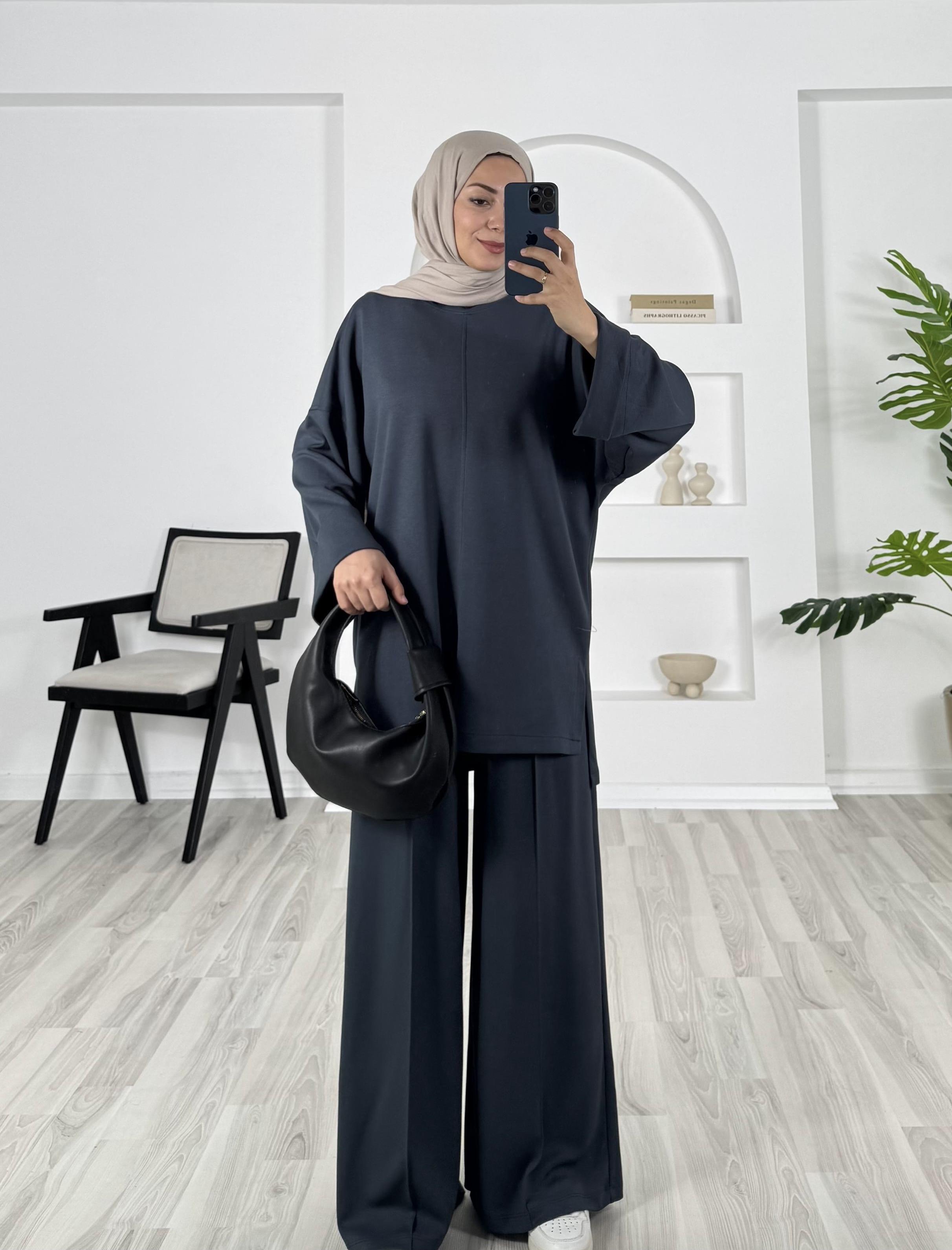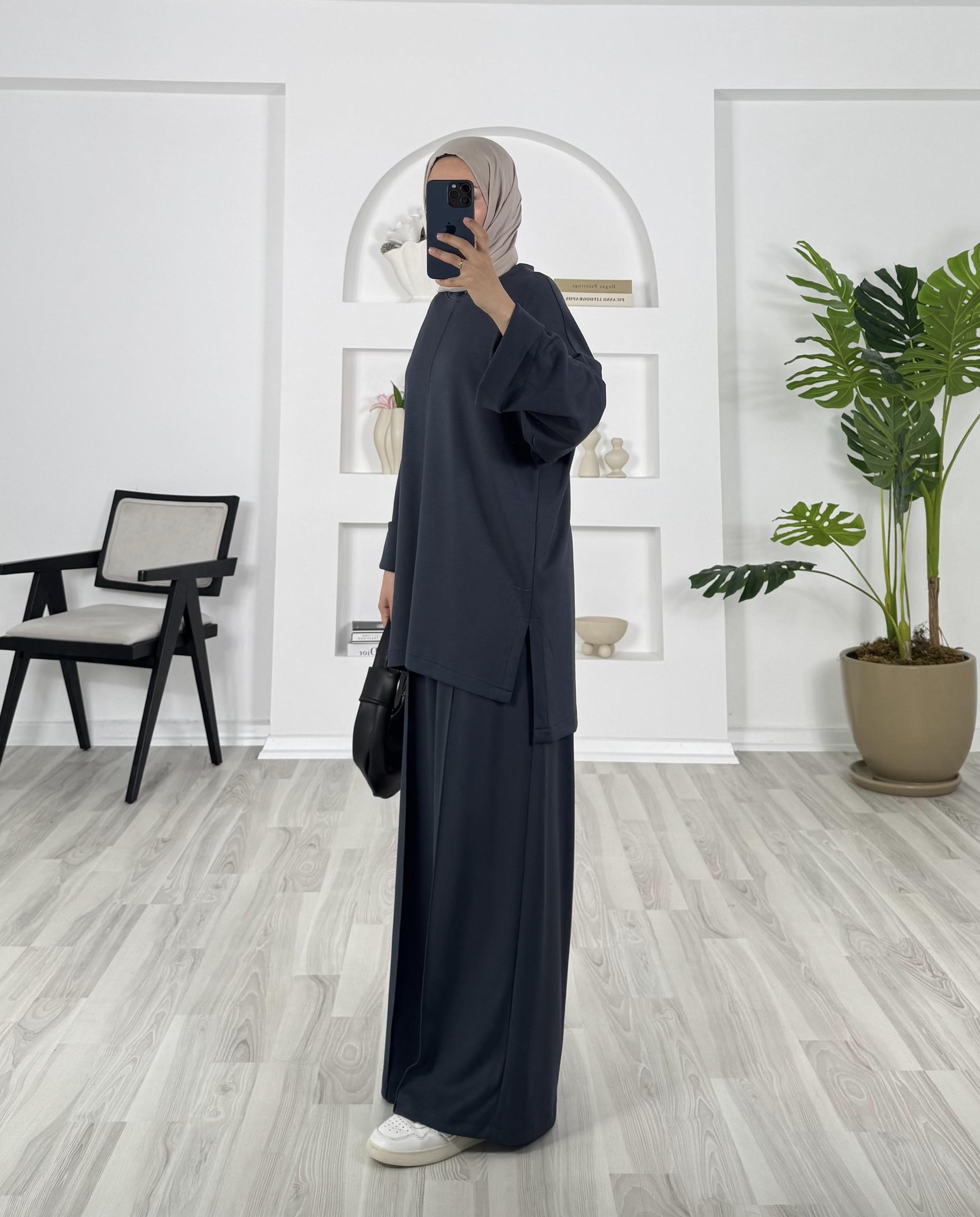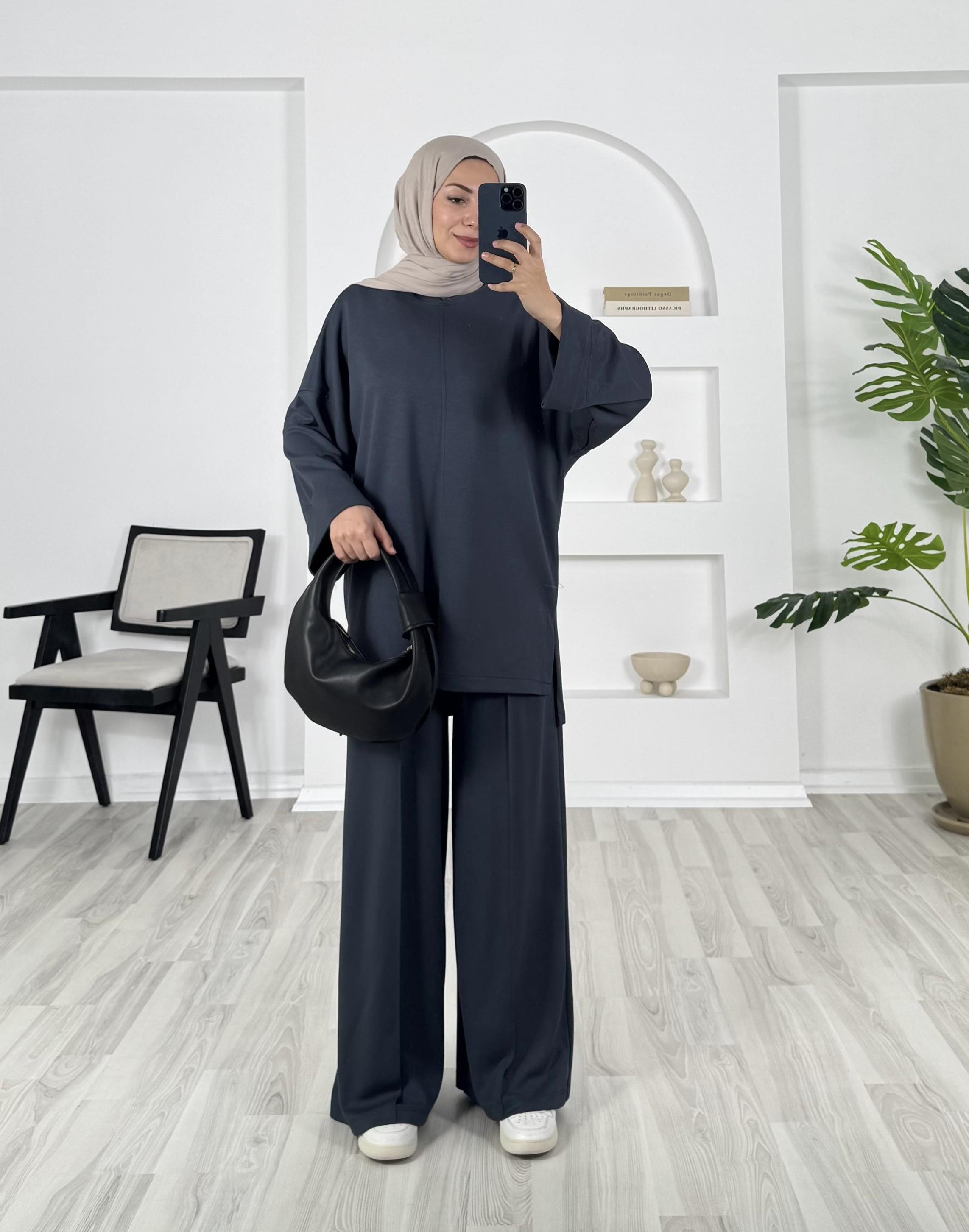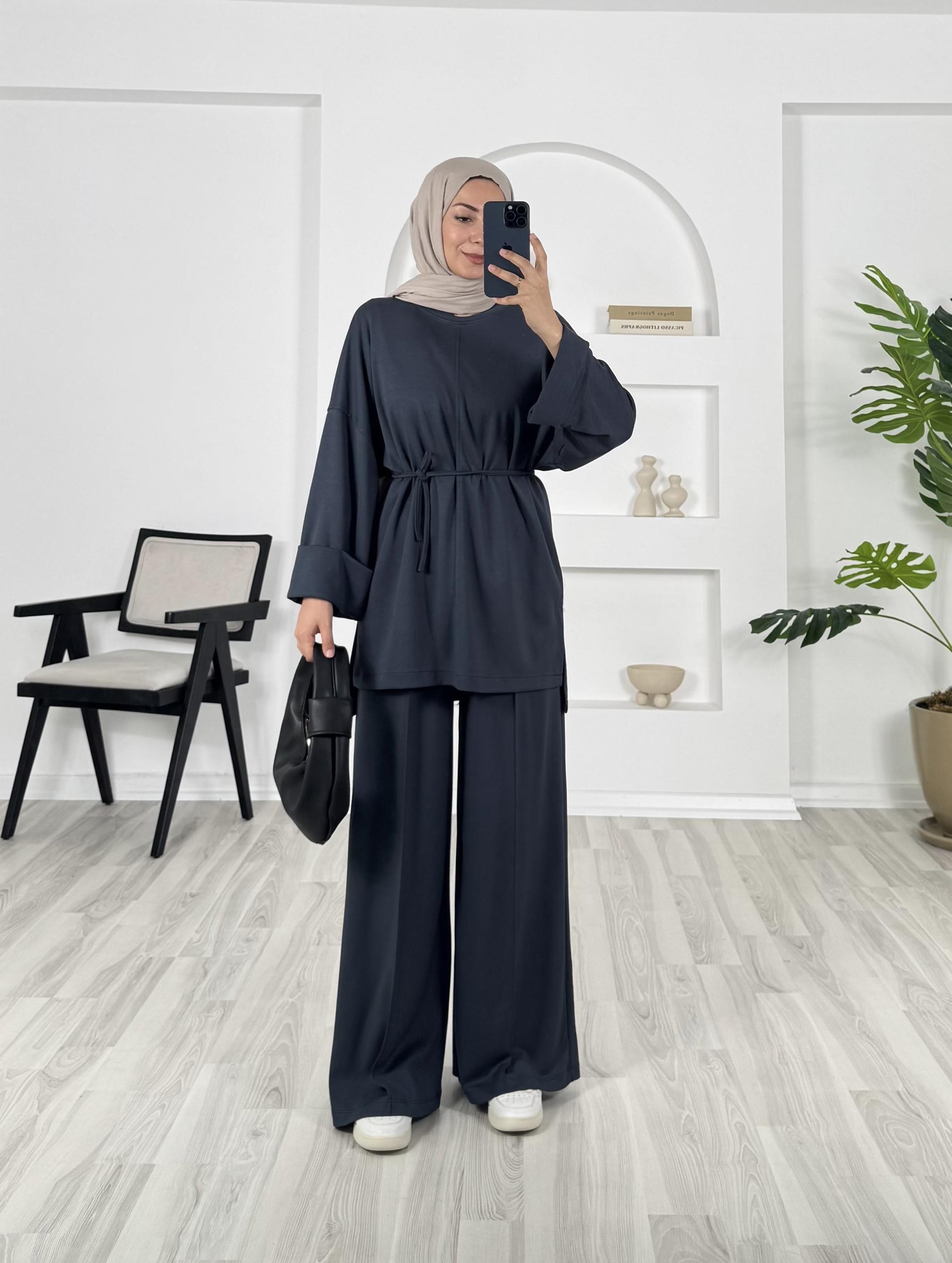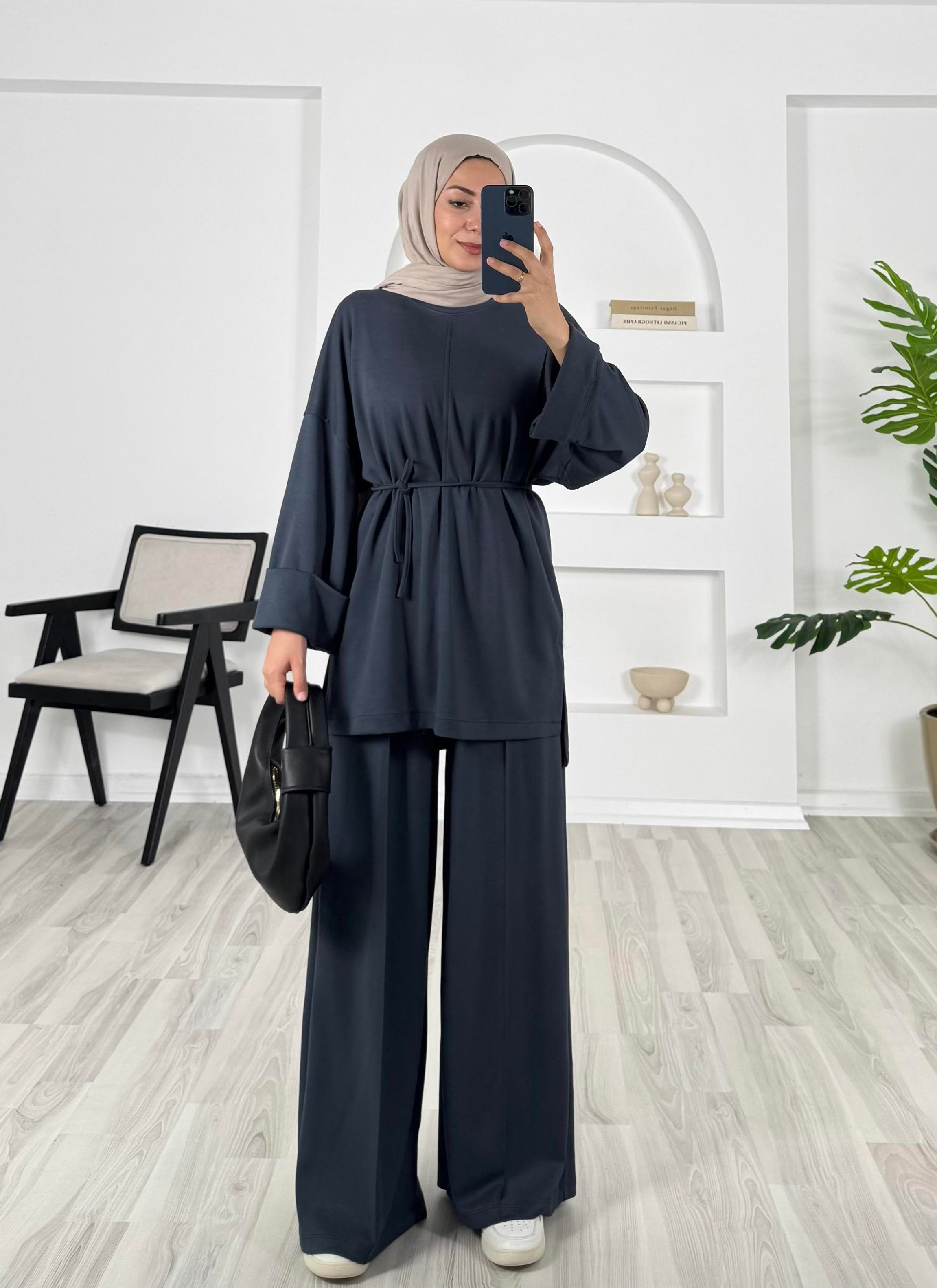 4223-oysho kumaş-kemer detaylı pantolonlu takım-füme (4223)