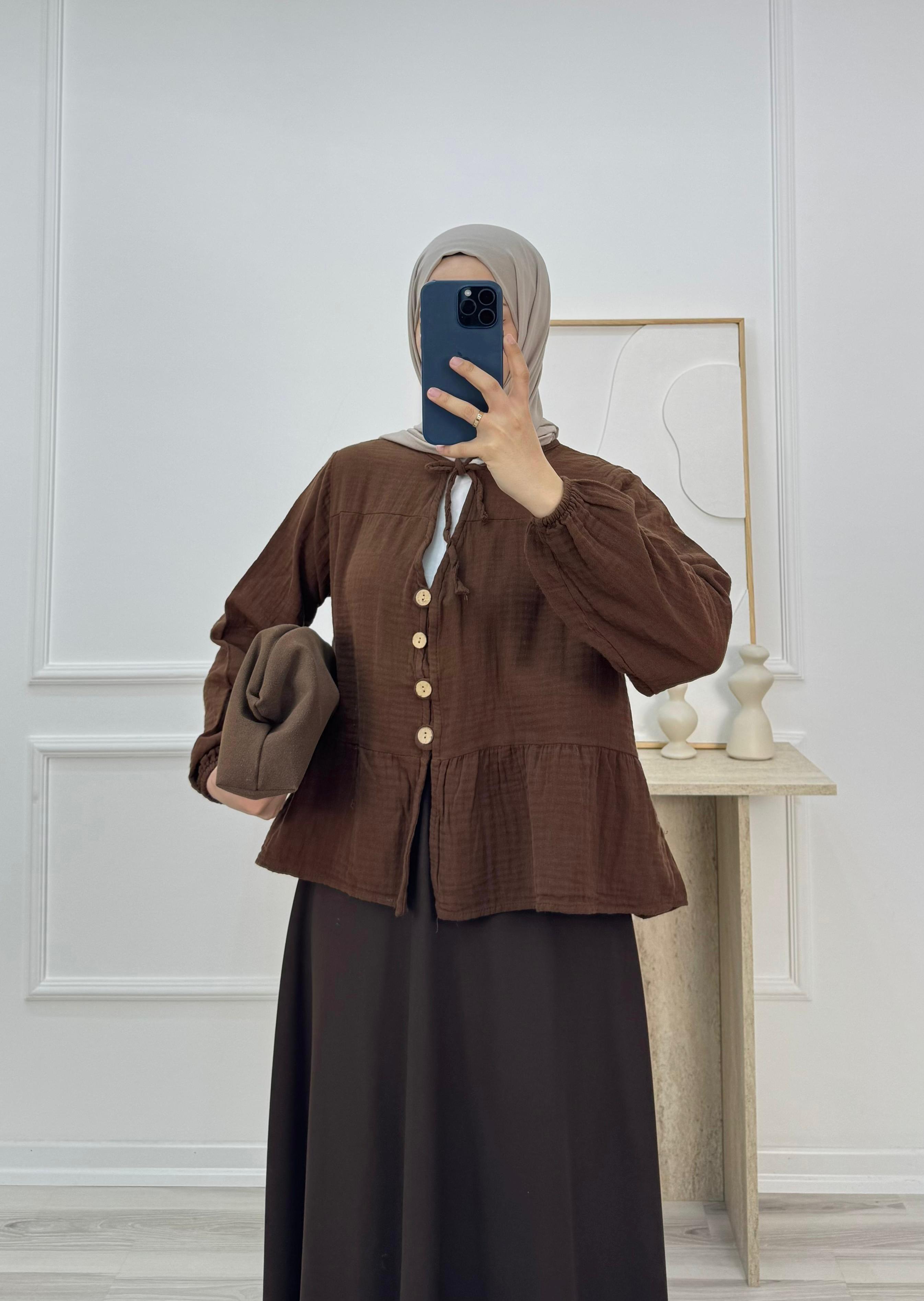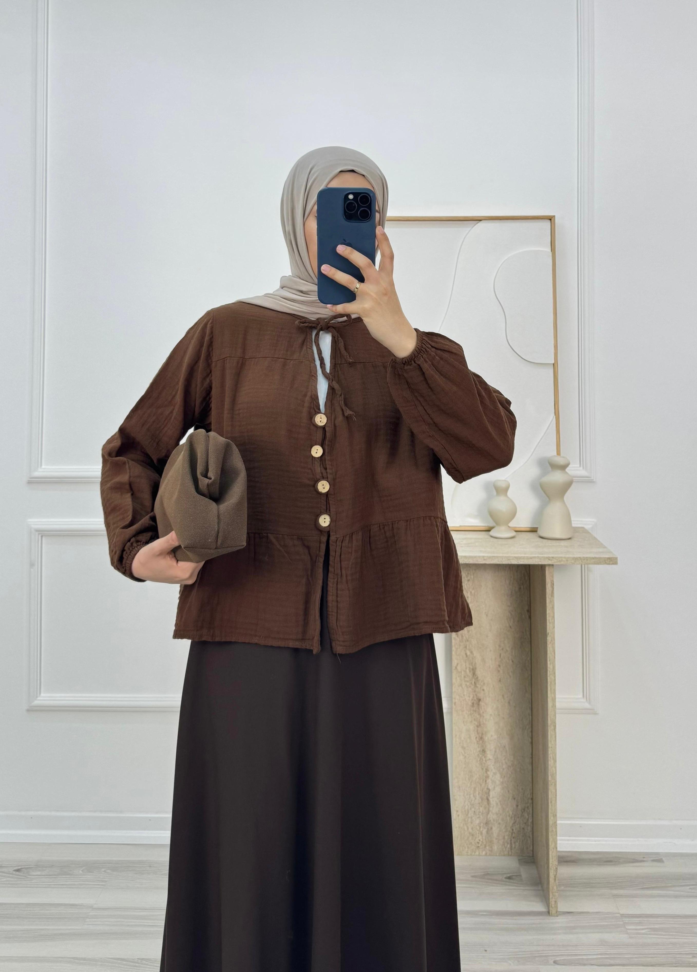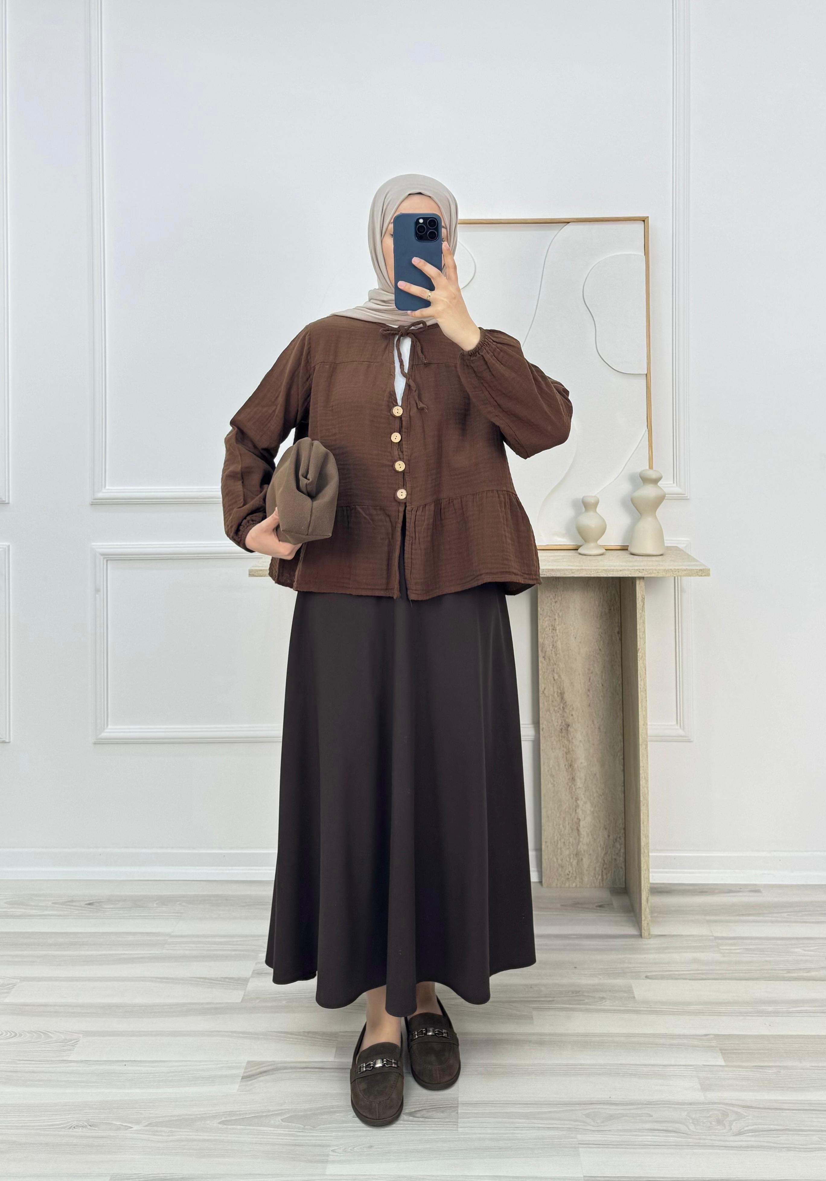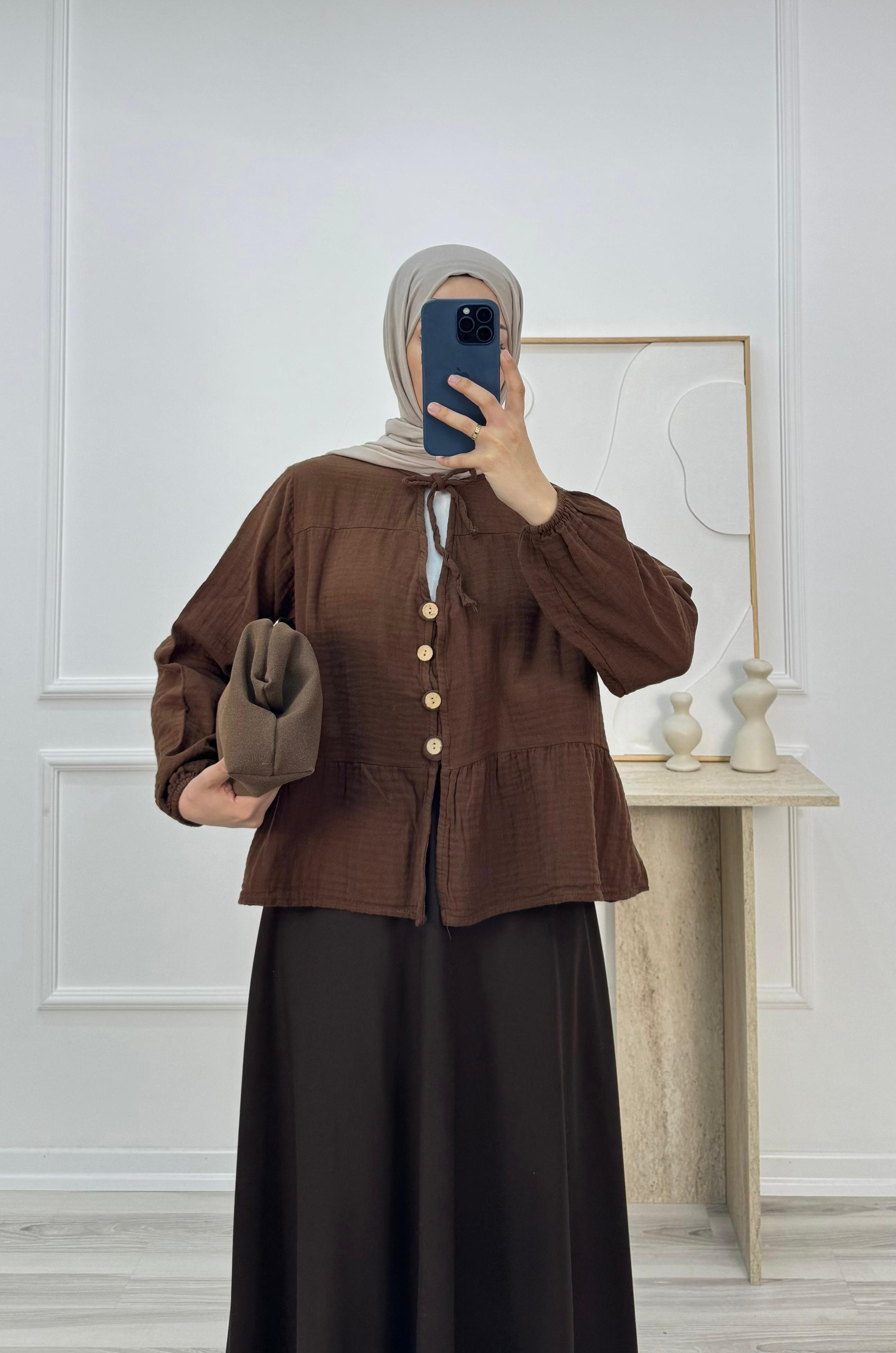 4249-müslin kumaş bağlama detaylı düğmeli bluz-acı kahve (4249)