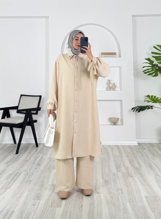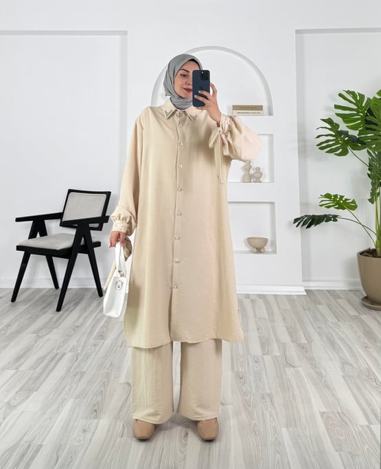 yaka ve kol ucu boncuk detaylı pantolonlu takım