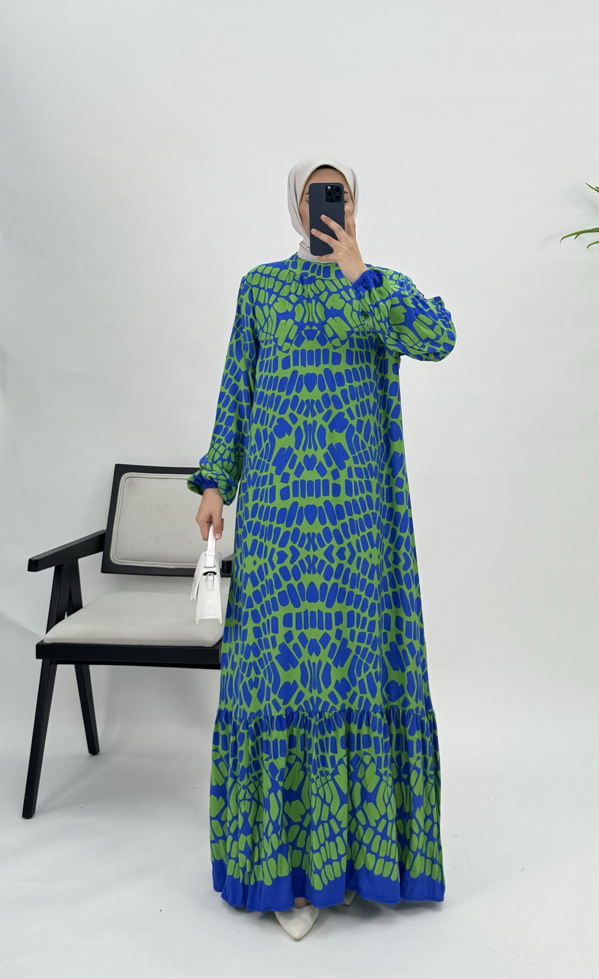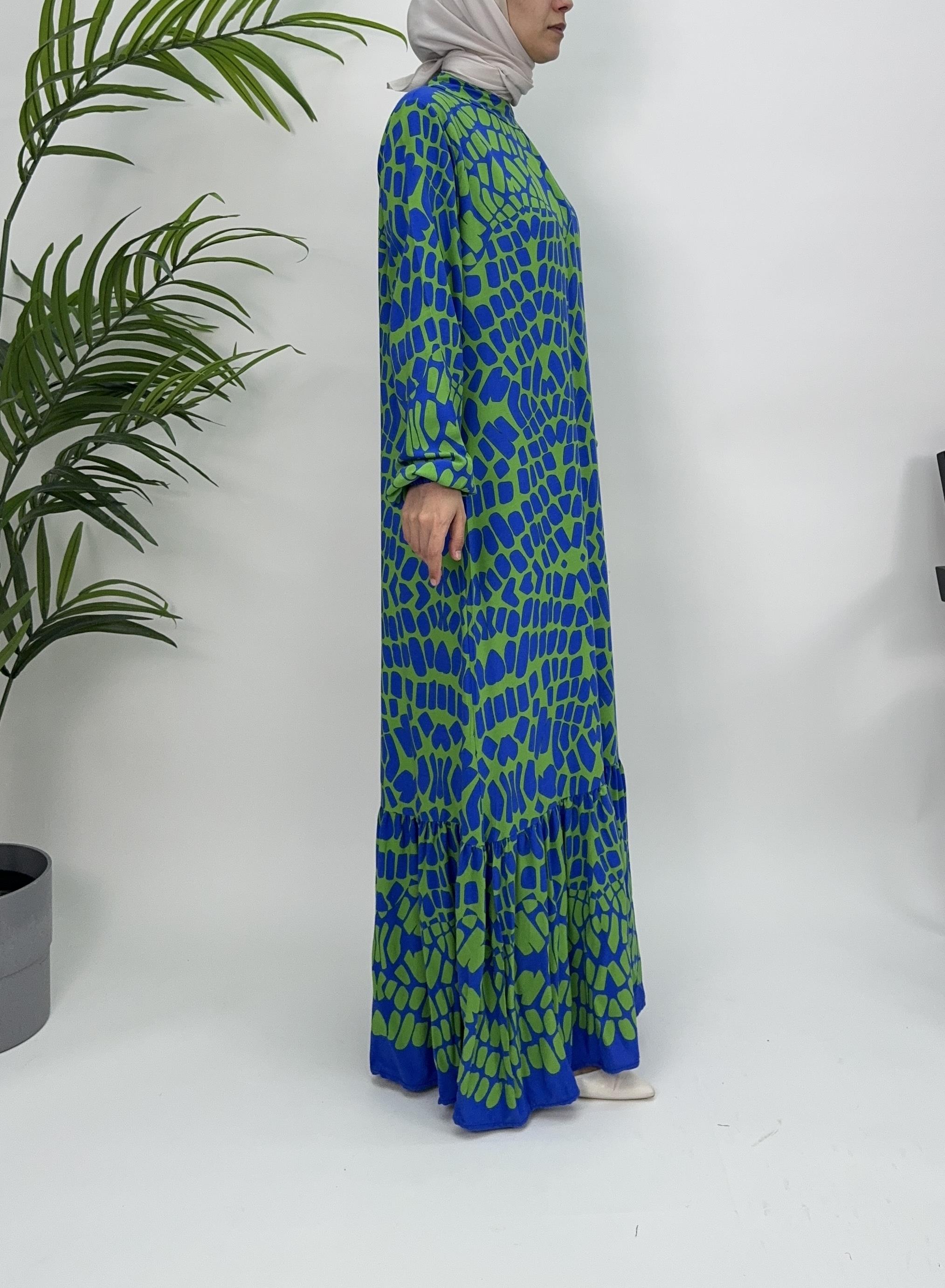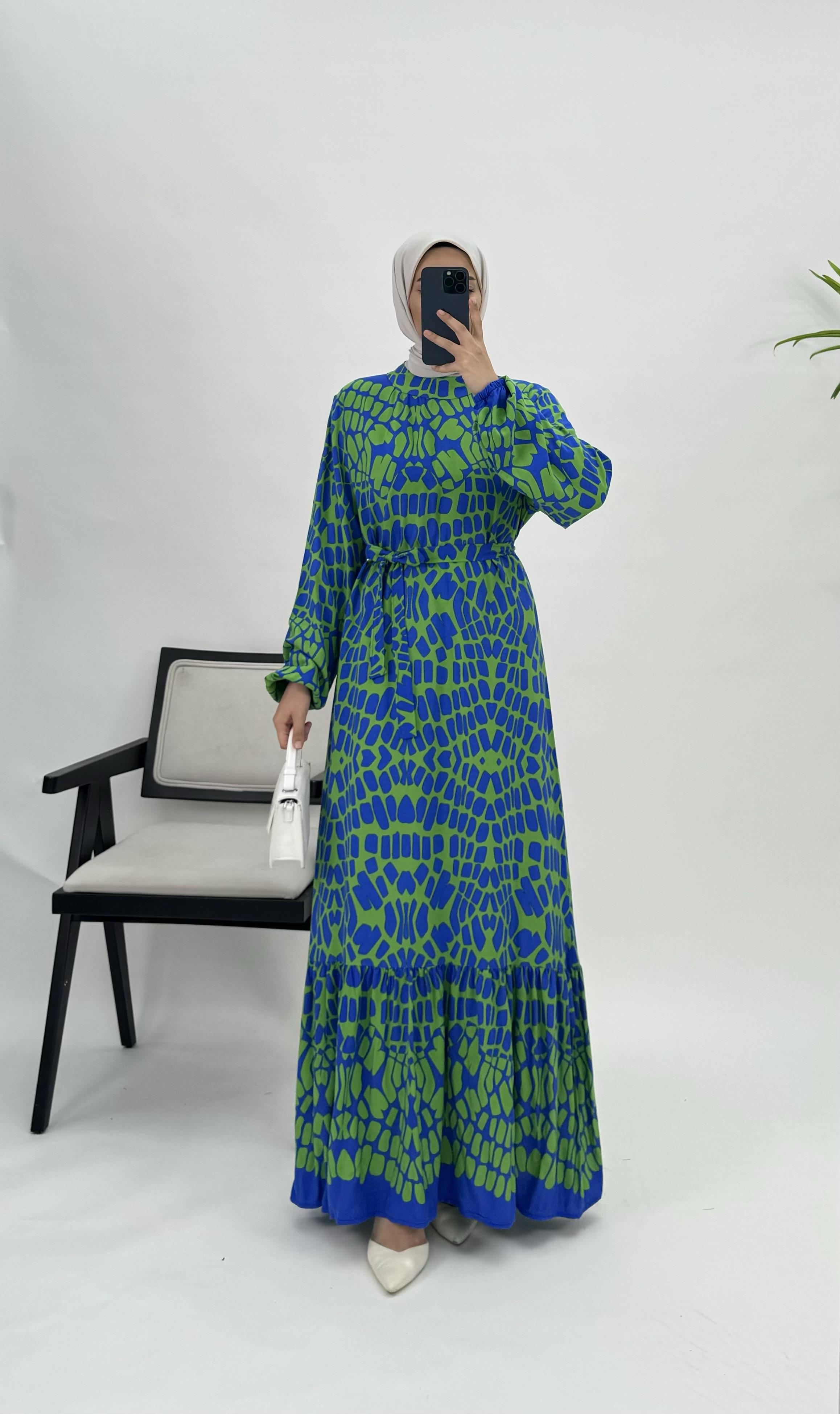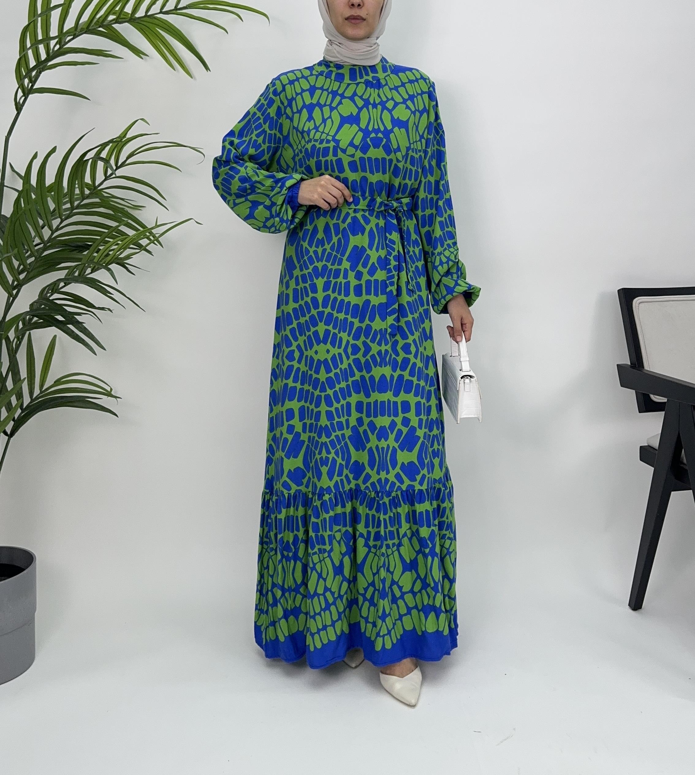 4400-pamuk viskon kumaş-seyyar kuşaklı kol ucu lastikli elbise--yeşil-mavi (4400)