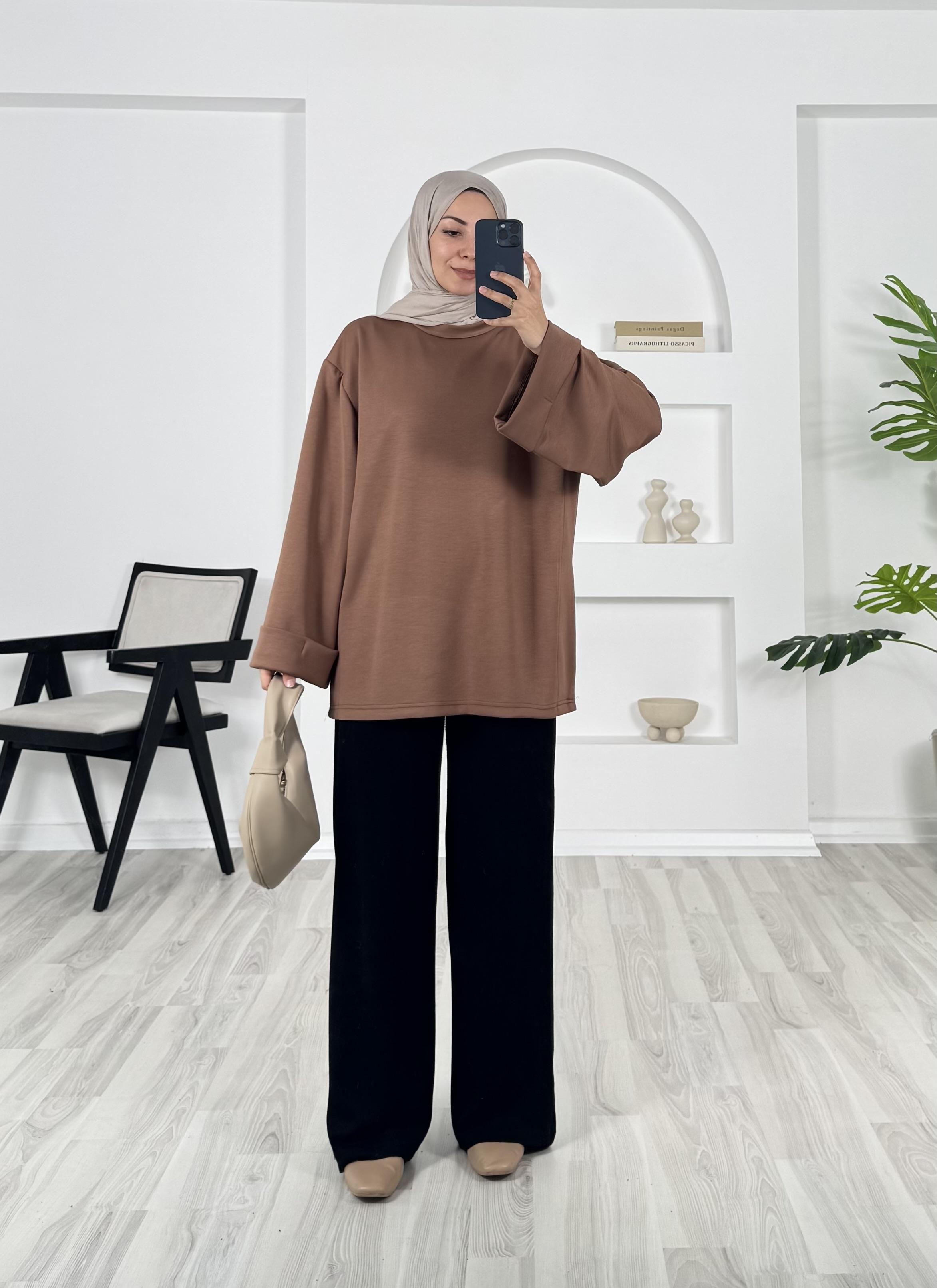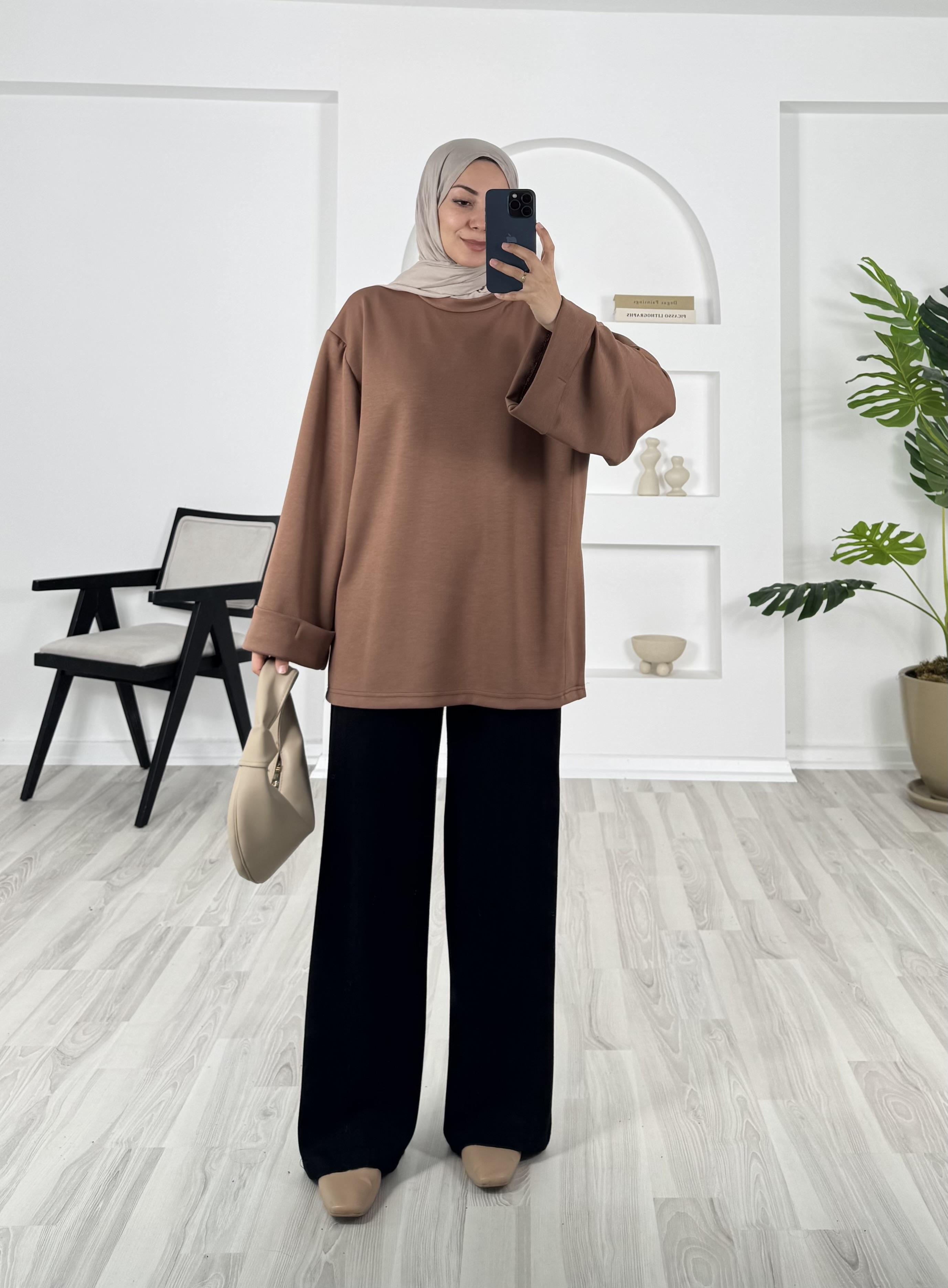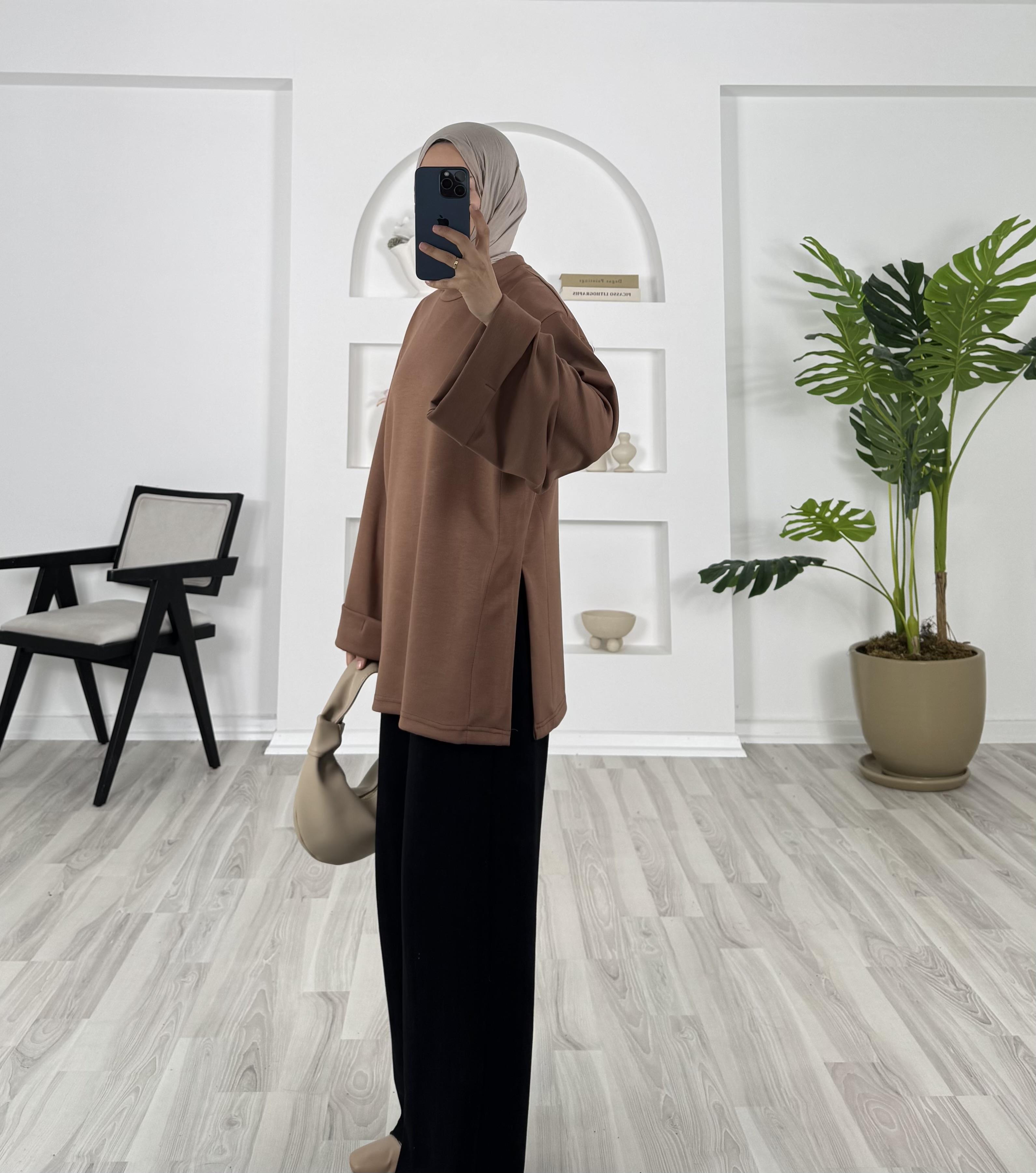 4421-oysho kumaş-kolları katlama detaylı yanları yırtmaçlı tunik-kahverengi (4421)