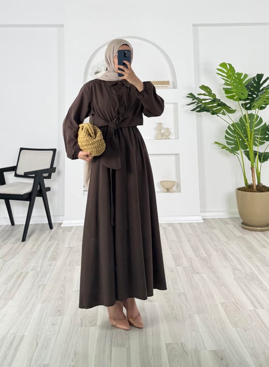 4570 - terikoton kumaş önü baglama detaylı elbise - acı kahve (4570)