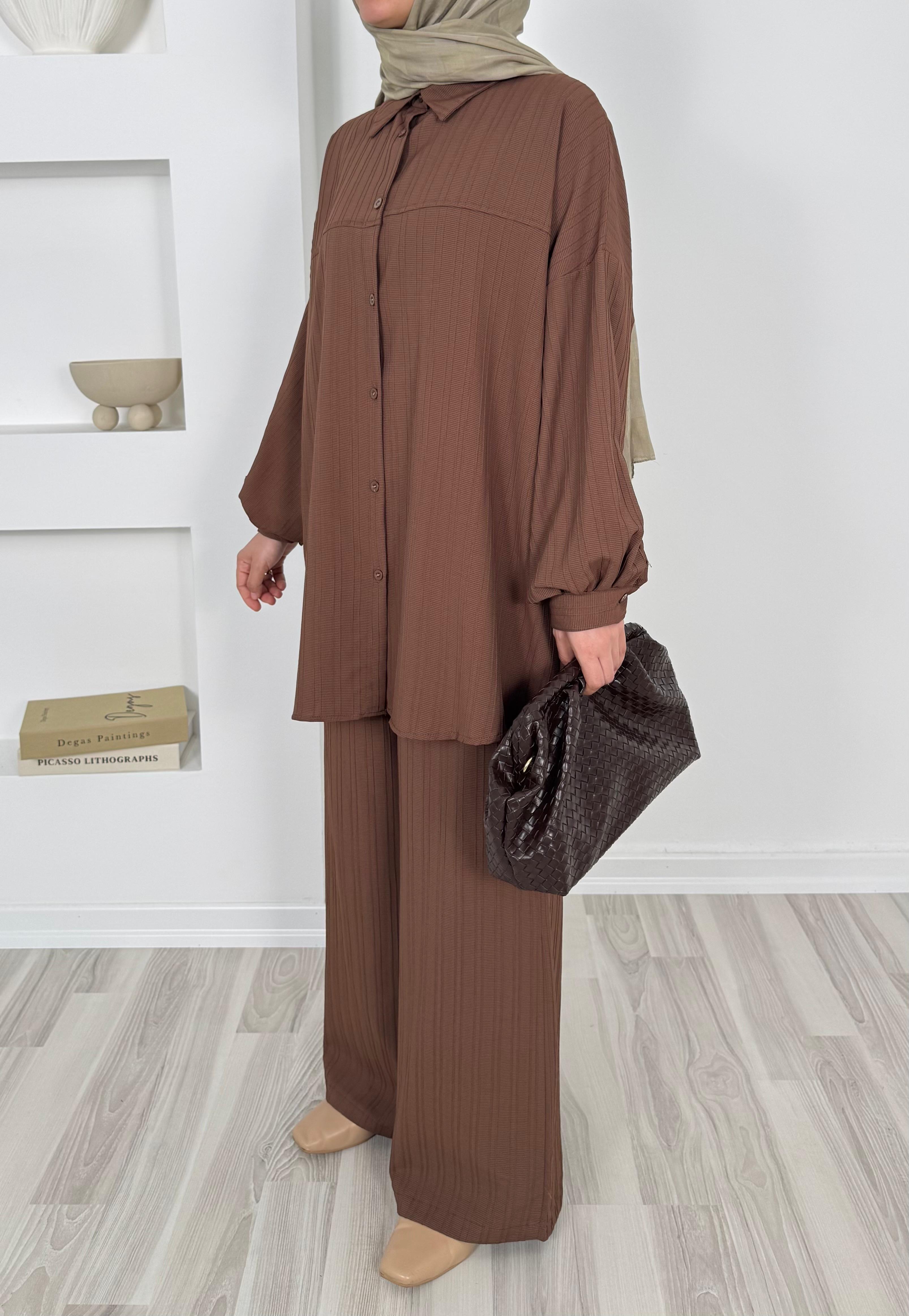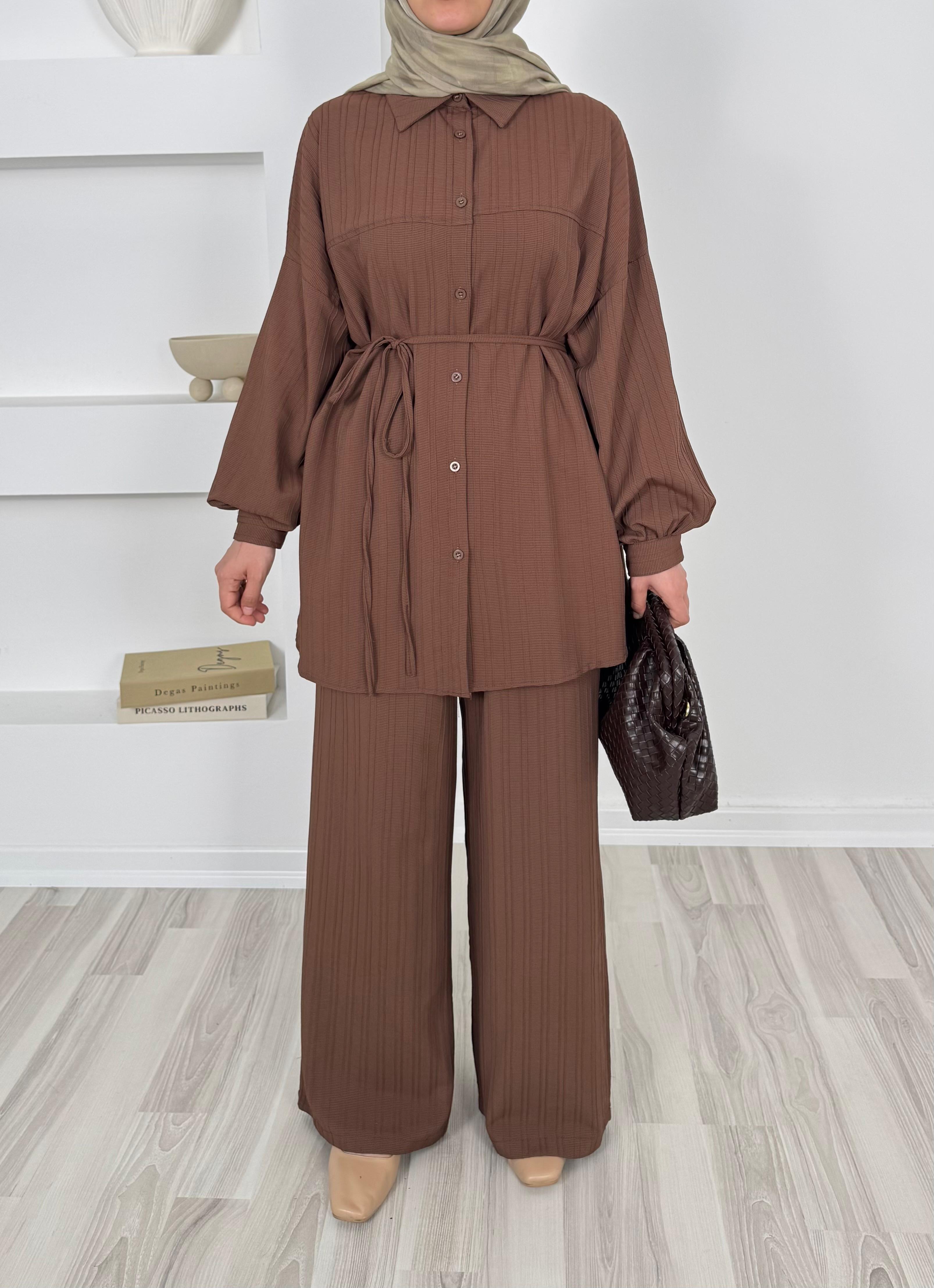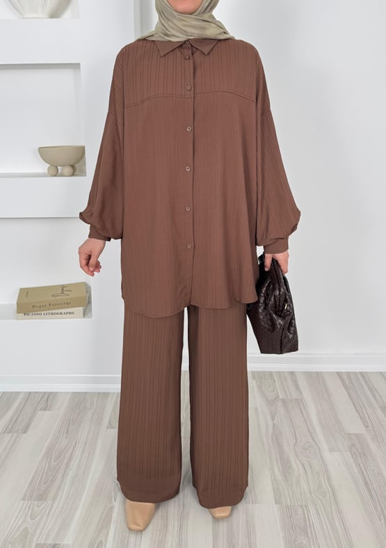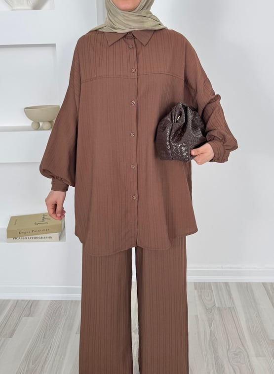 4586-dubai kumaş-önü pervazlı biyeli pantolonlu takım-acı kahve (4586)