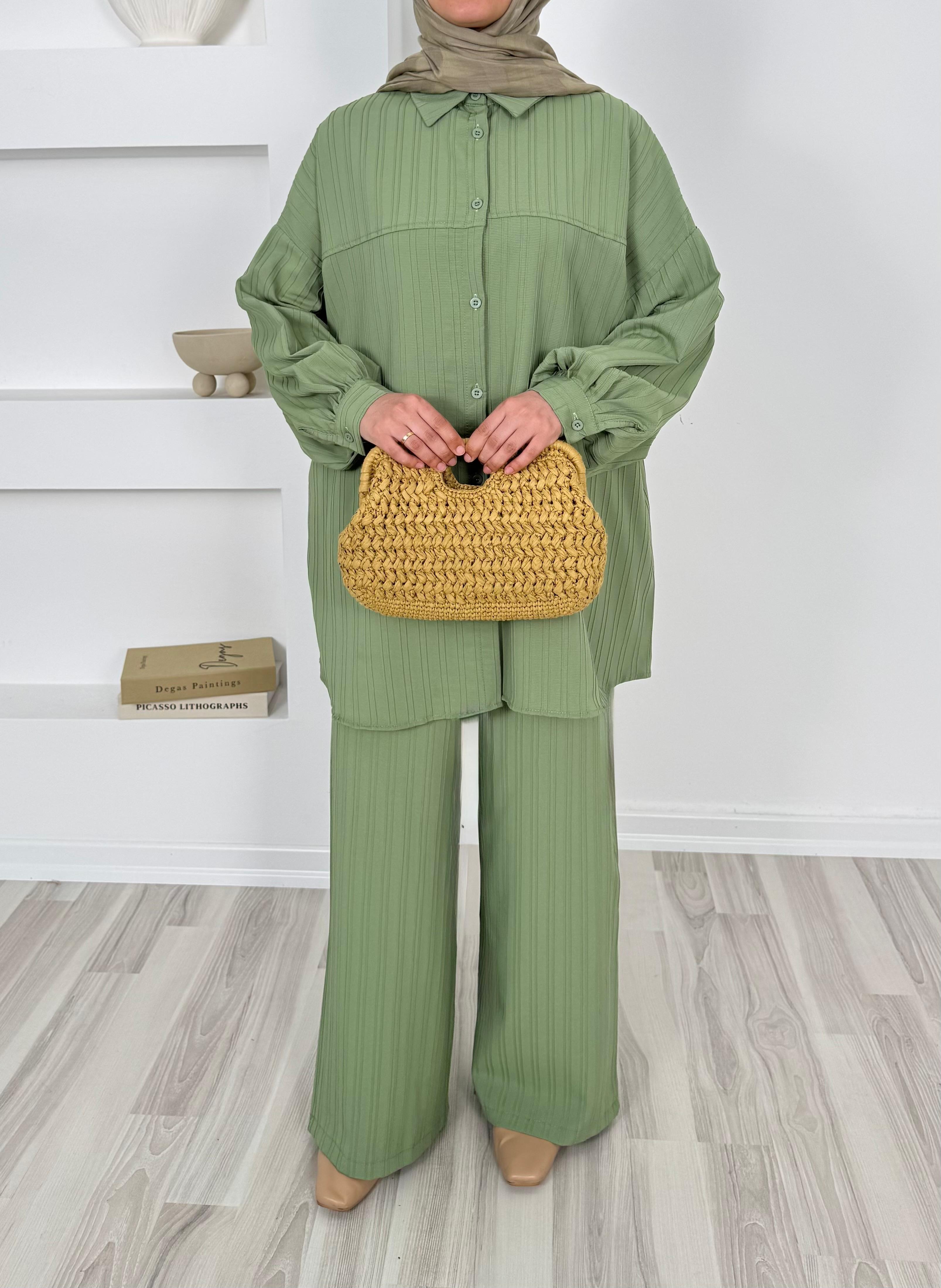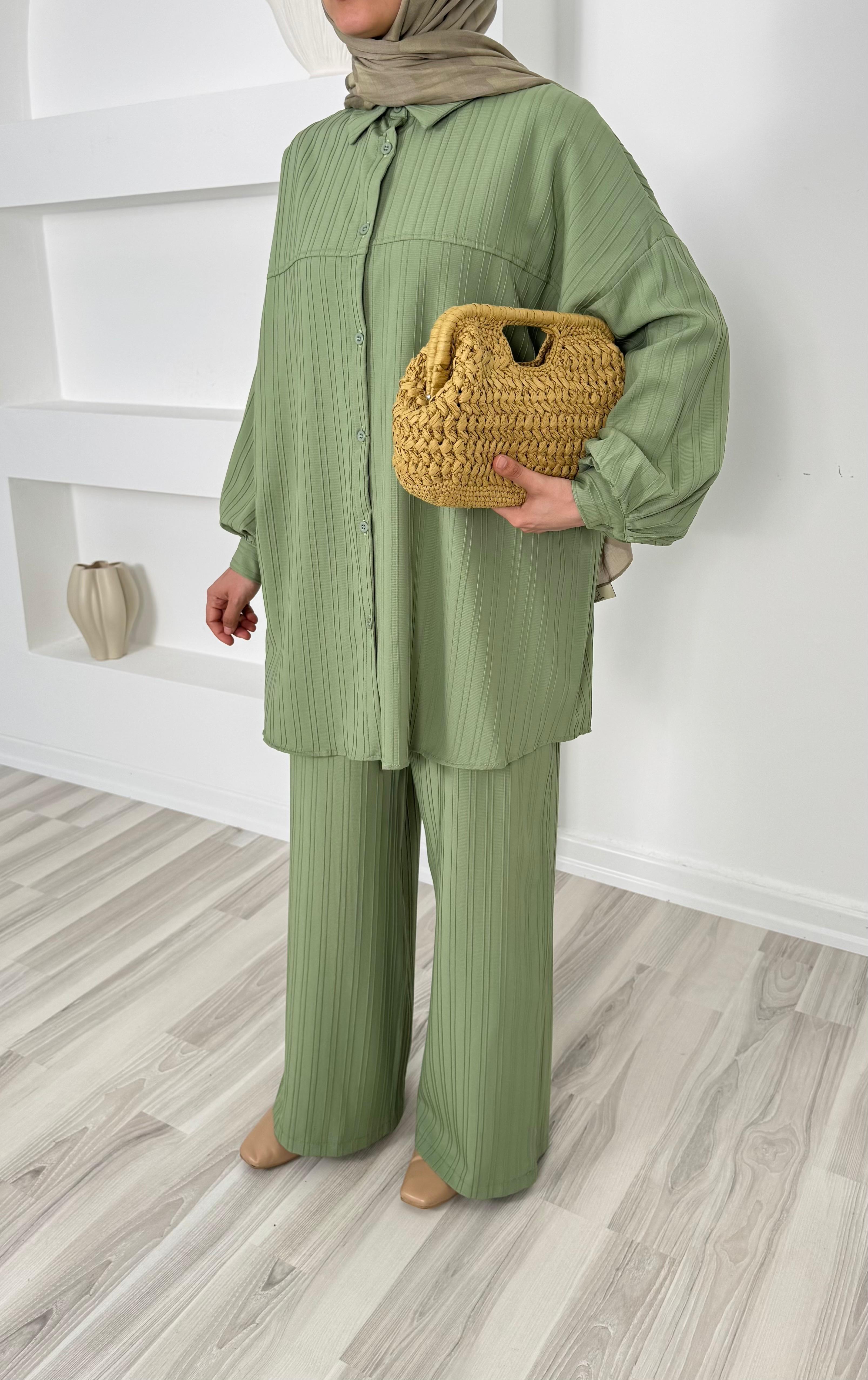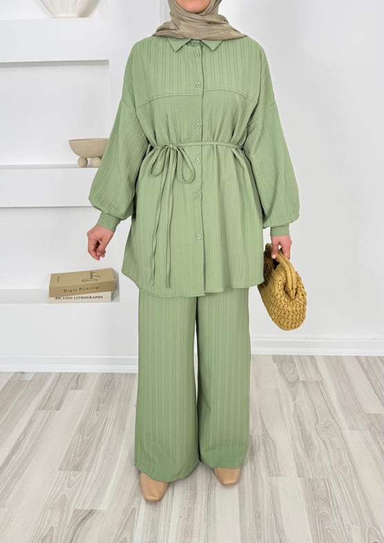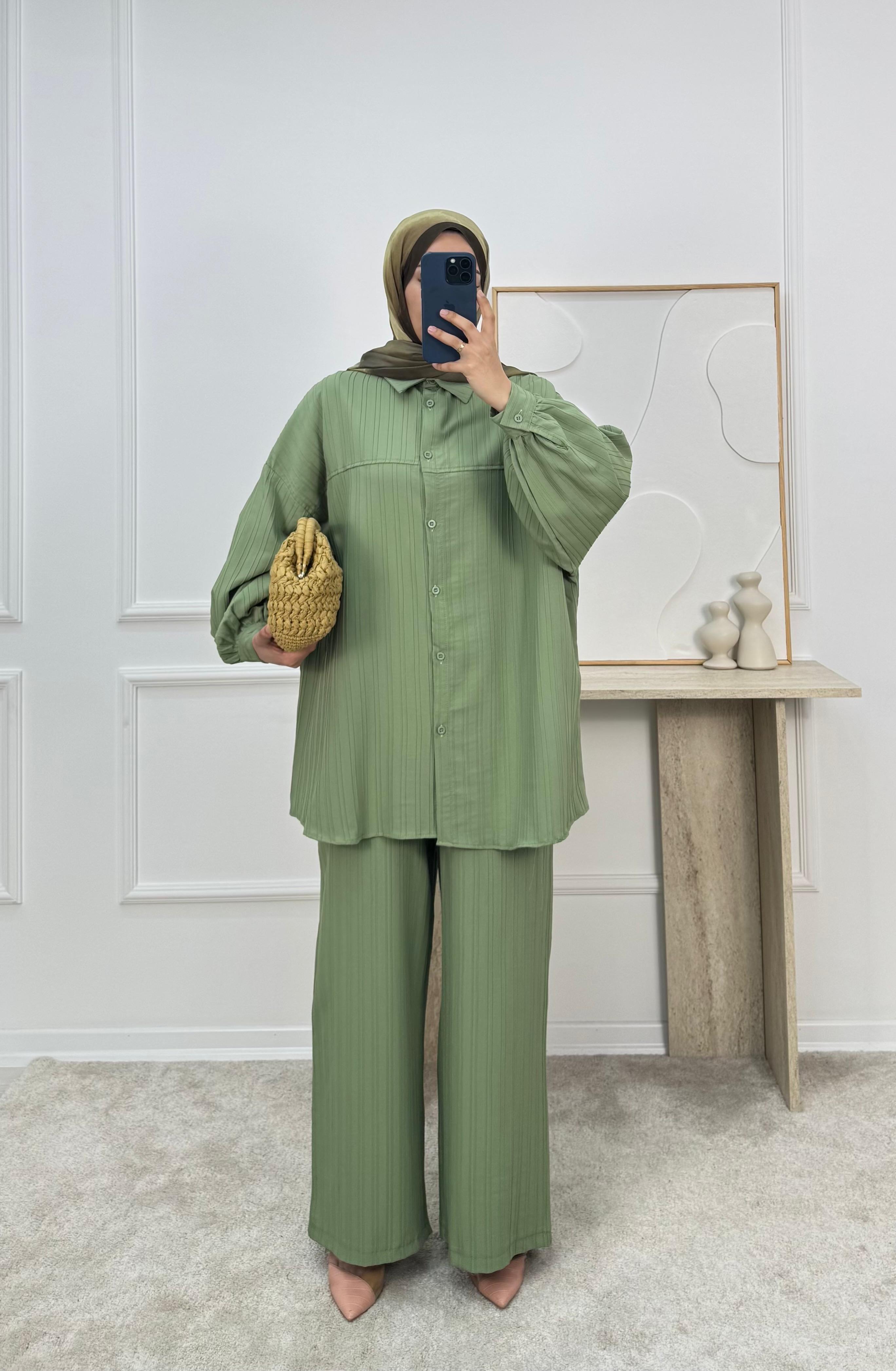 4586-dubai kumaş-önü pervazlı biyeli pantolonlu takım-yeşil (4586)