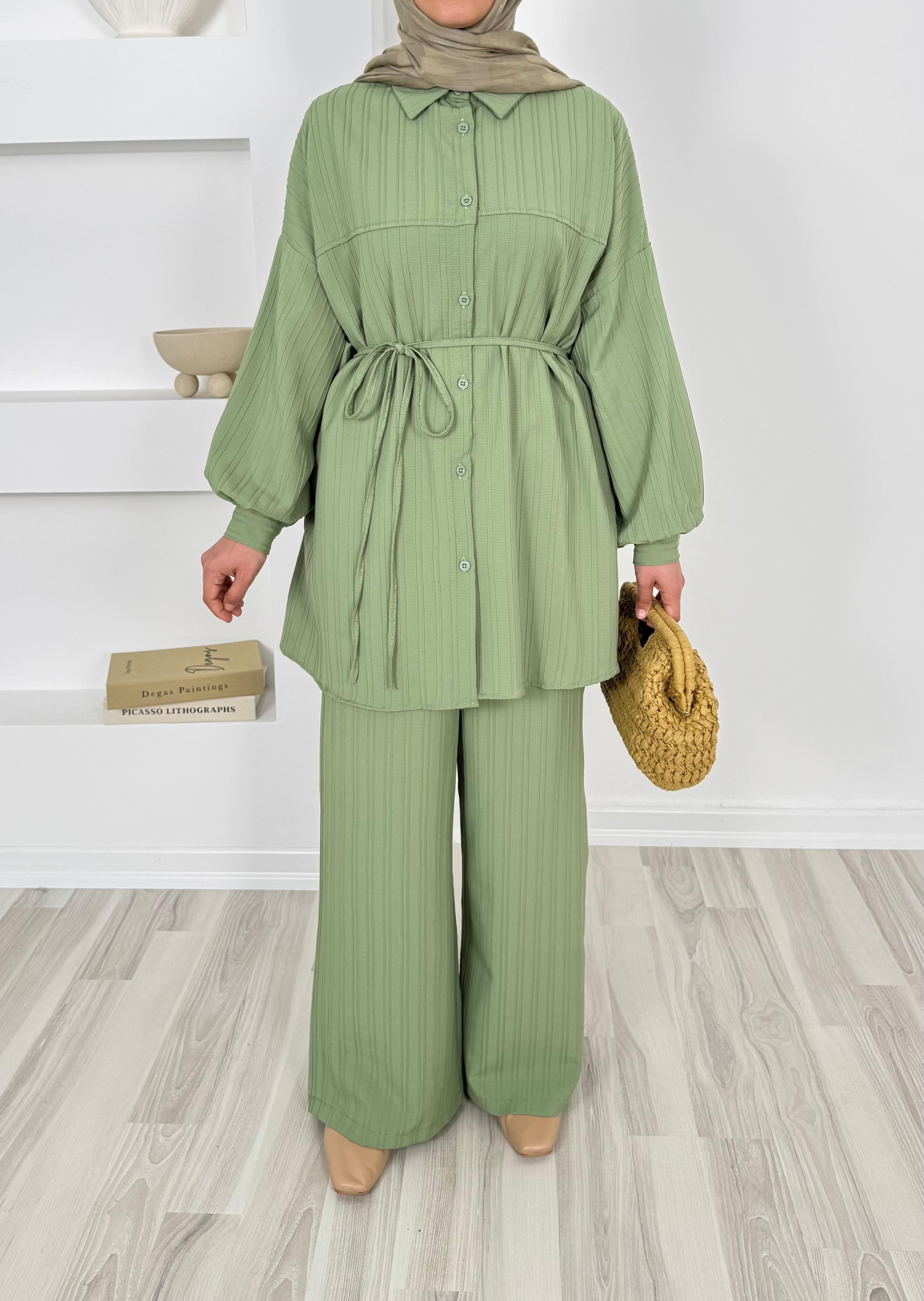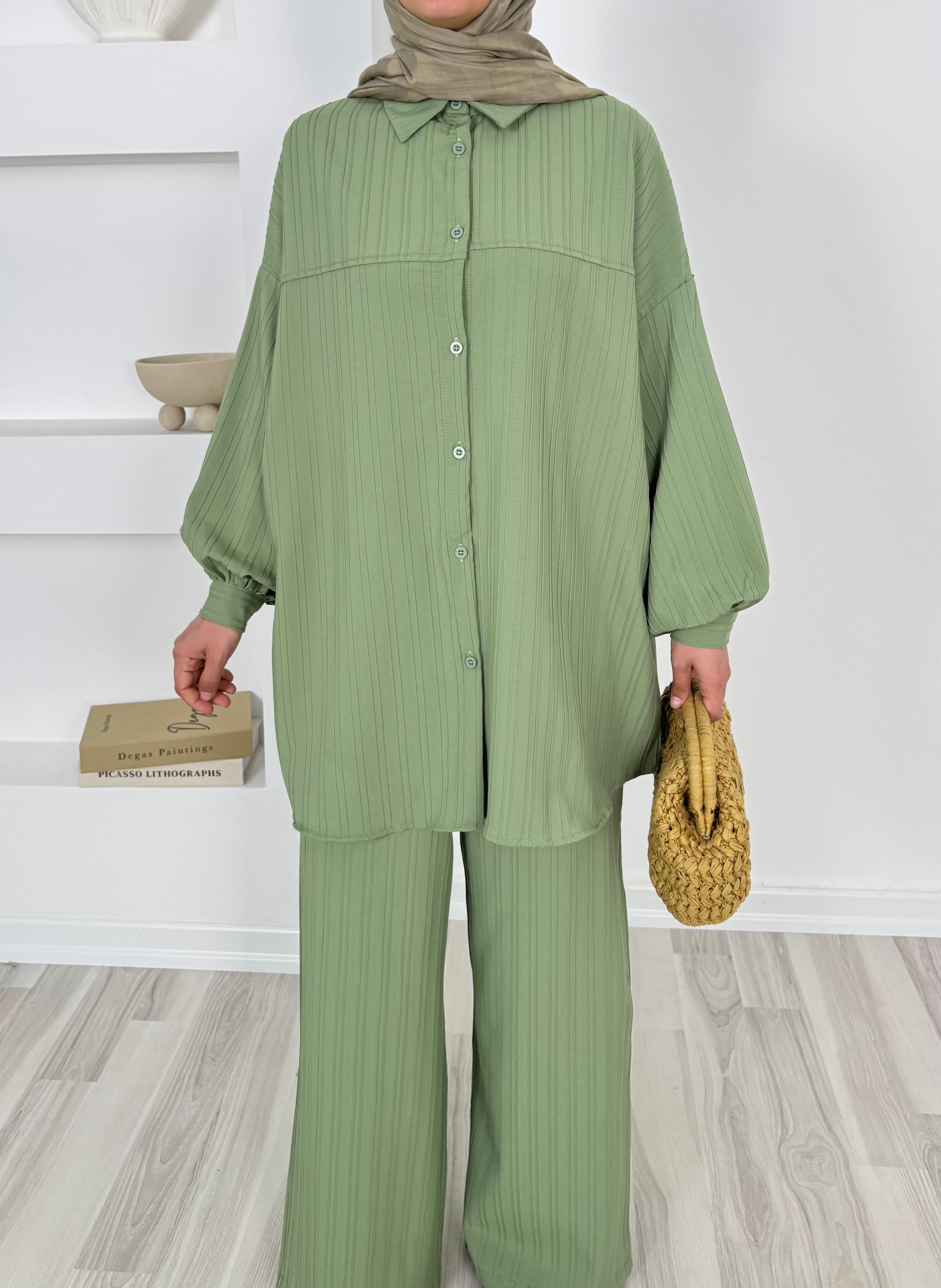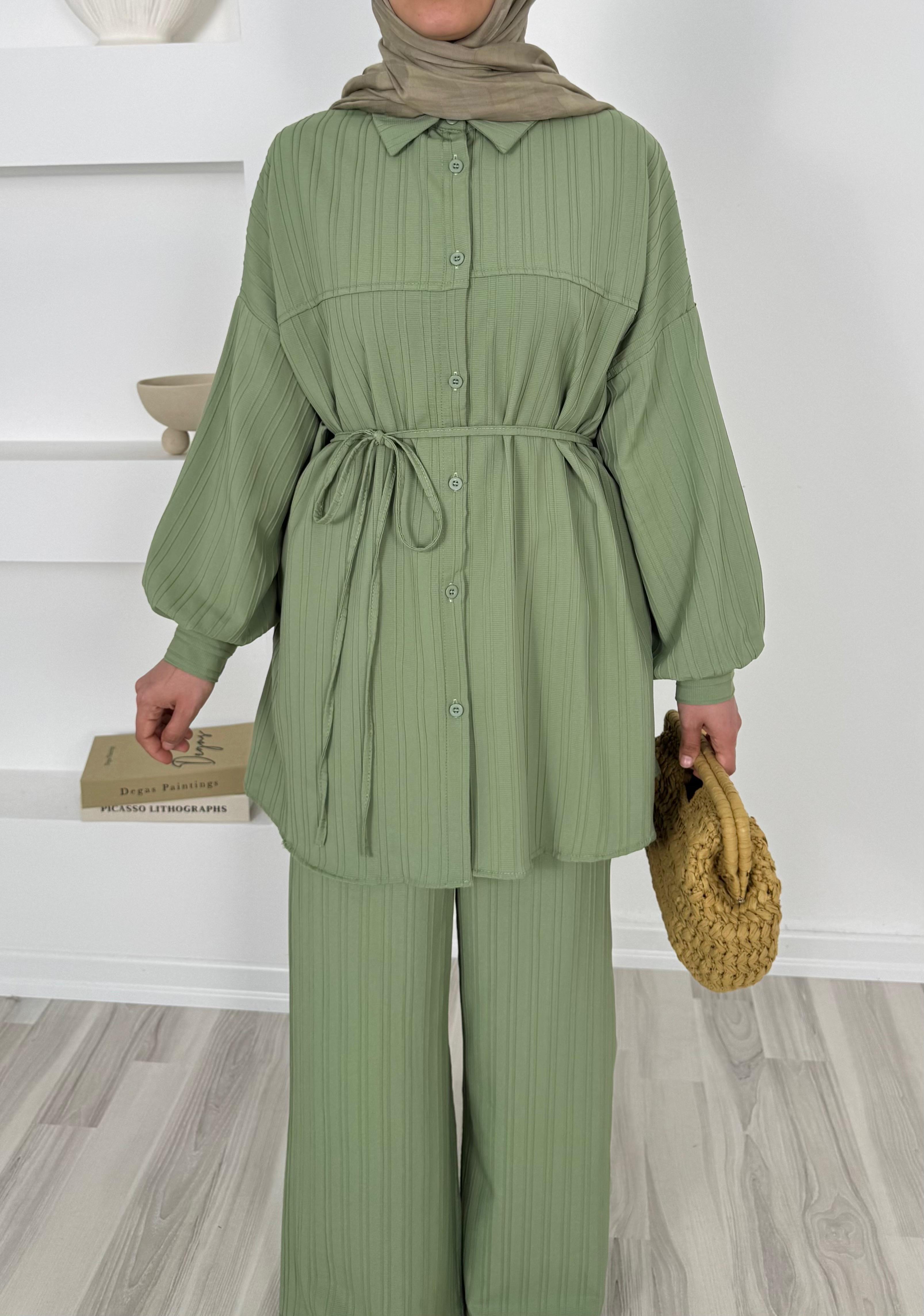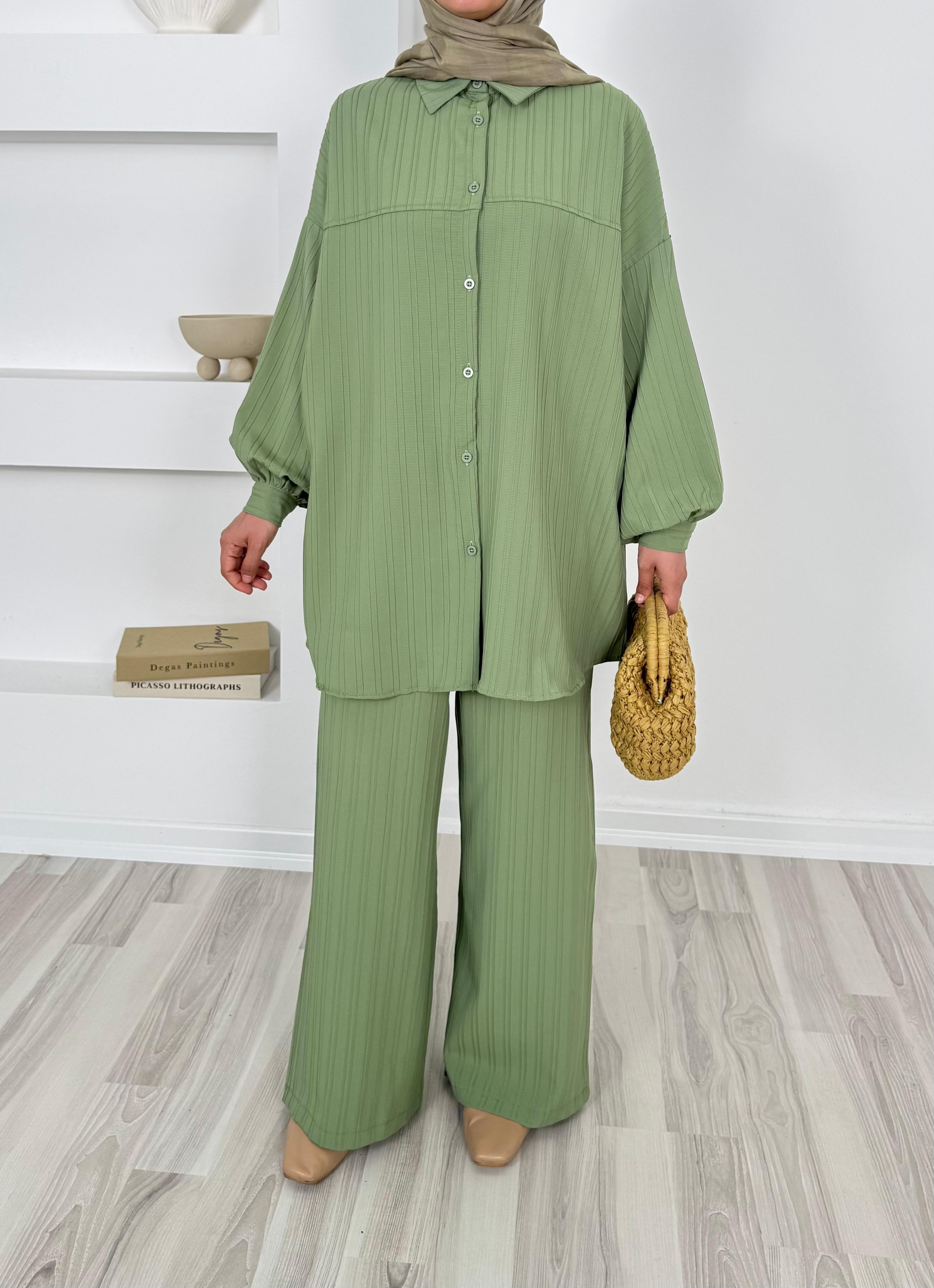 4586-dubai kumaş-önü pervazlı biyeli pantolonlu takım-yeşil (4586)