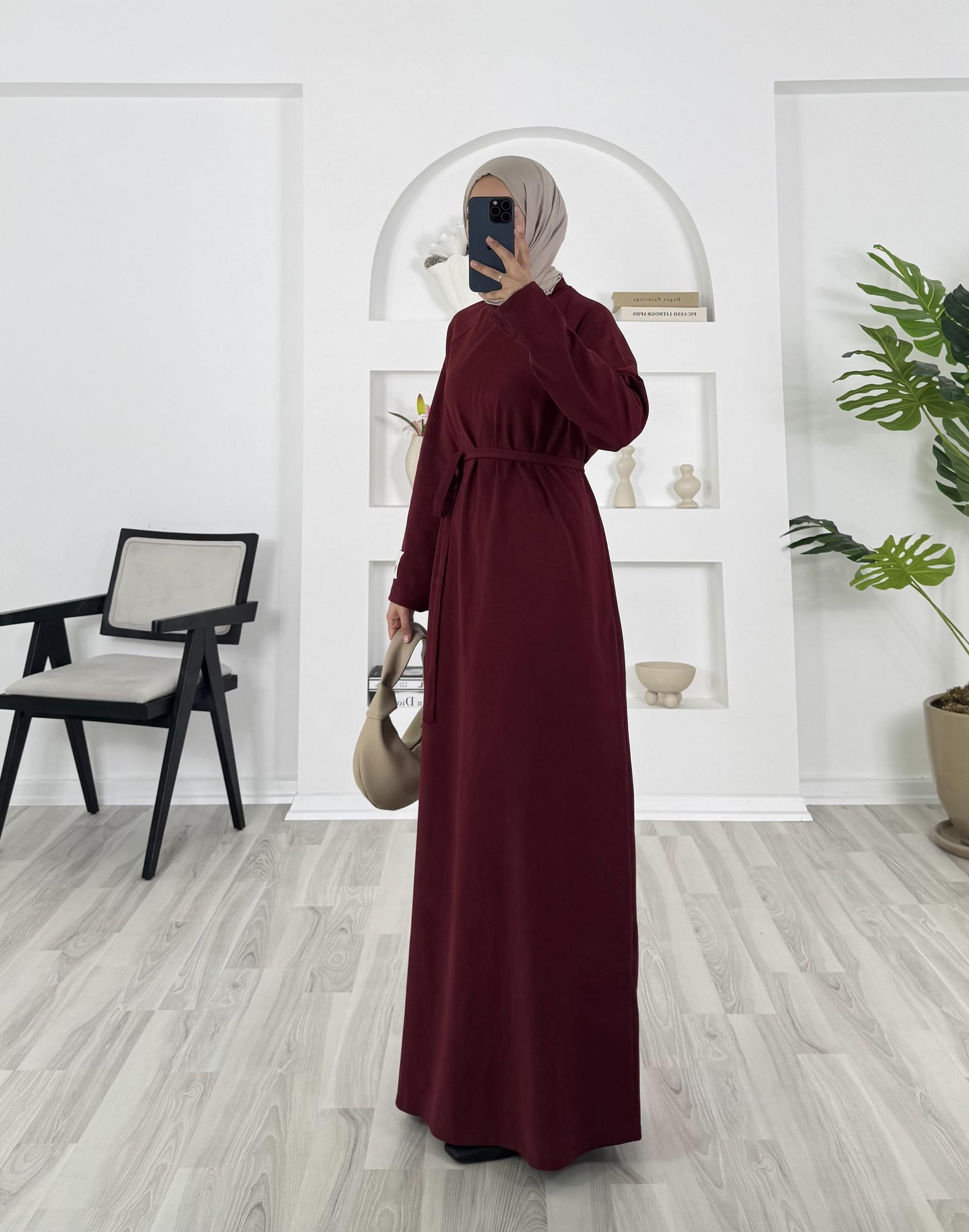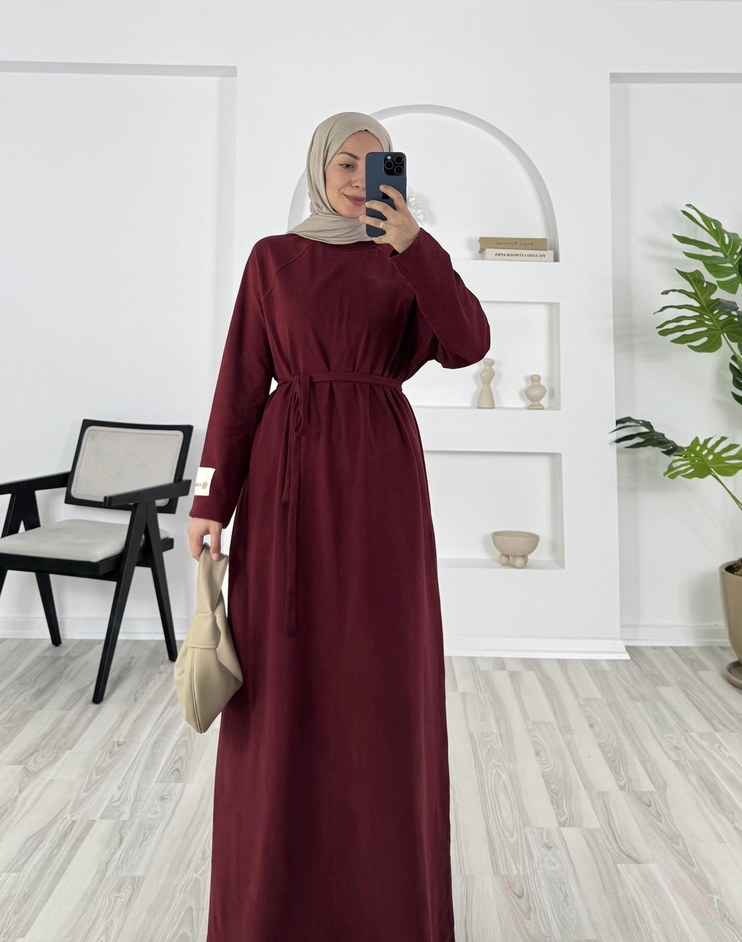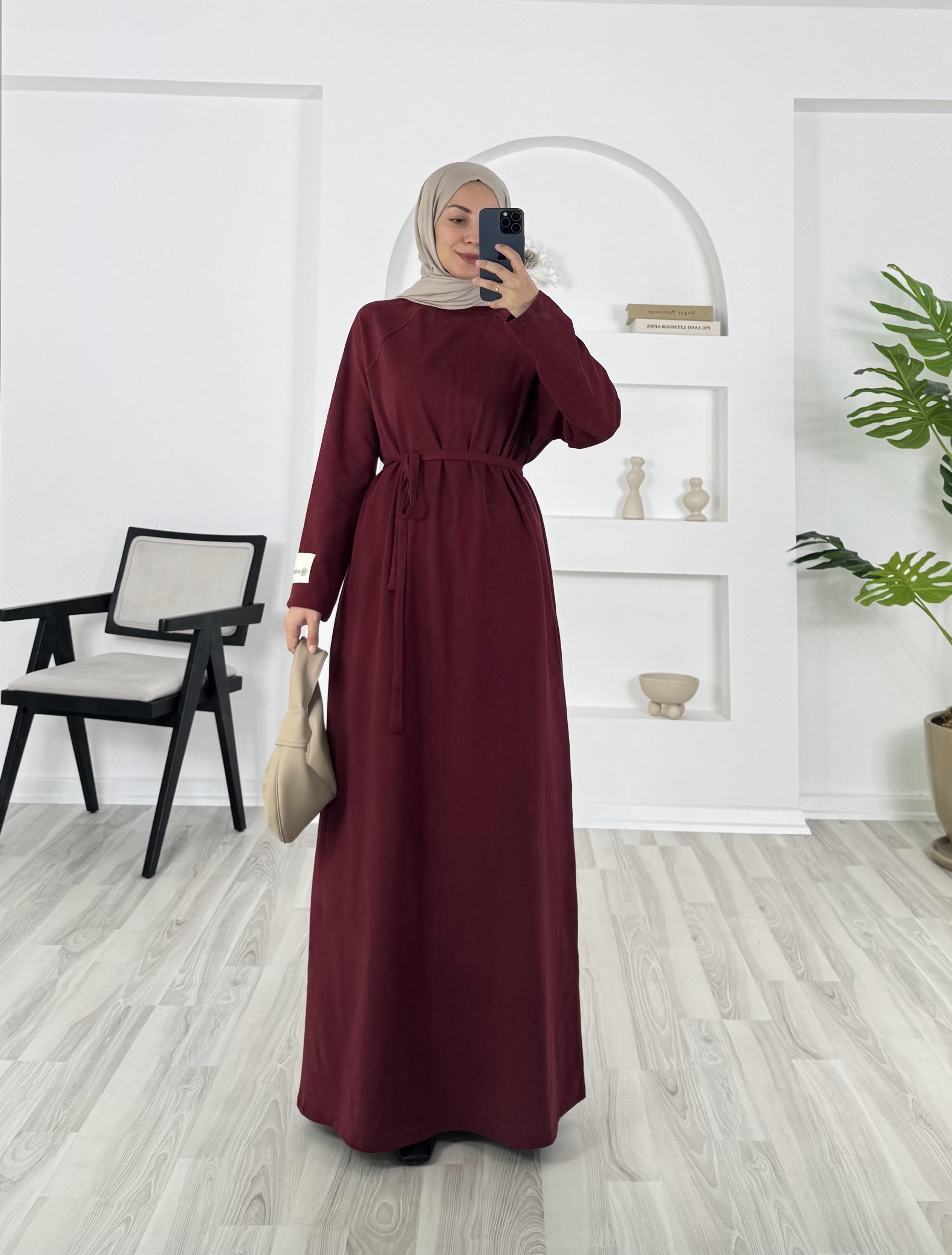 4632 - süprem kumaş kuşaklı elbise - bordo (4632)