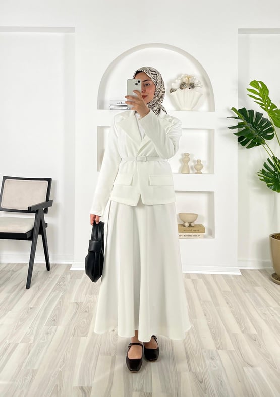 4637-dabıl krep kumaş-süs cep detaylı kemerli etekli takım-beyaz (4637)