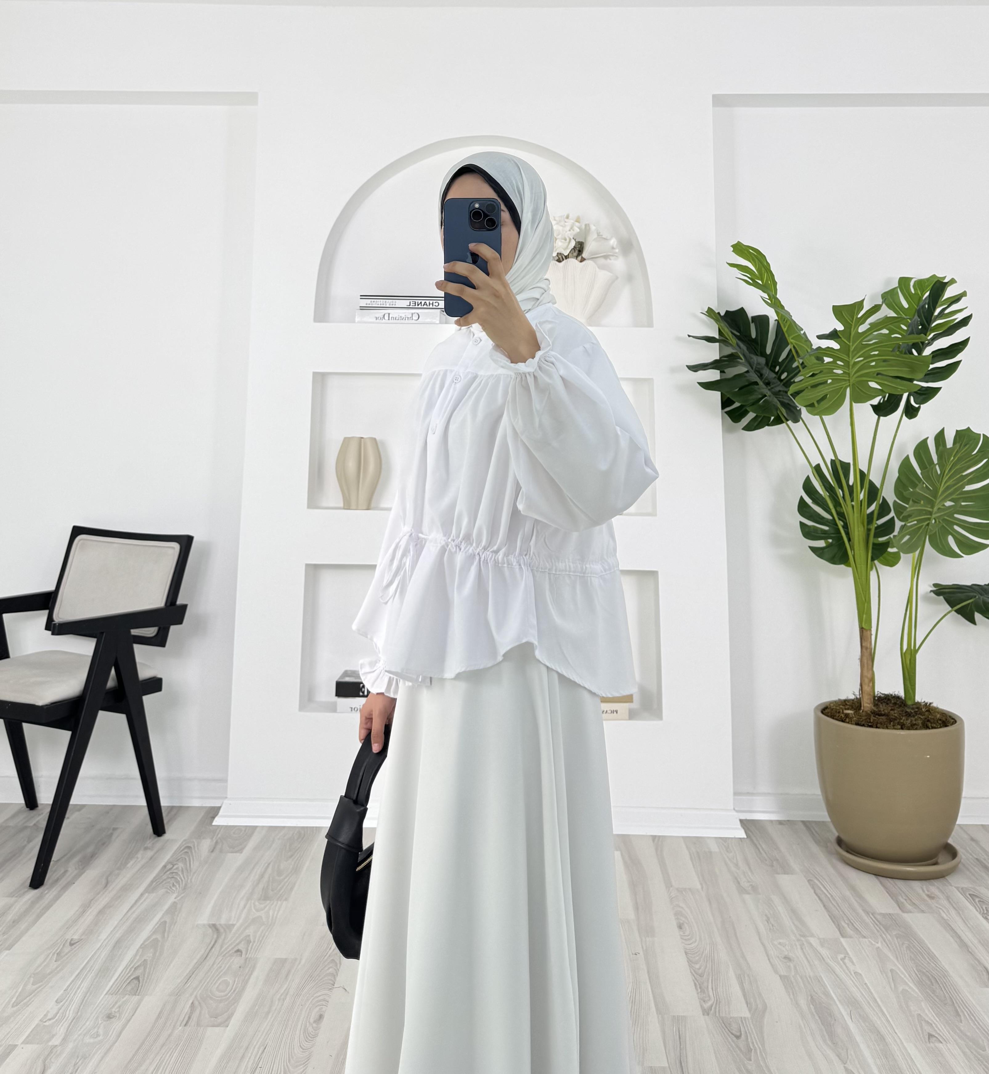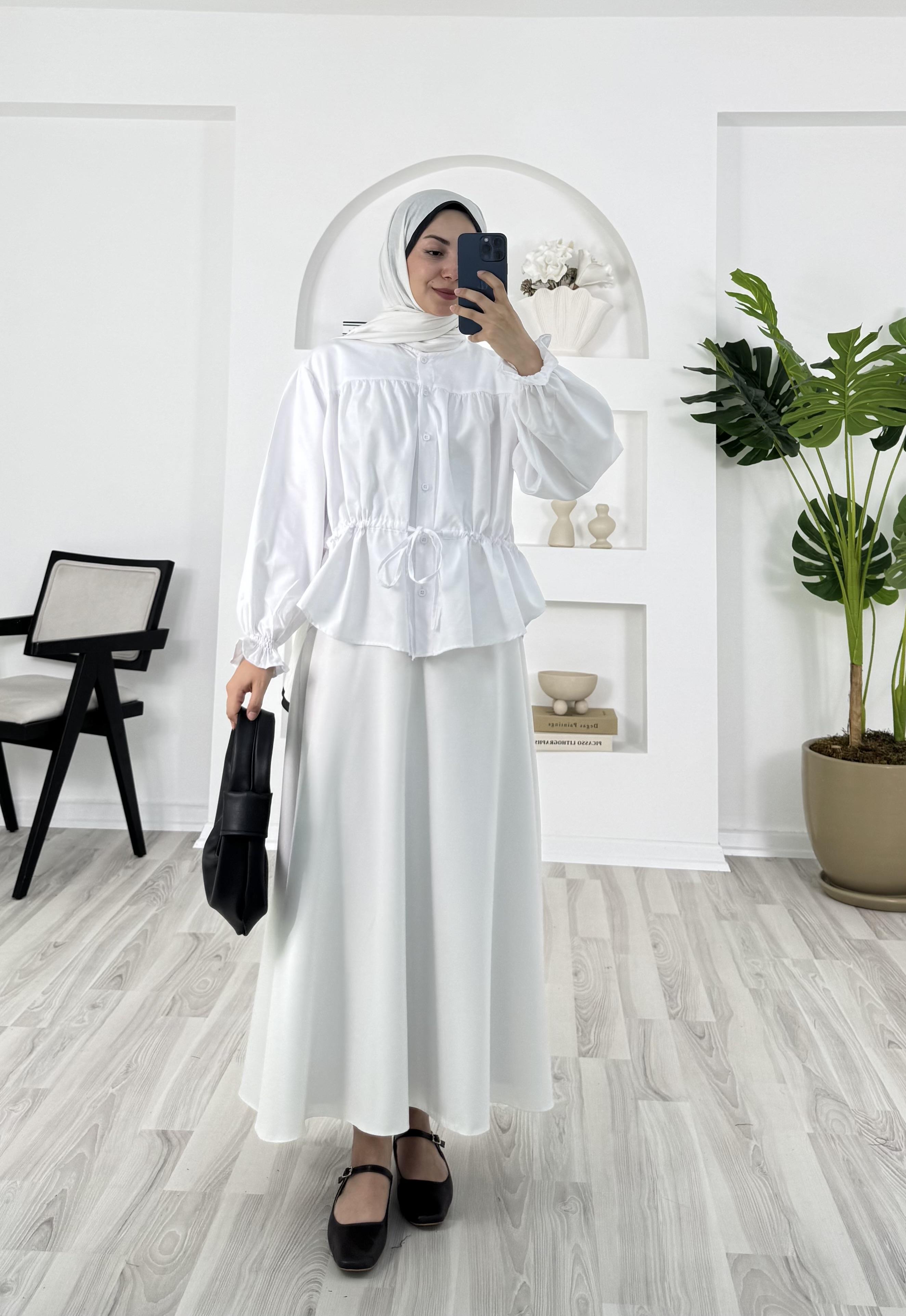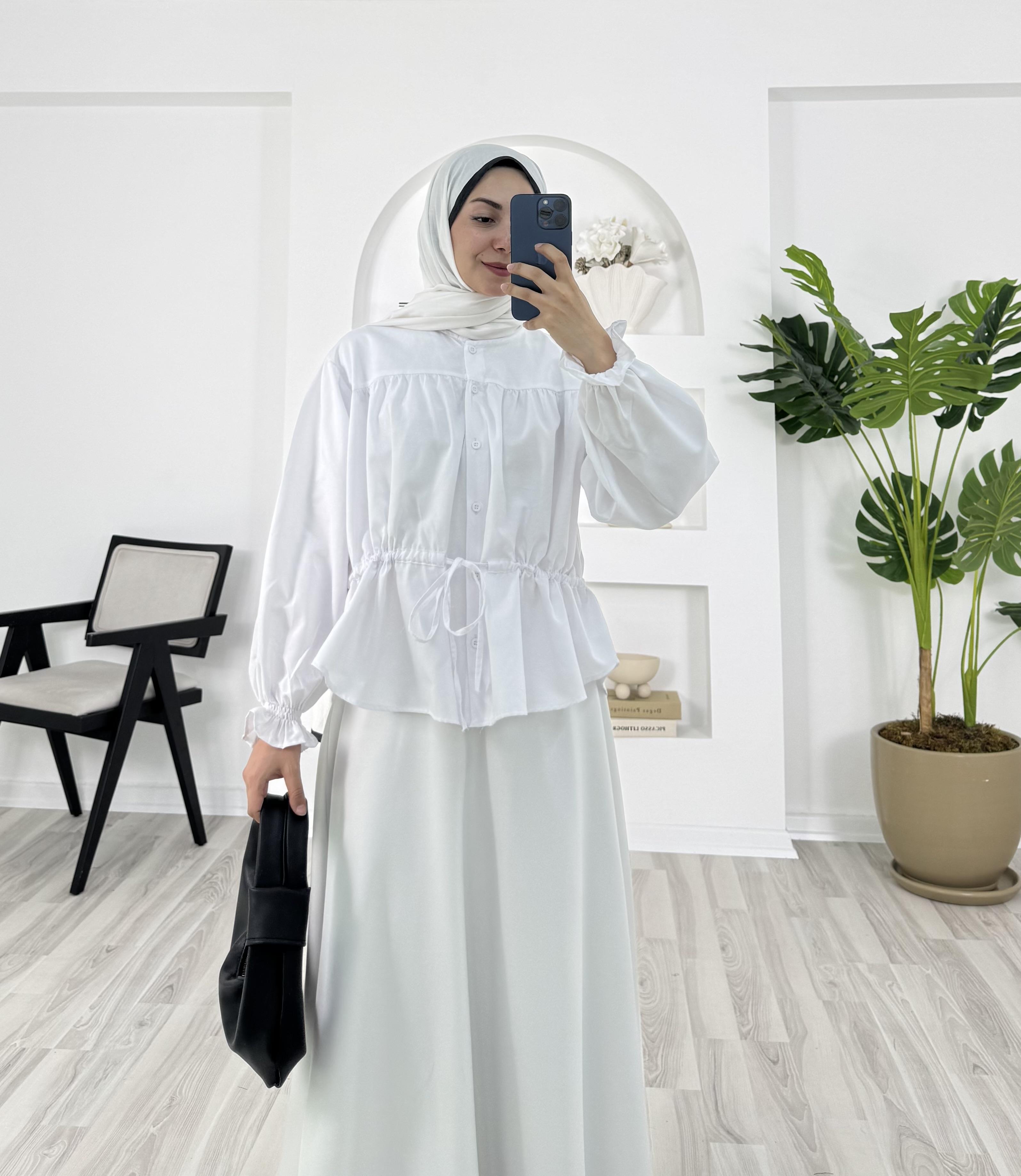 4858-terikoton kumaş-bilek ucu lastikli belden büzülebilir etek üstü gömlek-beyaz (4858)