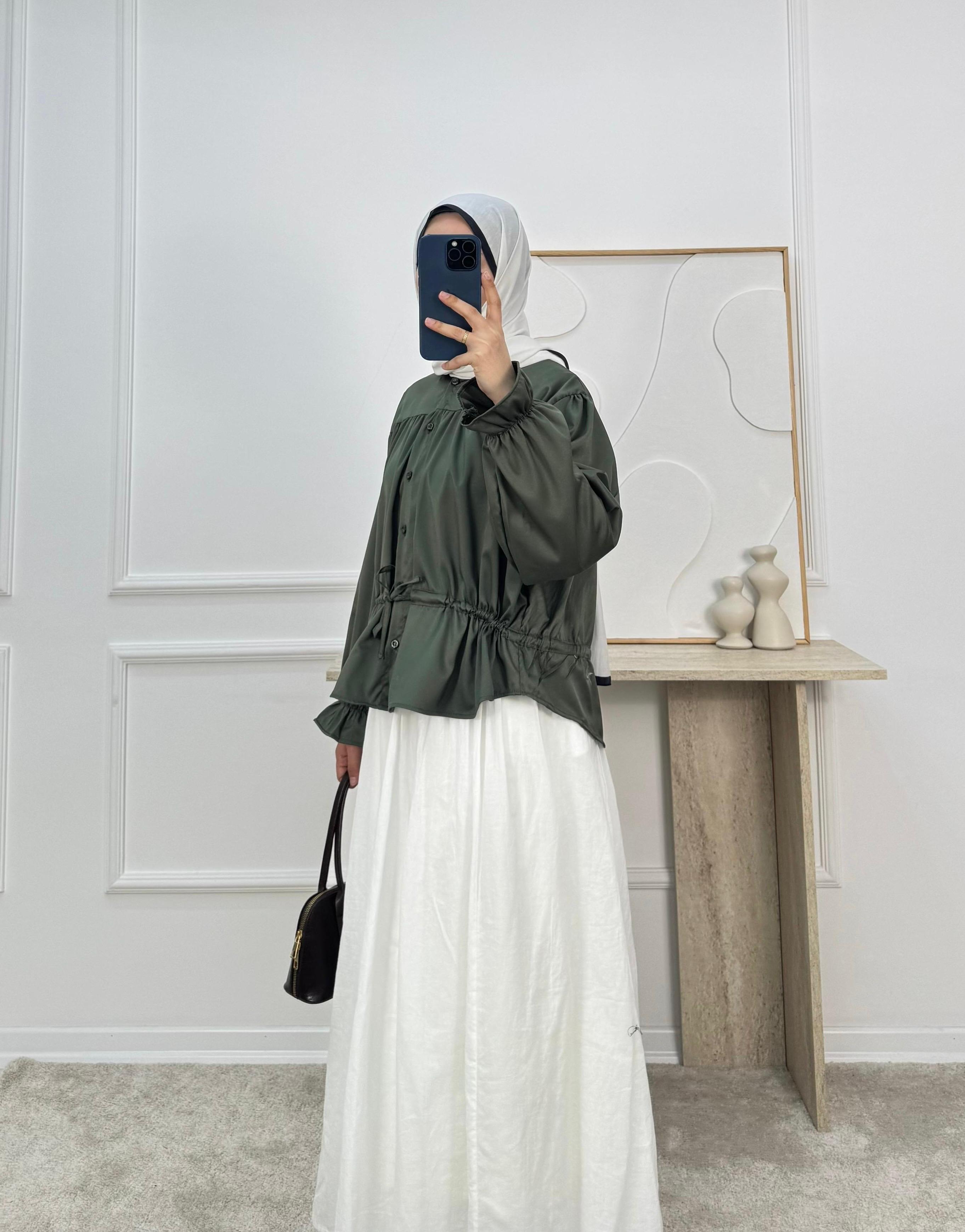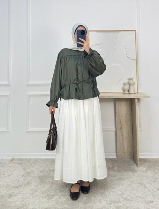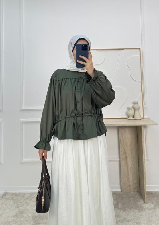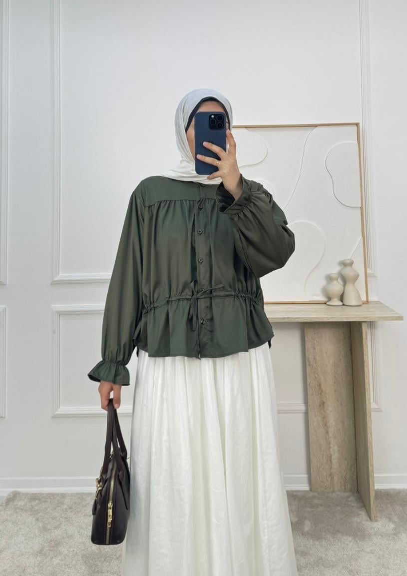 4858-terikoton kumaş-bilek ucu lastikli belden büzülebilir etek üstü gömlek-yeşil (4858)