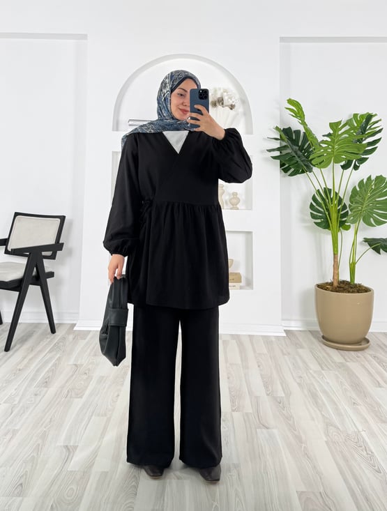 5128-çilek kumaş-altı pile detaylı pantolonlu takım-siyah (5128)