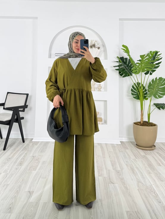 5128-çilek kumaş-altı pile detaylı pantolonlu takım-yağ yeşili (5128)