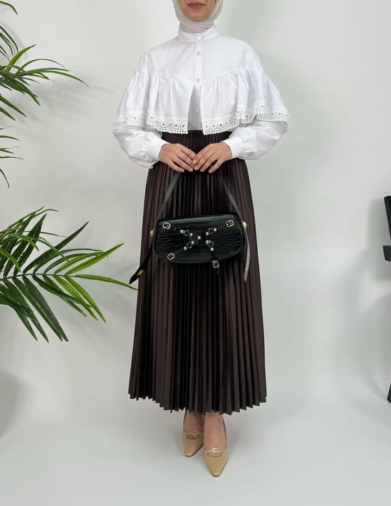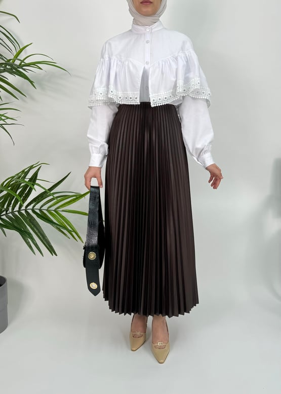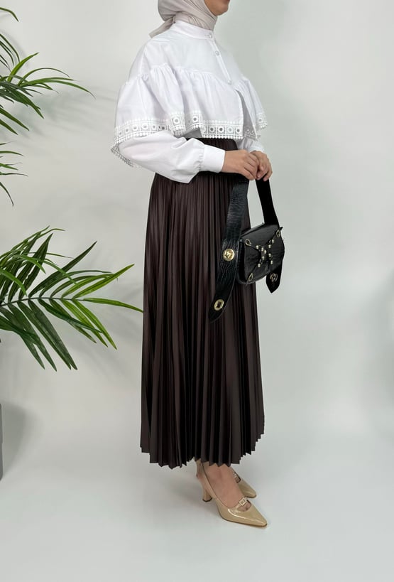 5173-deri görünümlü pliseli etek-acı kahve (5173)