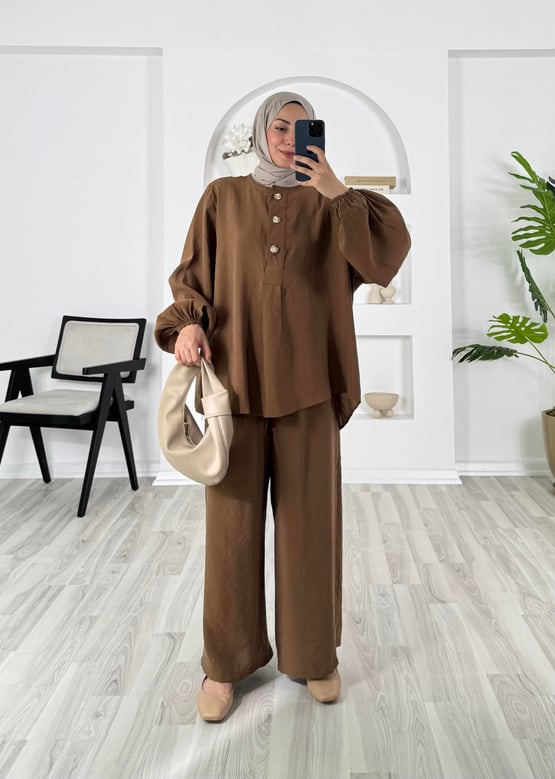 5209-cupra kumaş-balon kollu önü üç düğmeli pantolonlu takım-acı kahve (5209)
