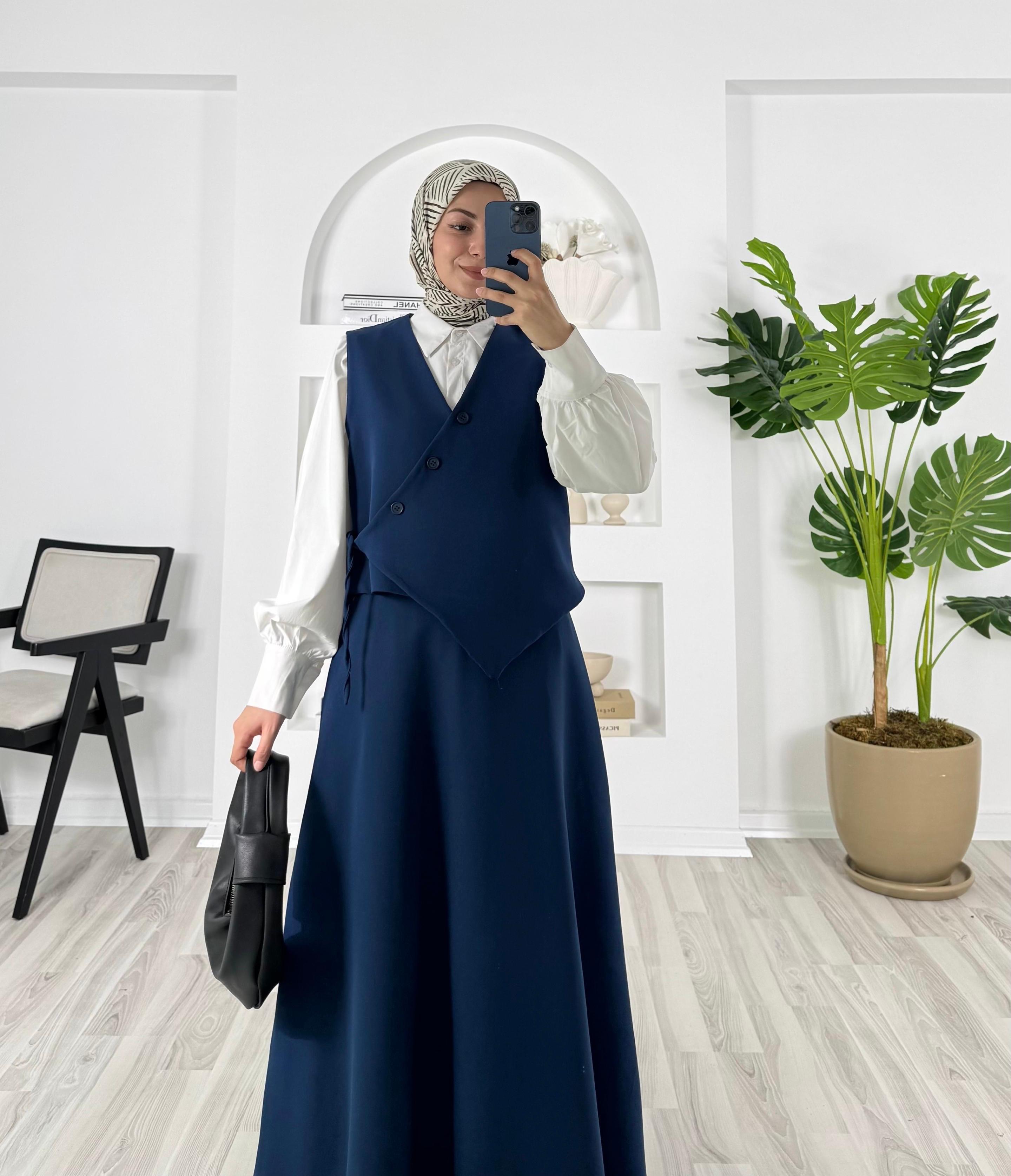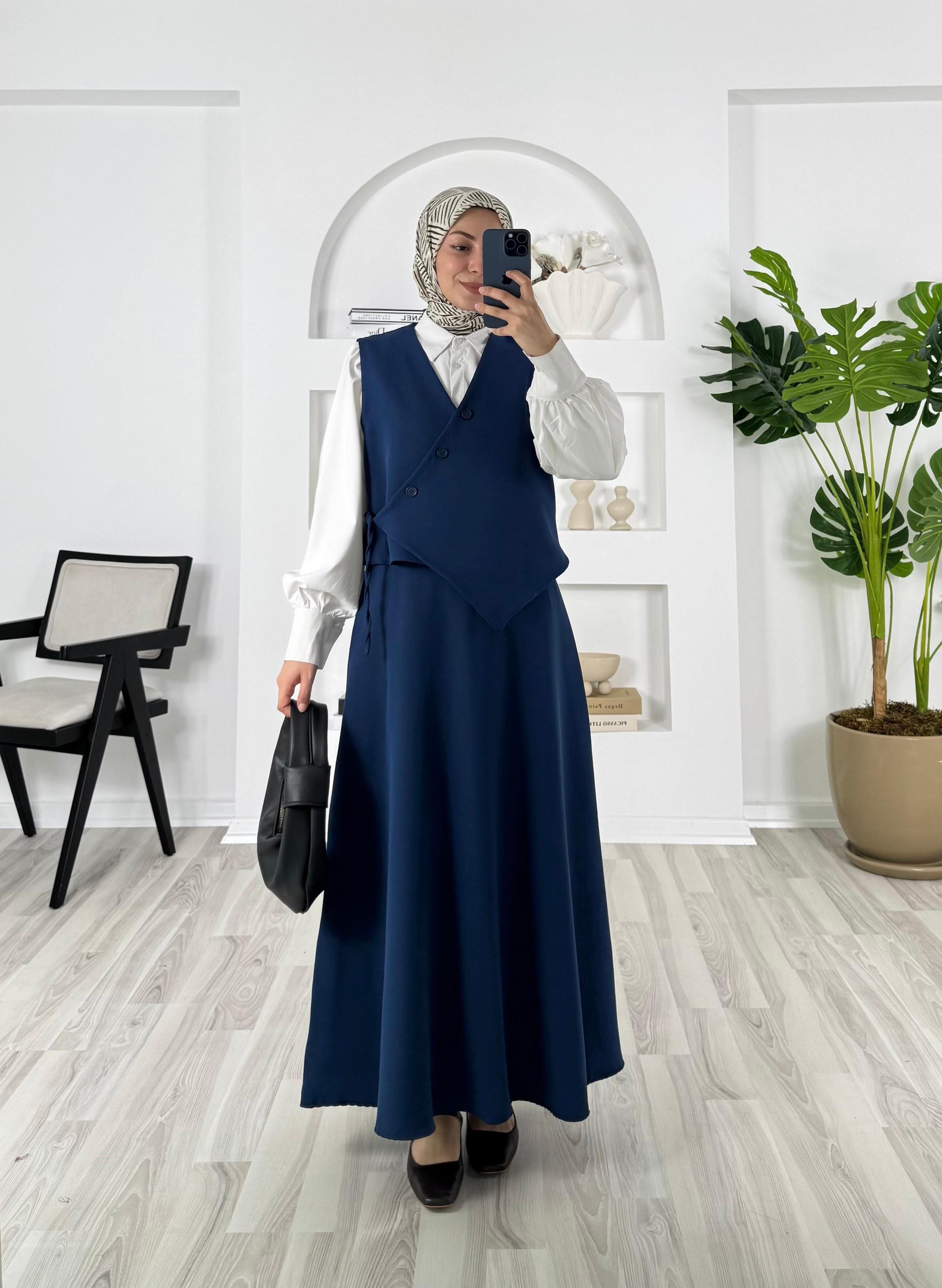 5245-dabıl krep kumaş-önü düğme ve bağlama detaylı etekli takım-petrol mavisi (5245)
