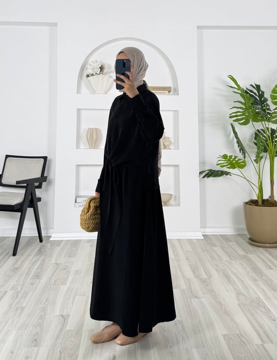 5256-cupra kumaş-önü düğmeli bağlamalı etekli takım-siyah (5256)