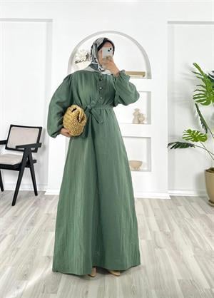 5324-müslin kumaş-yarım düğmeli kemerli elbise-su yeşili (5324)