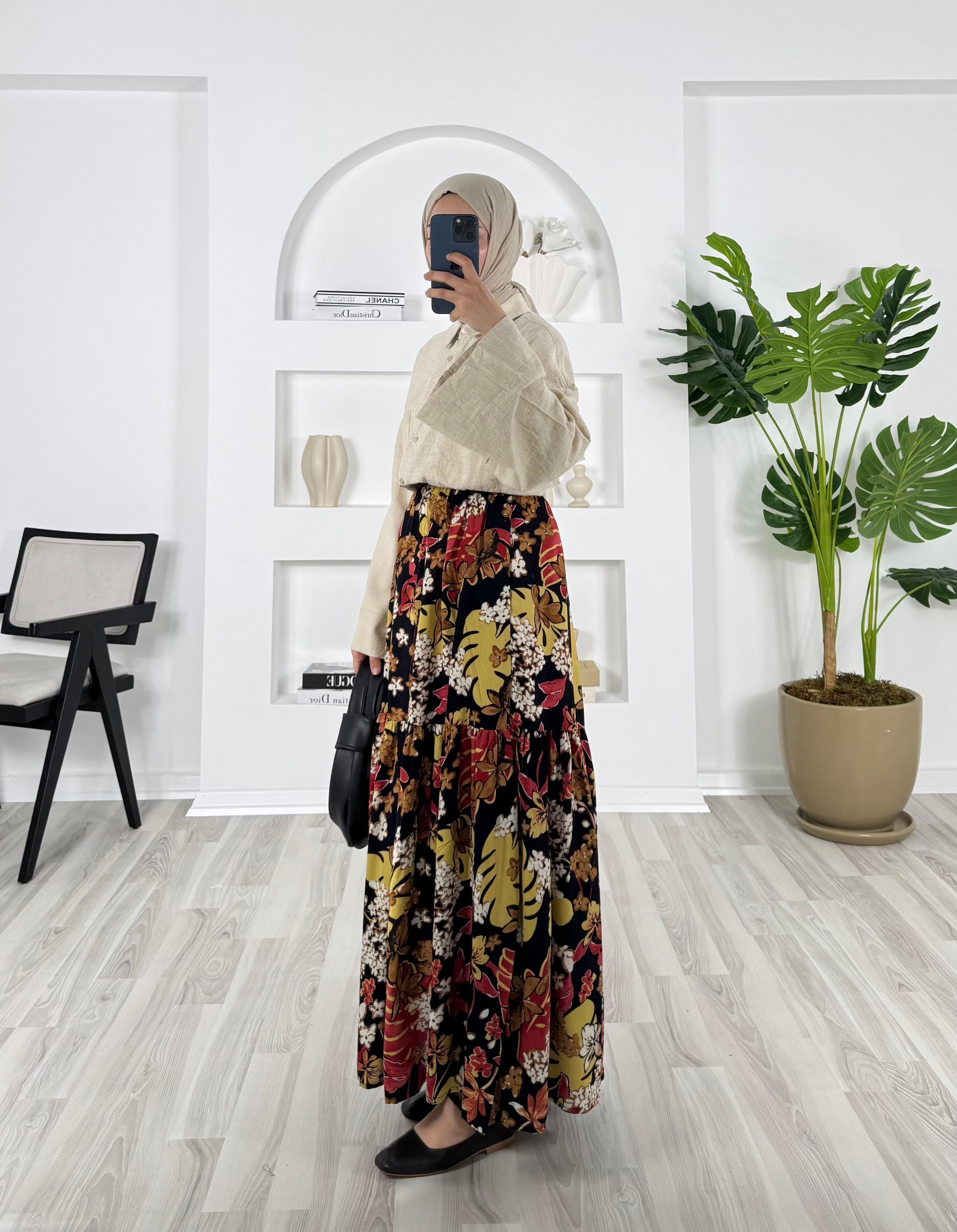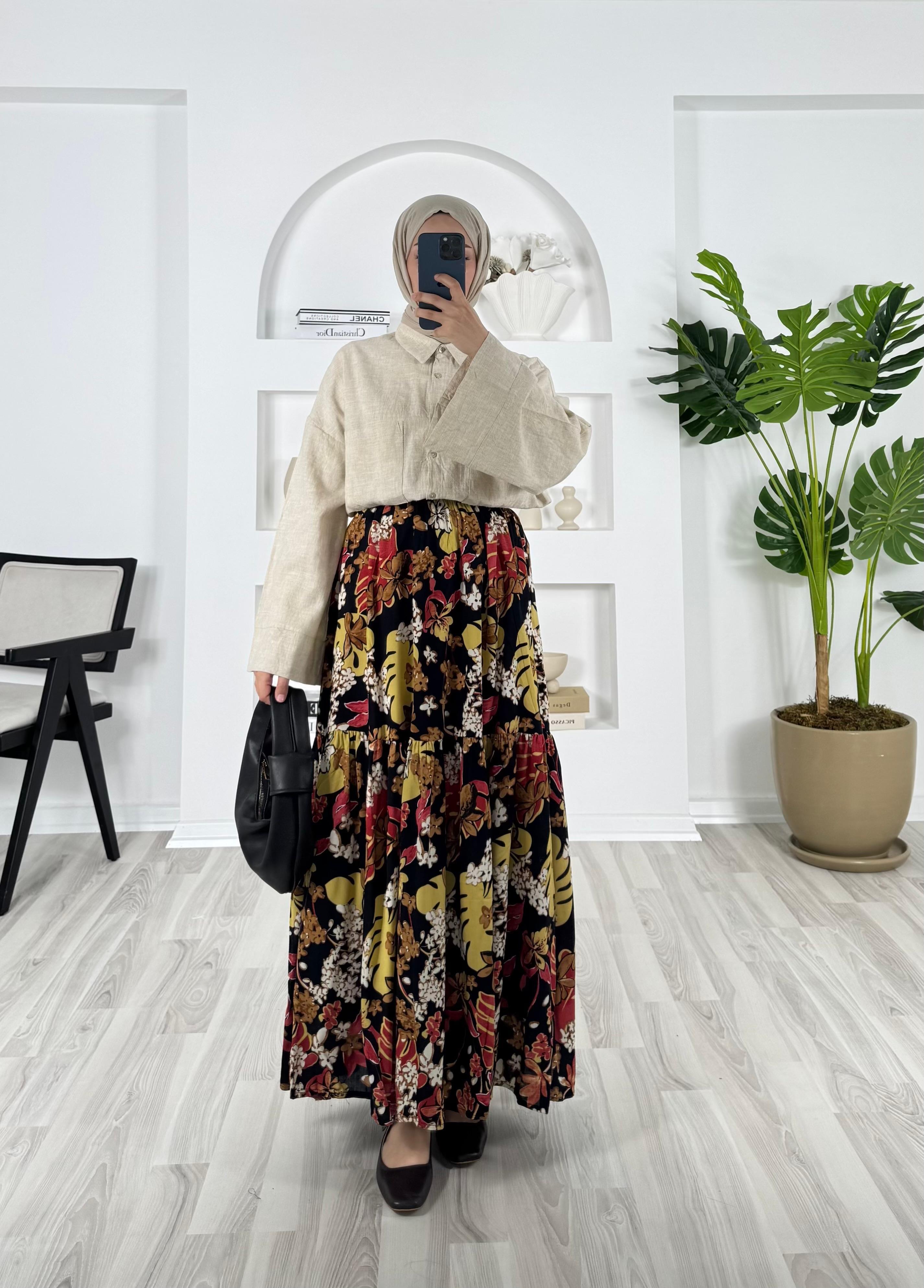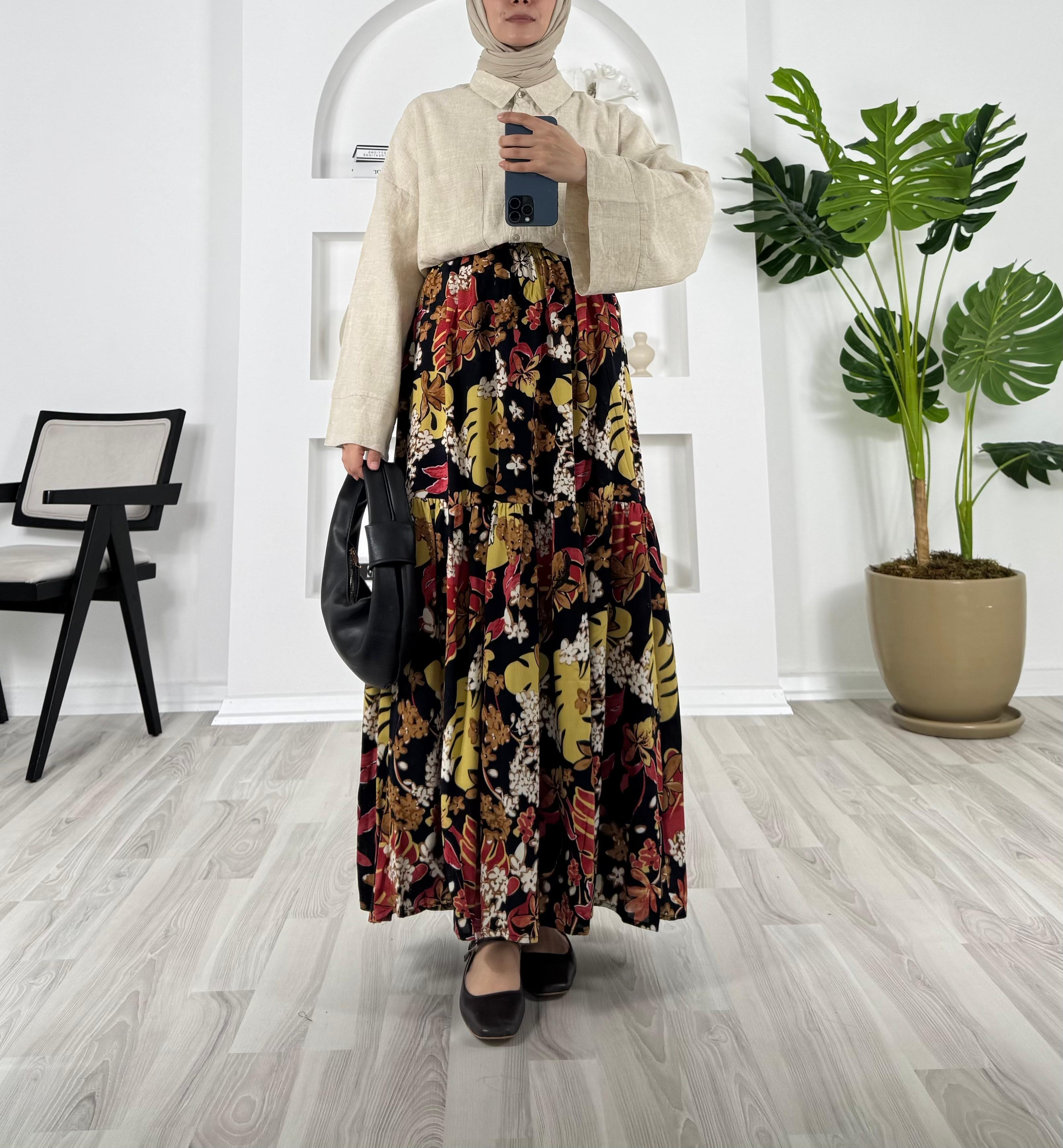 5378-pamuk viskon kumaş-çiçek desenli beli lastikli etek-siyah (5378)