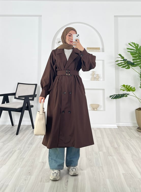 5428-bondit kumaş-önü düğmeli kemerli trenç-acı kahve (5428)