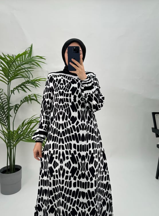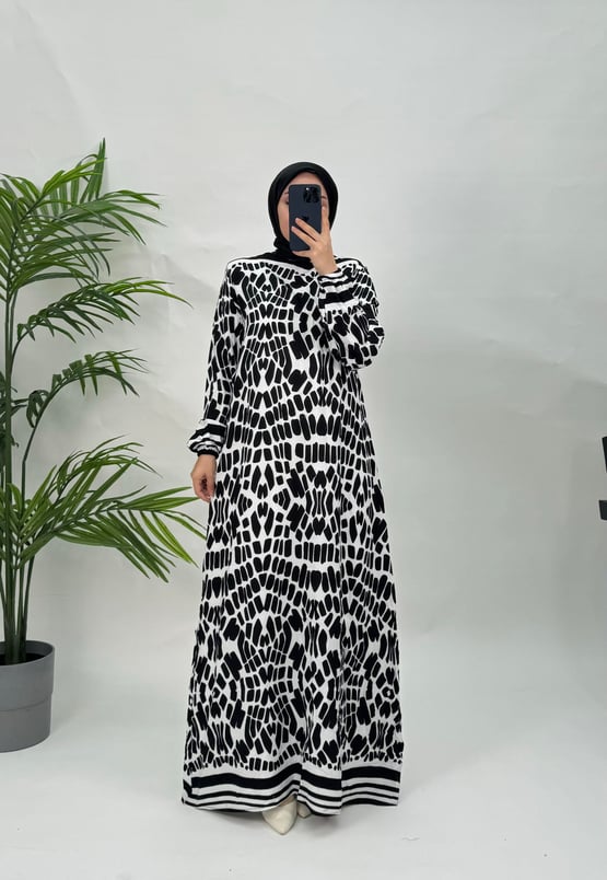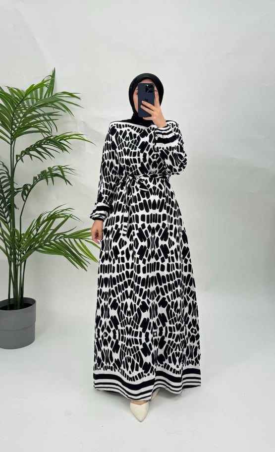 5441-pamuk viskon kumaş-taş desenli seyyar kemerli elbise-siyah (5441)