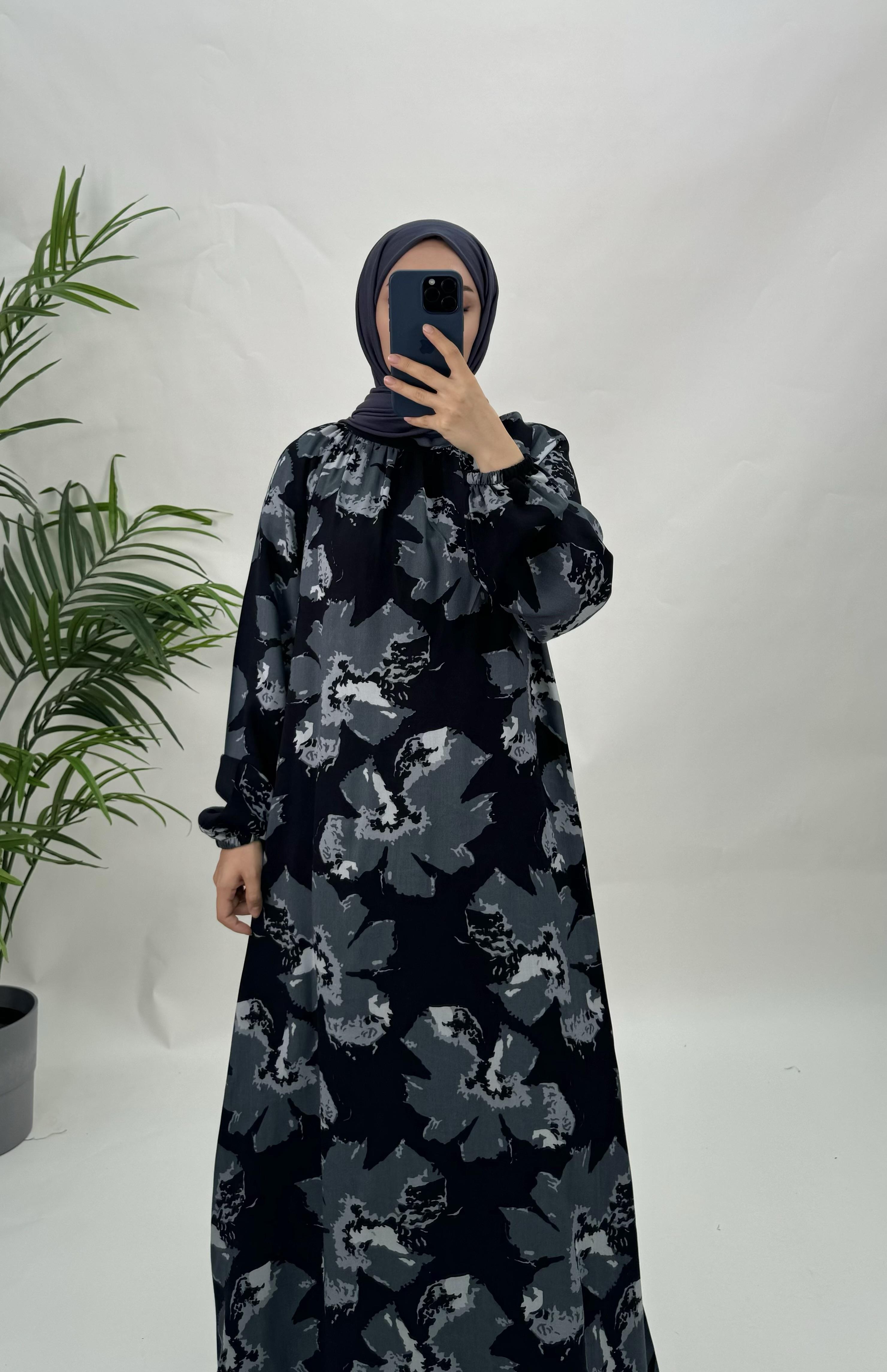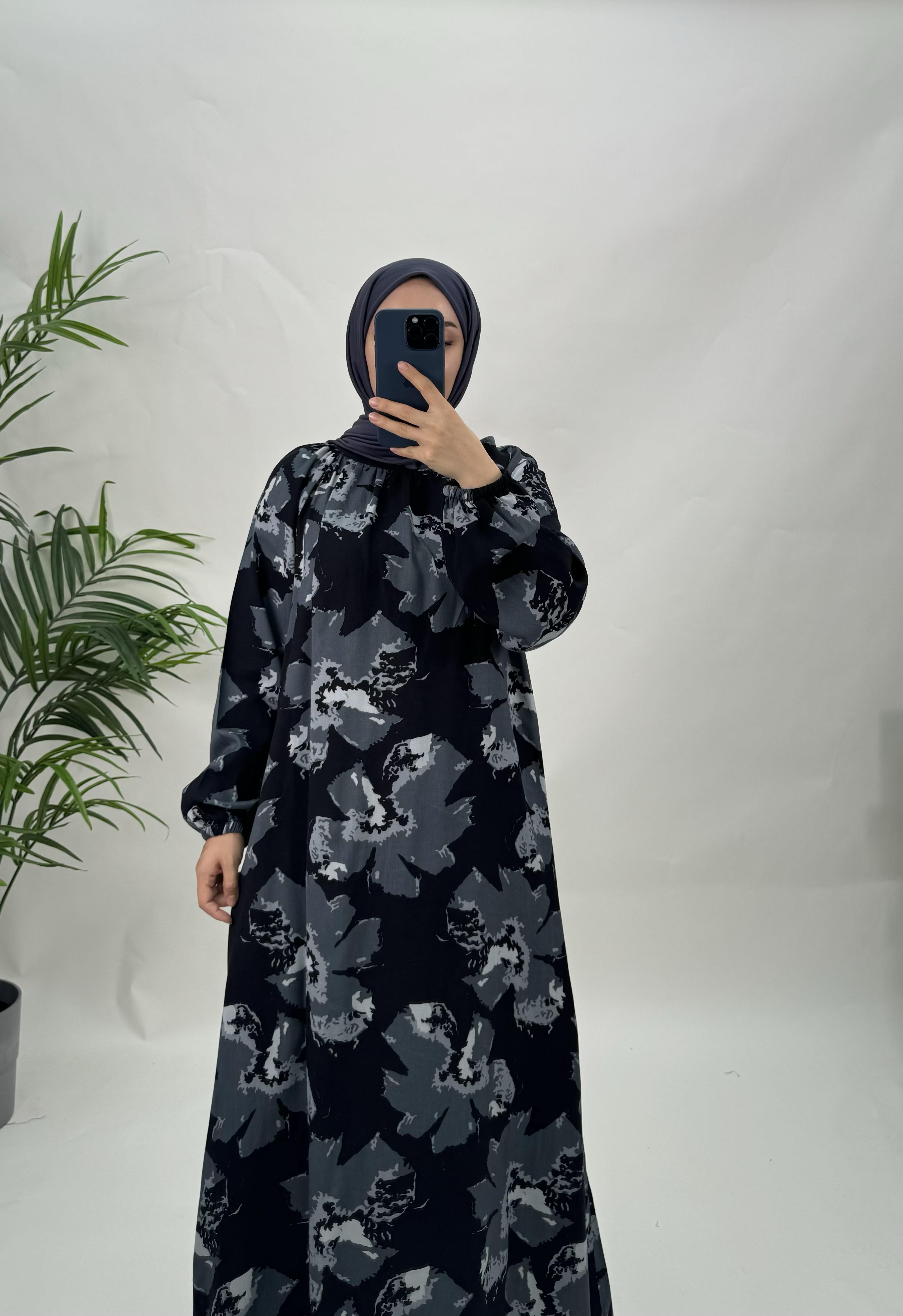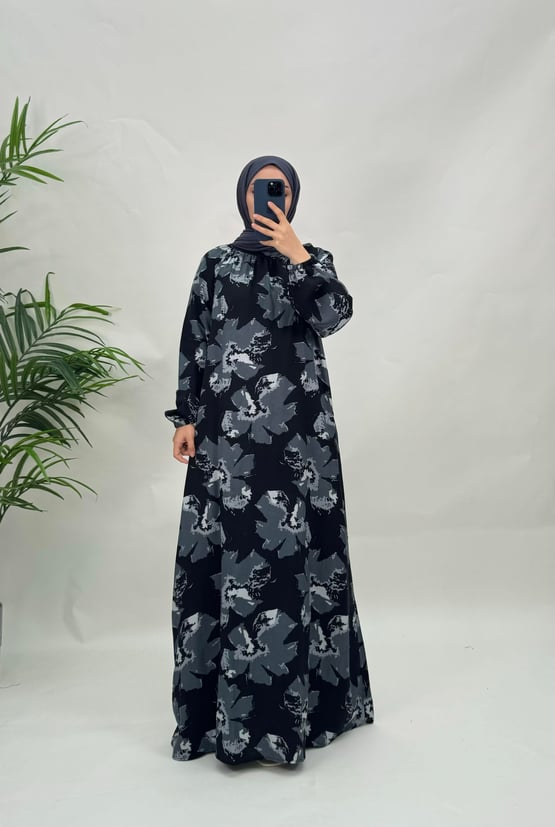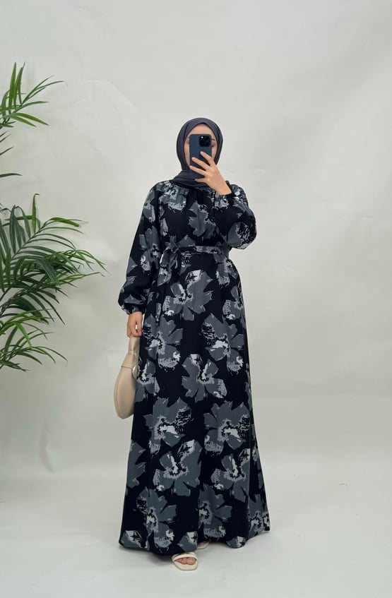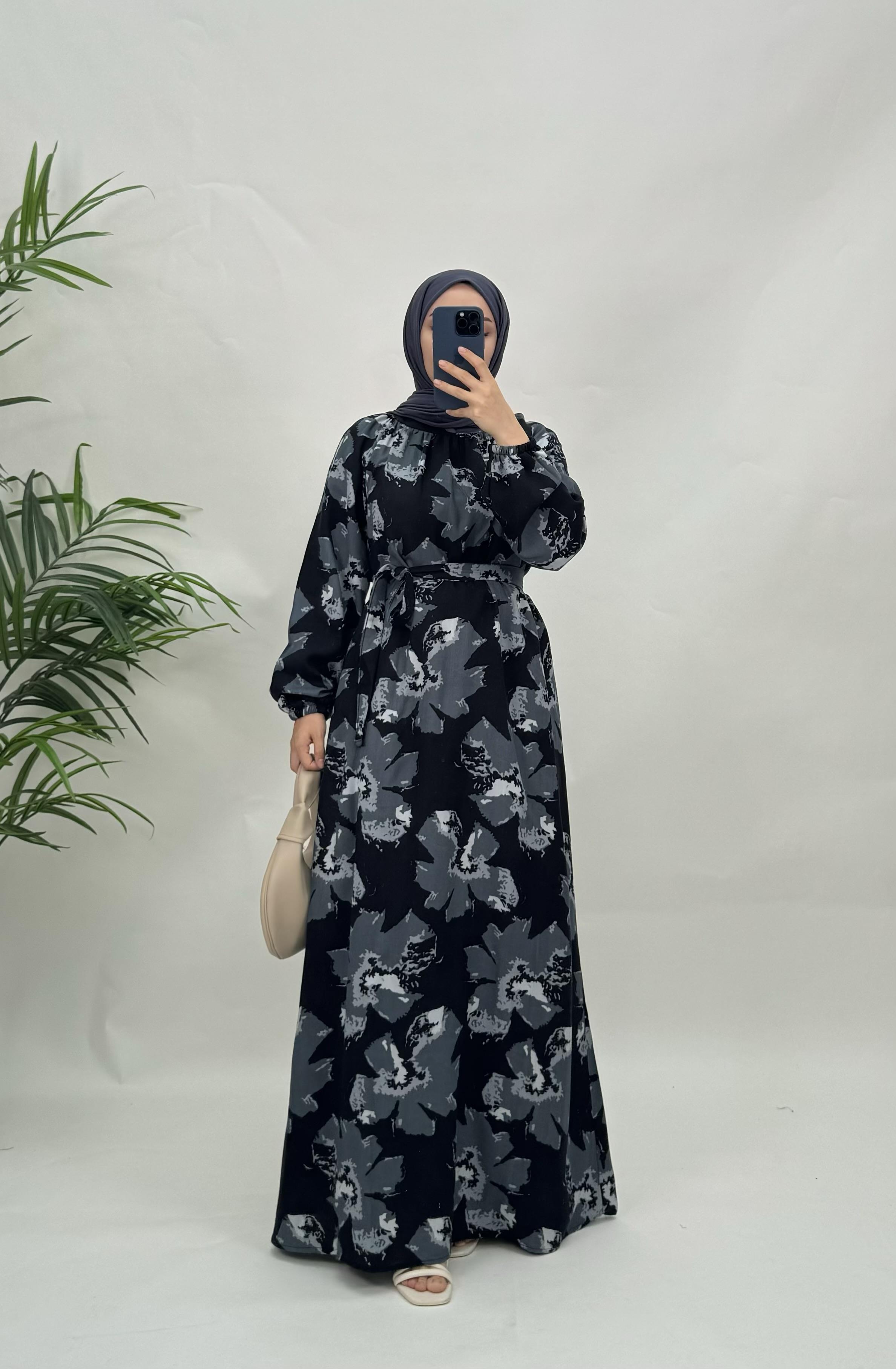 5565-pamuk viskon kumaş-etnik desenli seyyar kemerli elbise-gri (5565)