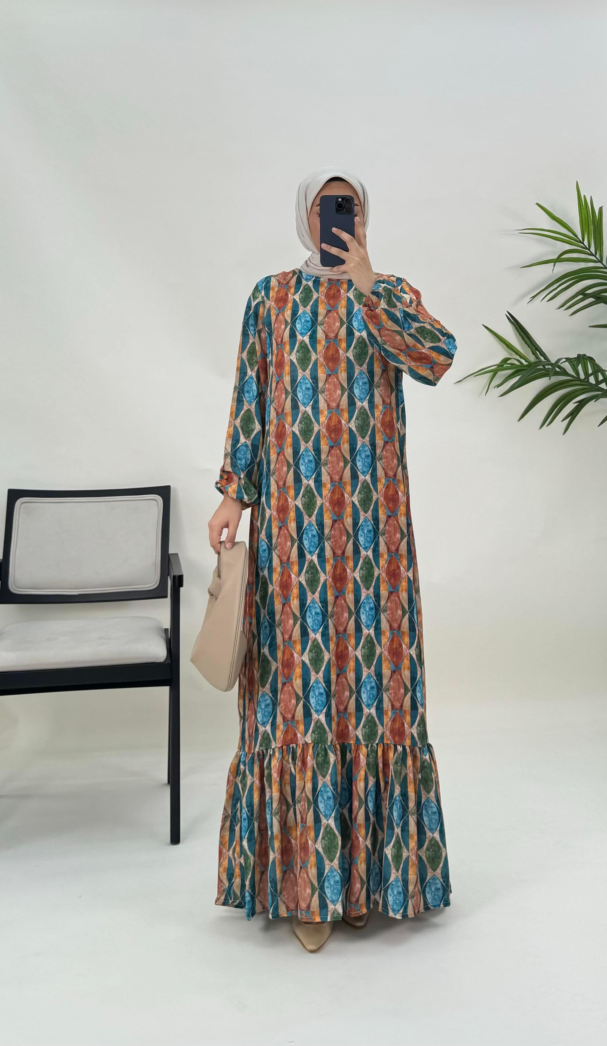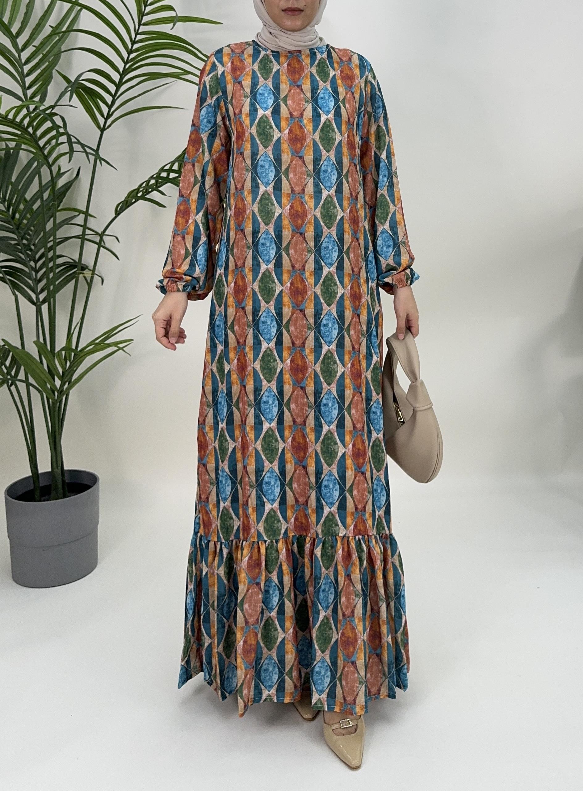 etnik desenli etek kısmı fırfırlı elbise