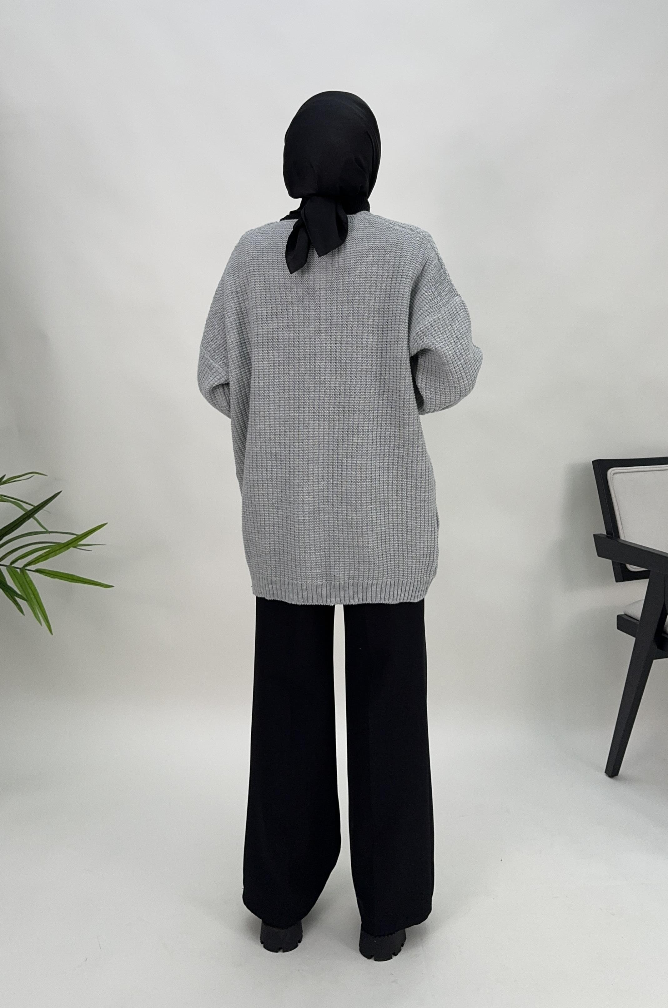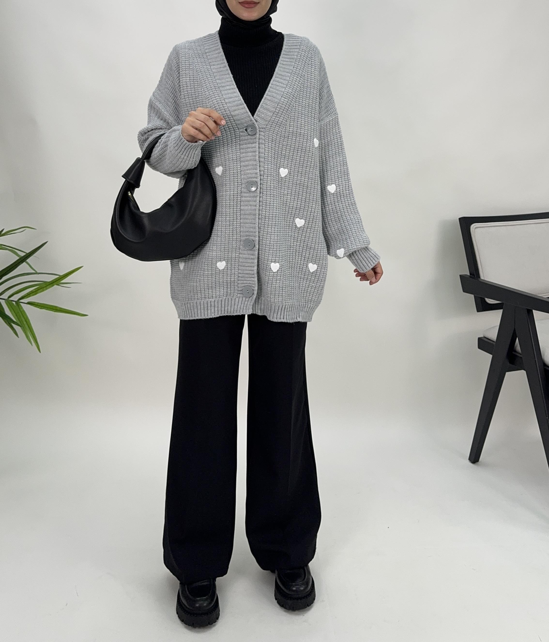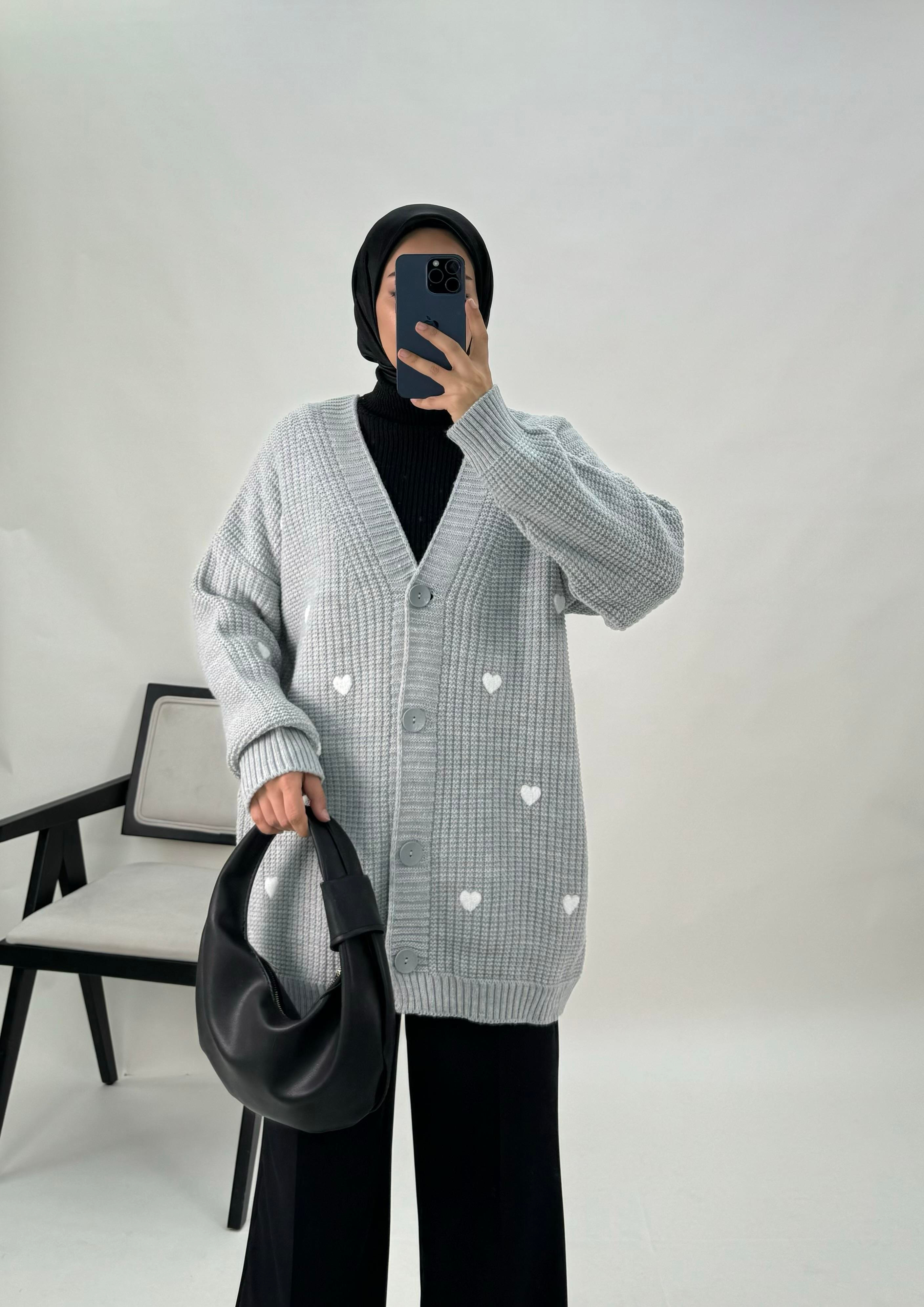 5645-önü düğmeli kalp desenli triko hırka-gri-beyaz kalpli (5645)