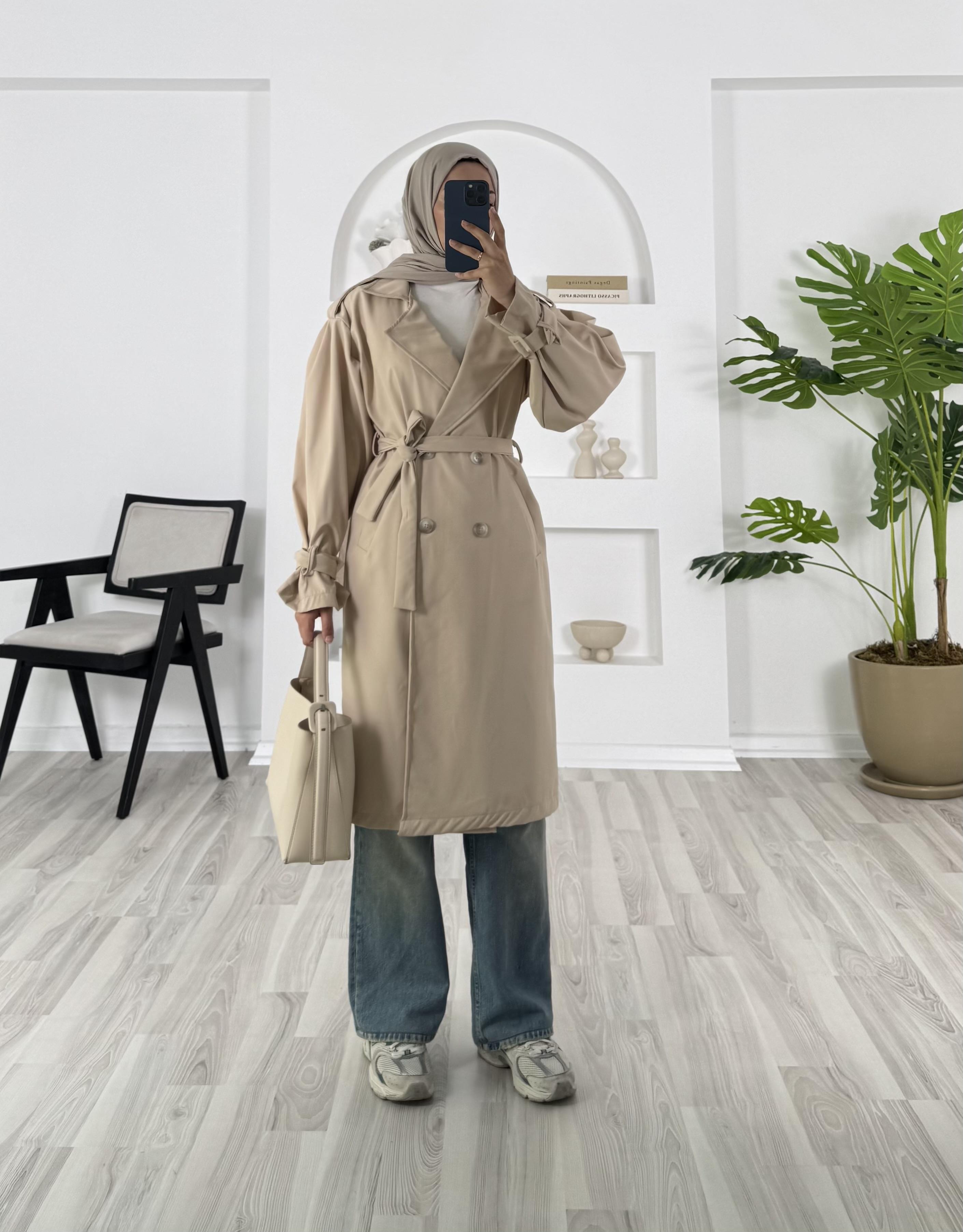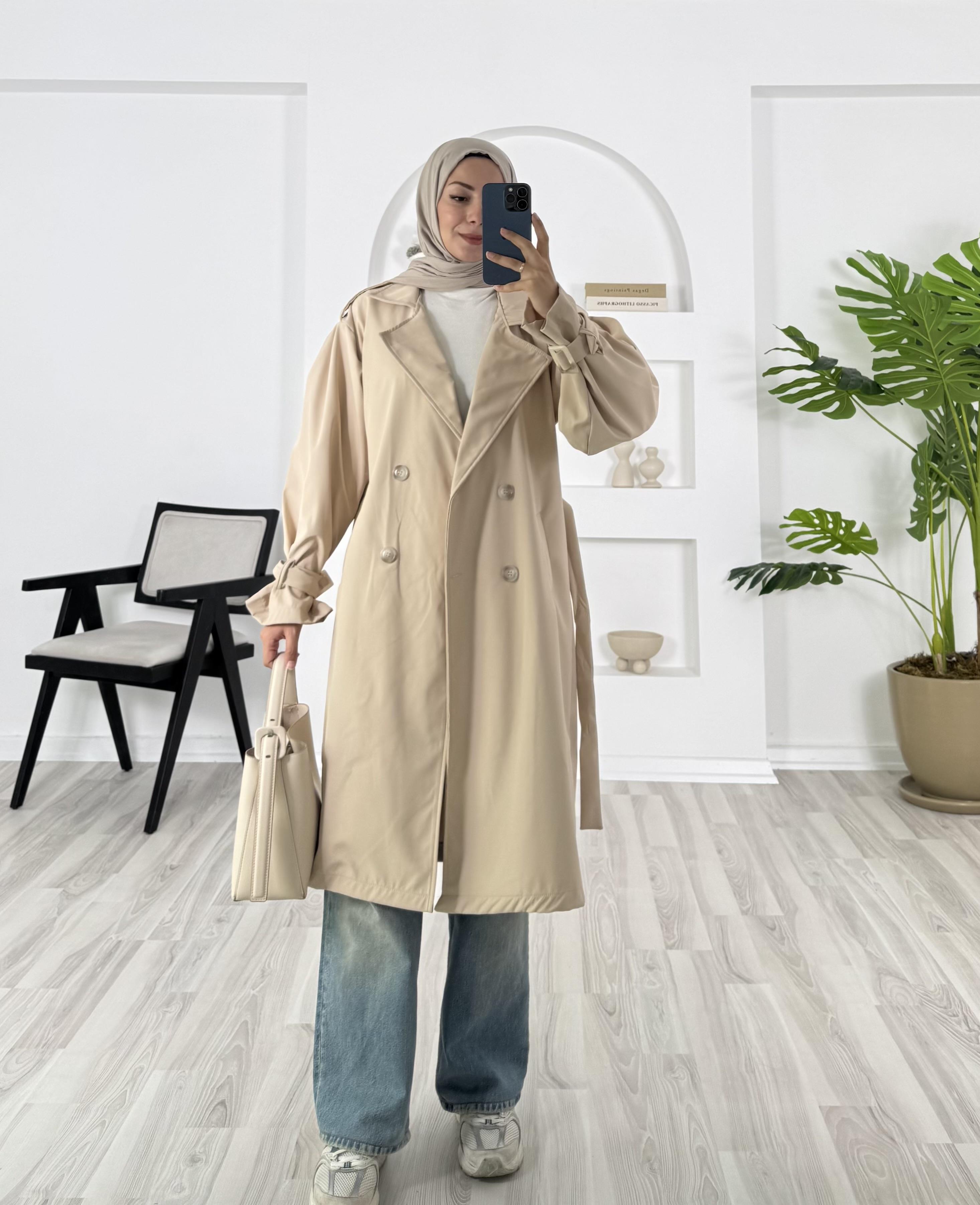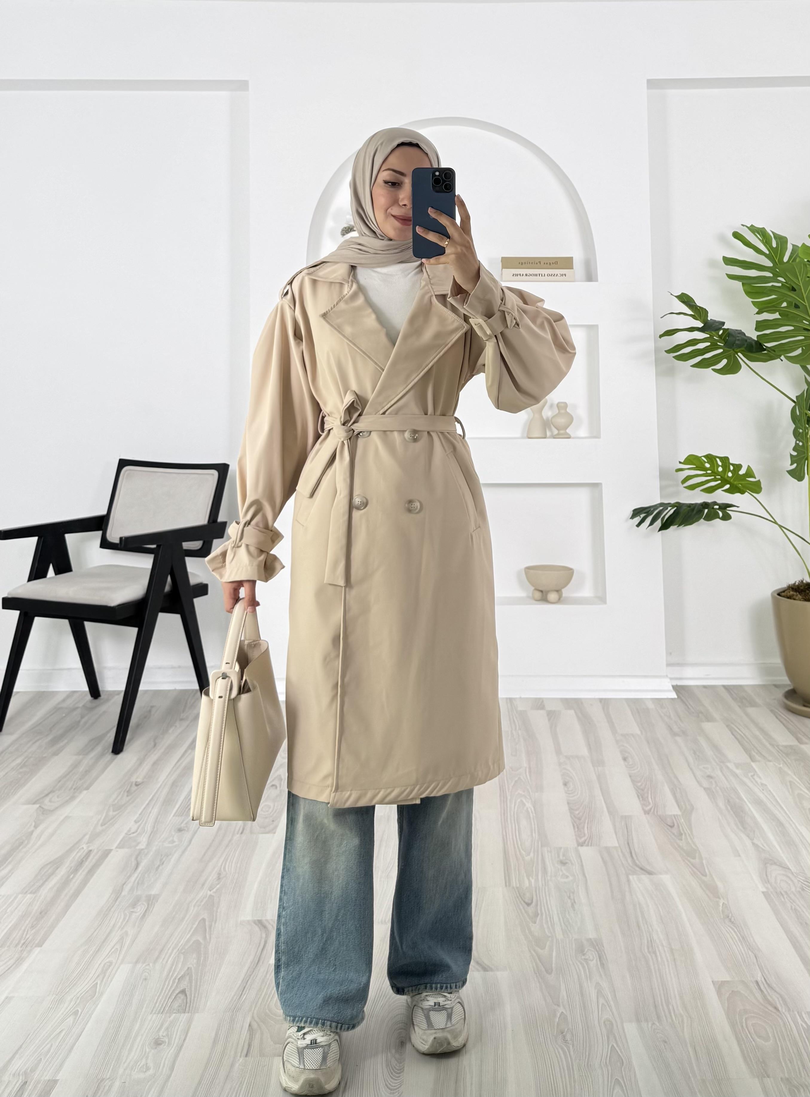 5663-bondit kumaş-omuz apoletli kemerli trenç-taş (5663)