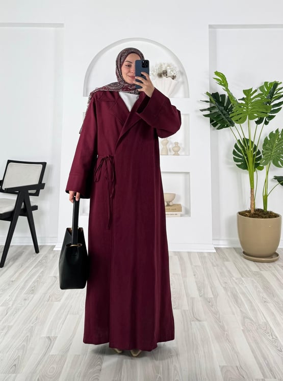 5667-önden bağcıklı keten trenç-bordo (5667)