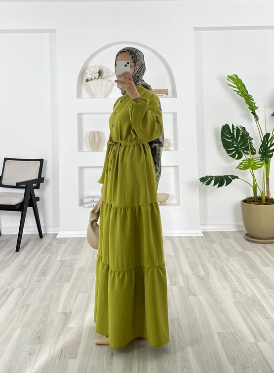 5688-ayrobin kumaş-beli büzülebilir yarım düğmeli elbise-yağ yeşili (5688)