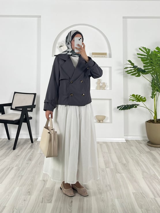 5727-bondit kumaş-önü düğmeli omuz detaylı kısa trenç-füme (5727)