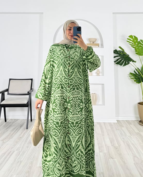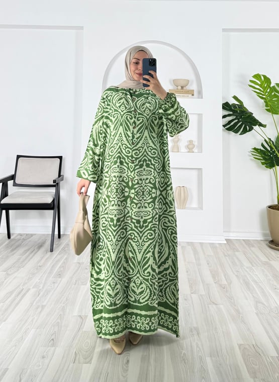 5763-pamuk viskon kumaş-boydan düğmeli elbise-yeşil (5763)