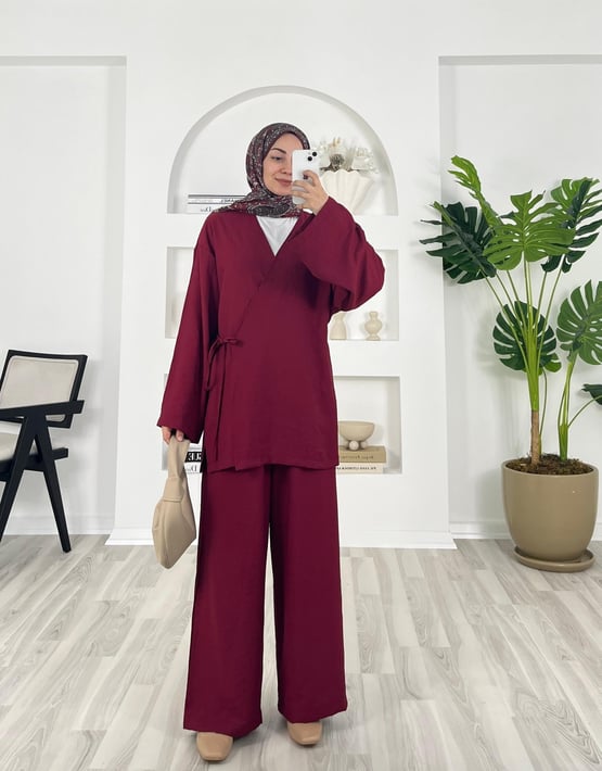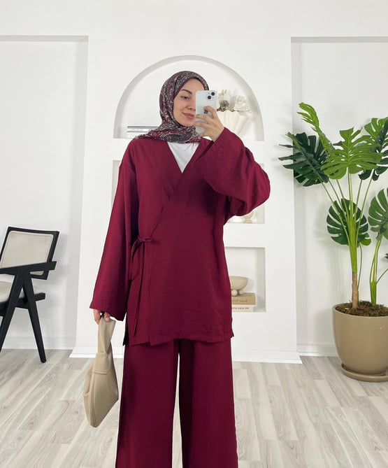 5896-çilek kumaş-yandan bağlamalı pantolonlu kimono takım-bordo (5896)