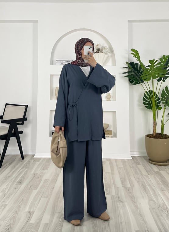 yandan bağlamalı pantolonlu kimono takım