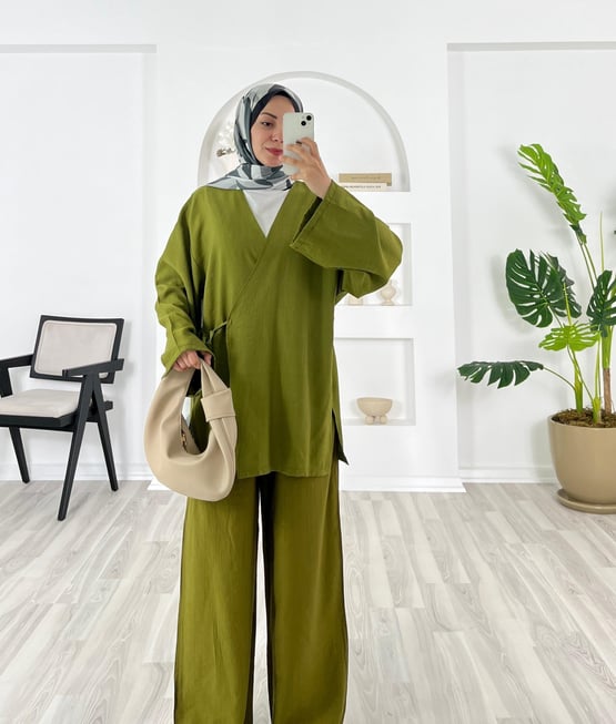 5896-çilek kumaş-yandan bağlamalı pantolonlu kimono takım-yağ yeşili (5896)