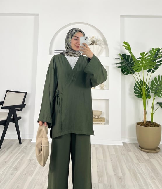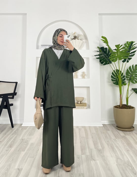 yandan bağlamalı pantolonlu kimono takım
