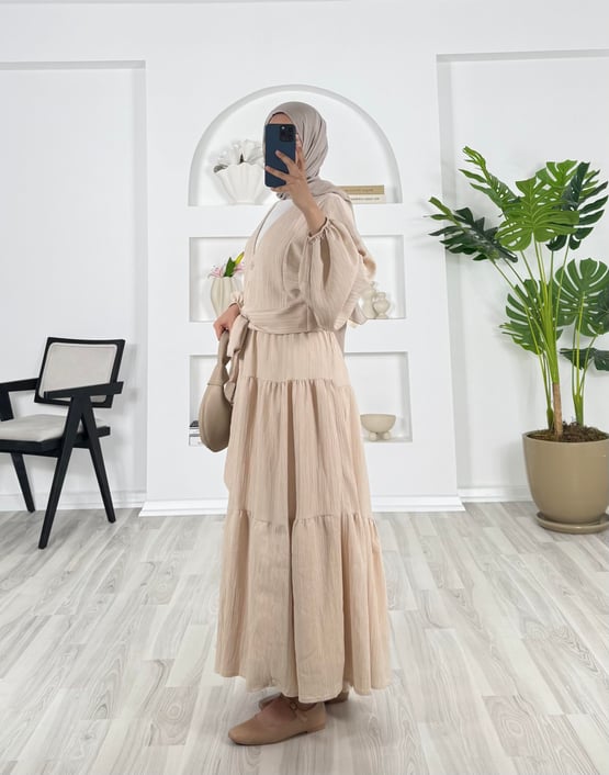 5942-alissa kumaş-önü bağlamalı bilek ucu lastikli etekli takım-krem (5942)