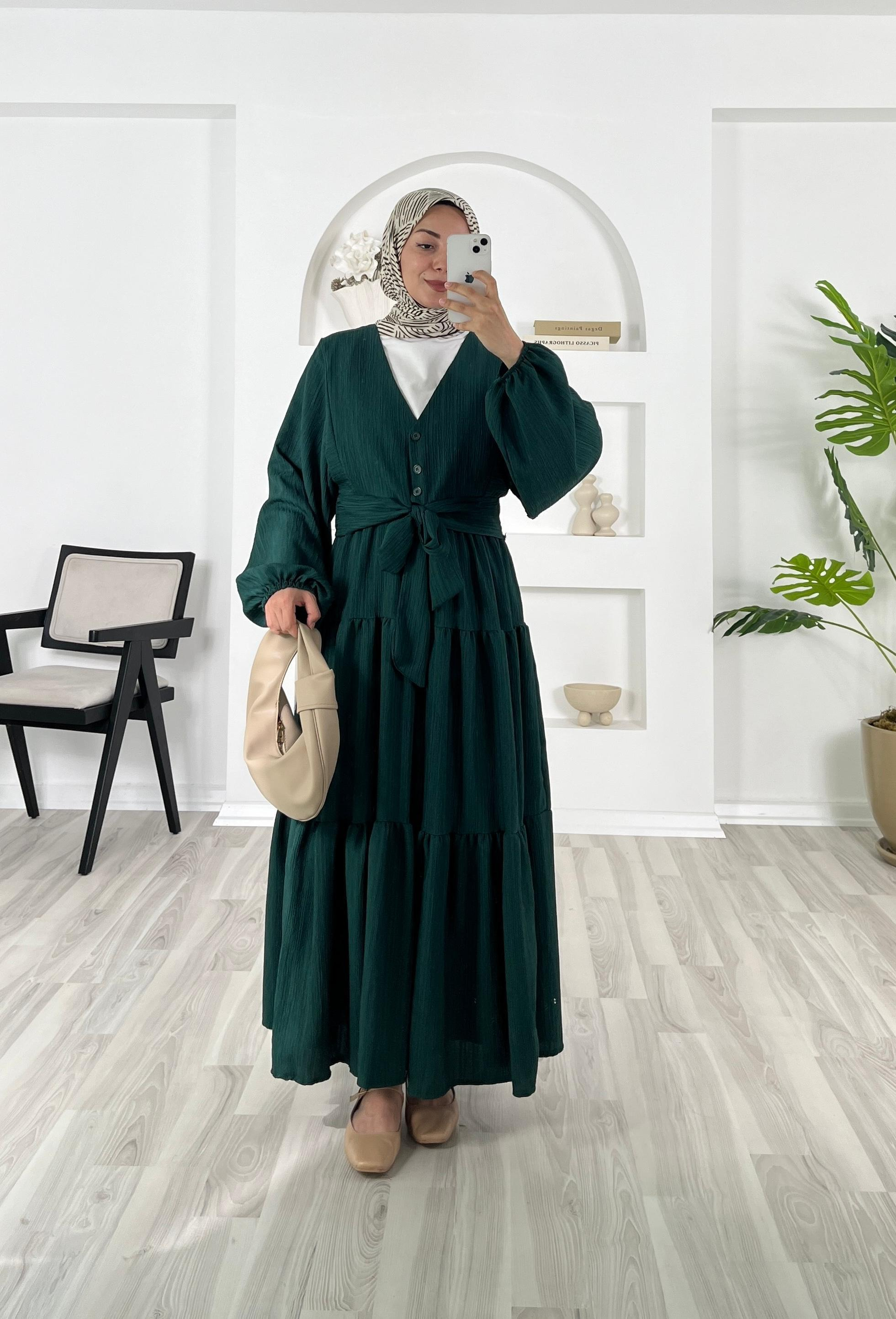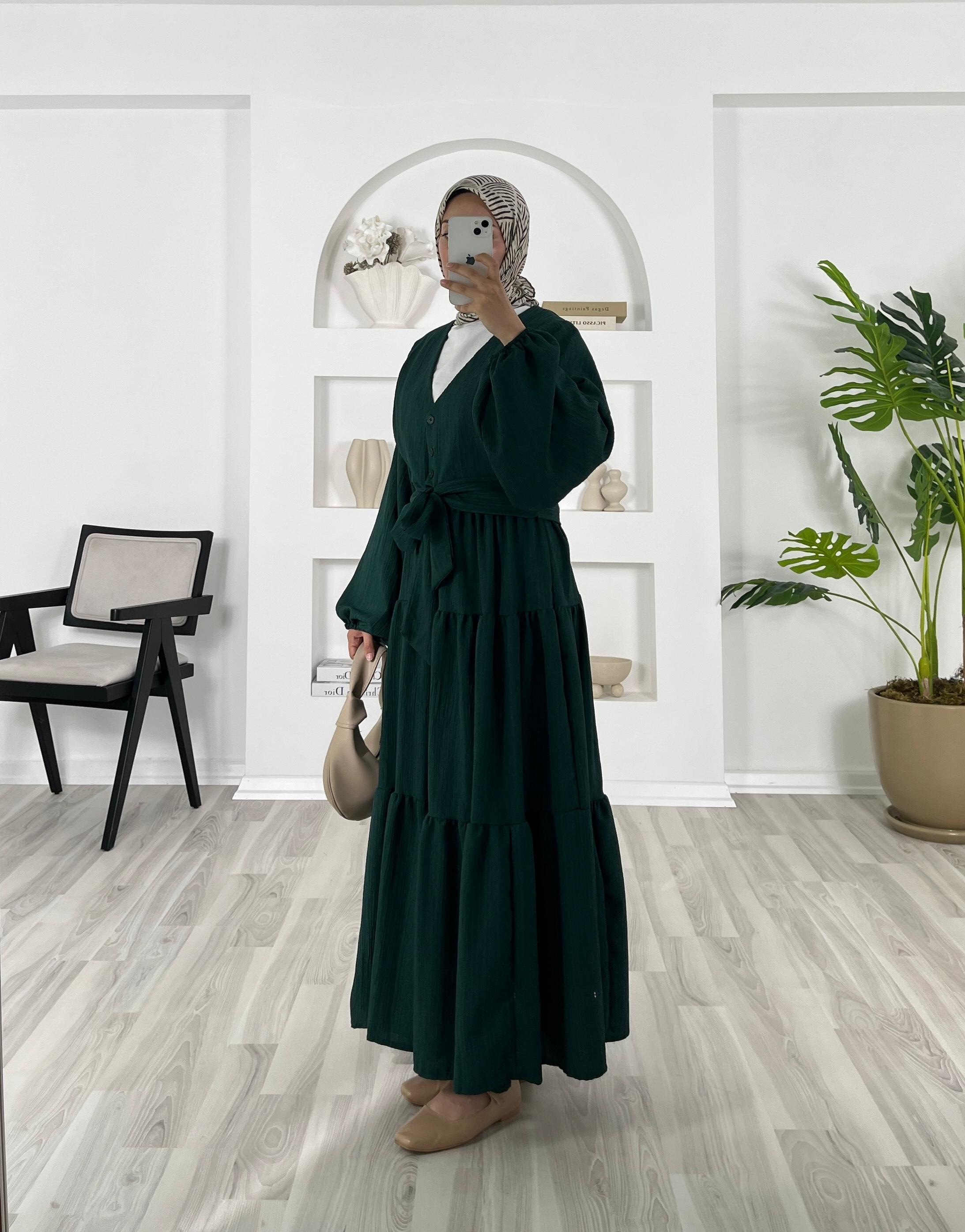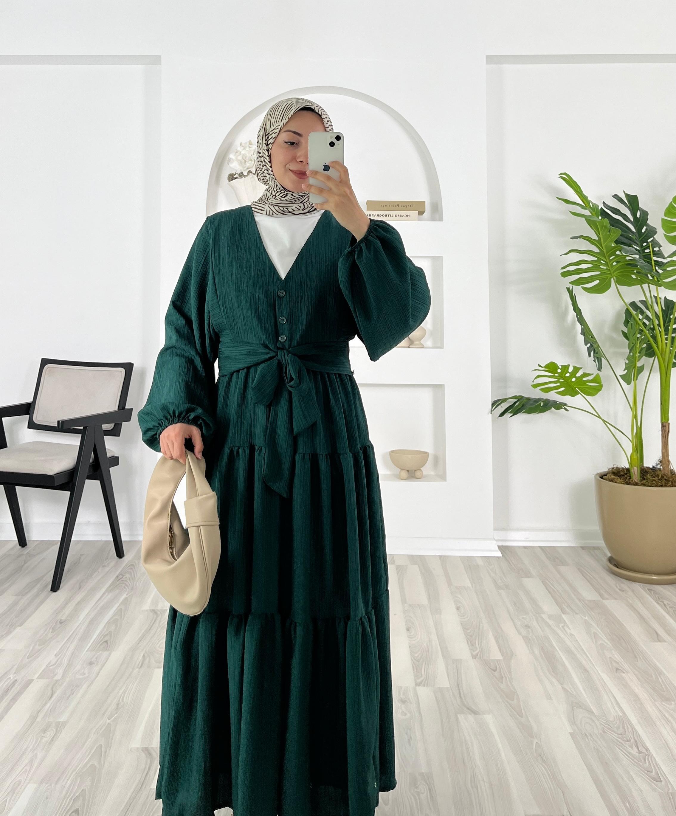 5942-alissa kumaş-önü bağlamalı bilek ucu lastikli etekli takım-zümrüt yeşili (5942)