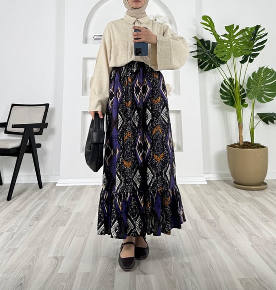 5965-pamuk viskon kumaş-etek altı fırfırlı etnik desenli etek-siyah-mor (5965)