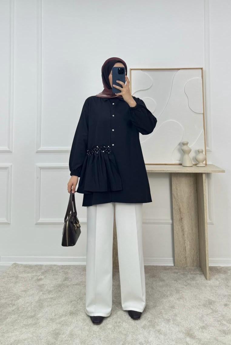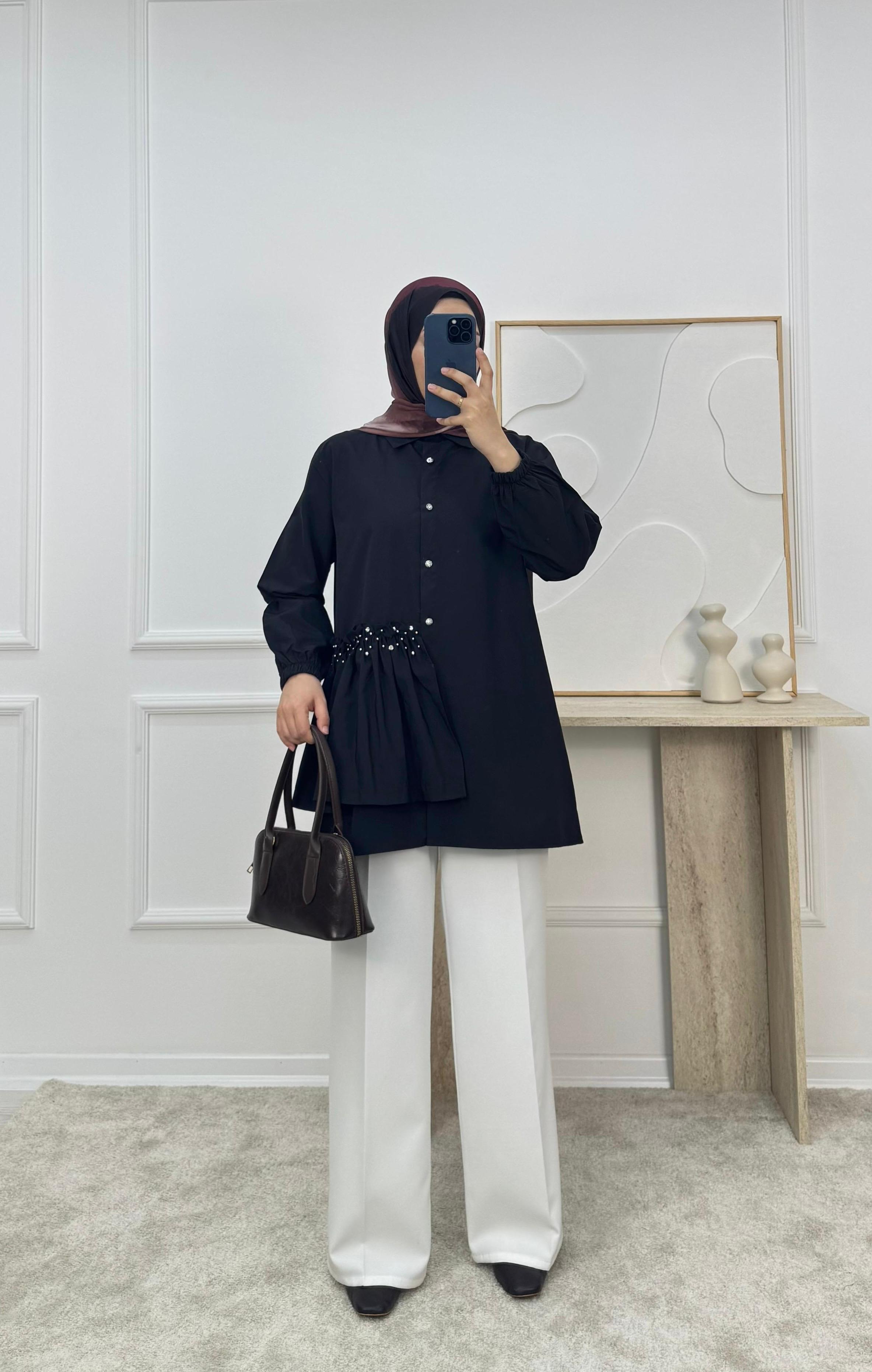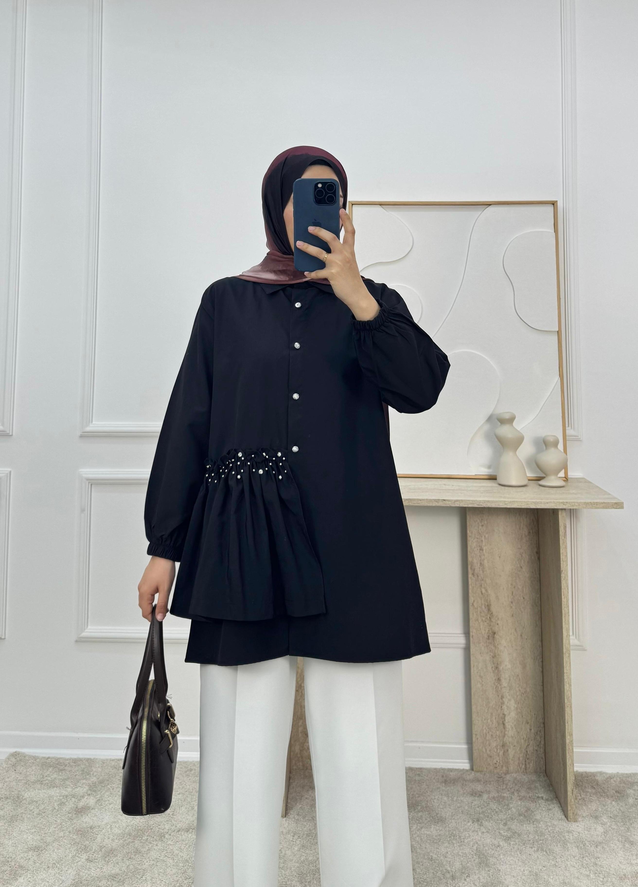 5985-poplin kumaş yandan taşlı tunik -siyah (5985)