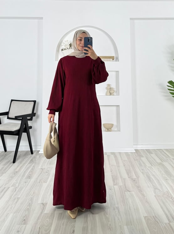 6032-Piliseli kumaş -fitilli elbise bordo (6032)