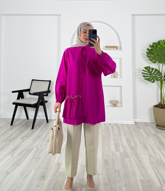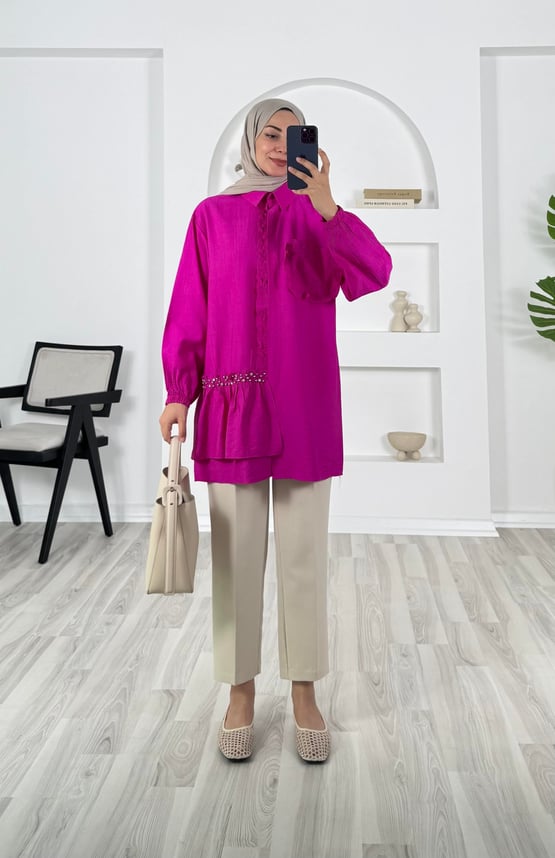 6142-çilek kumaş-boncuk detaylı fırfırlı gömlek-fuşya (6142)