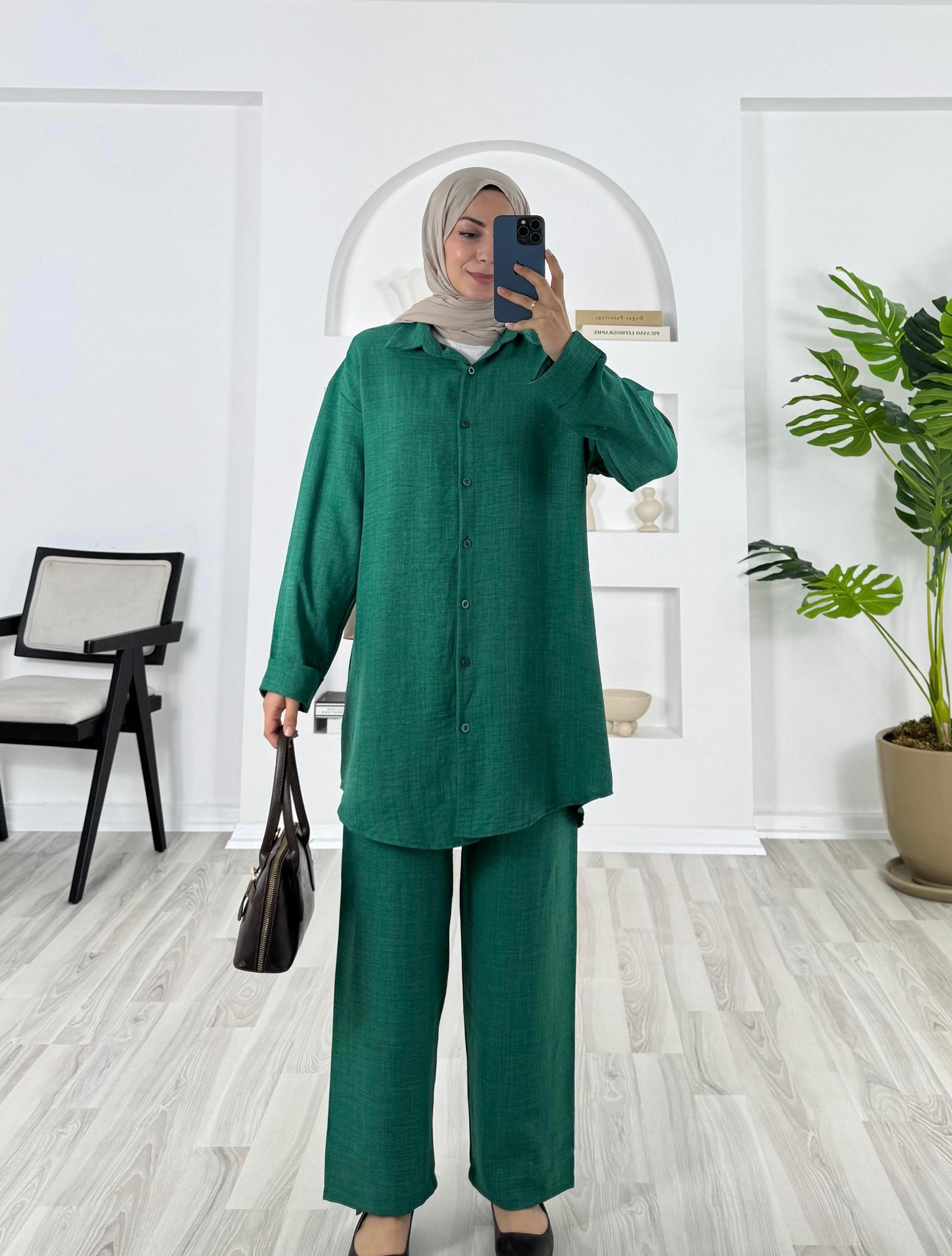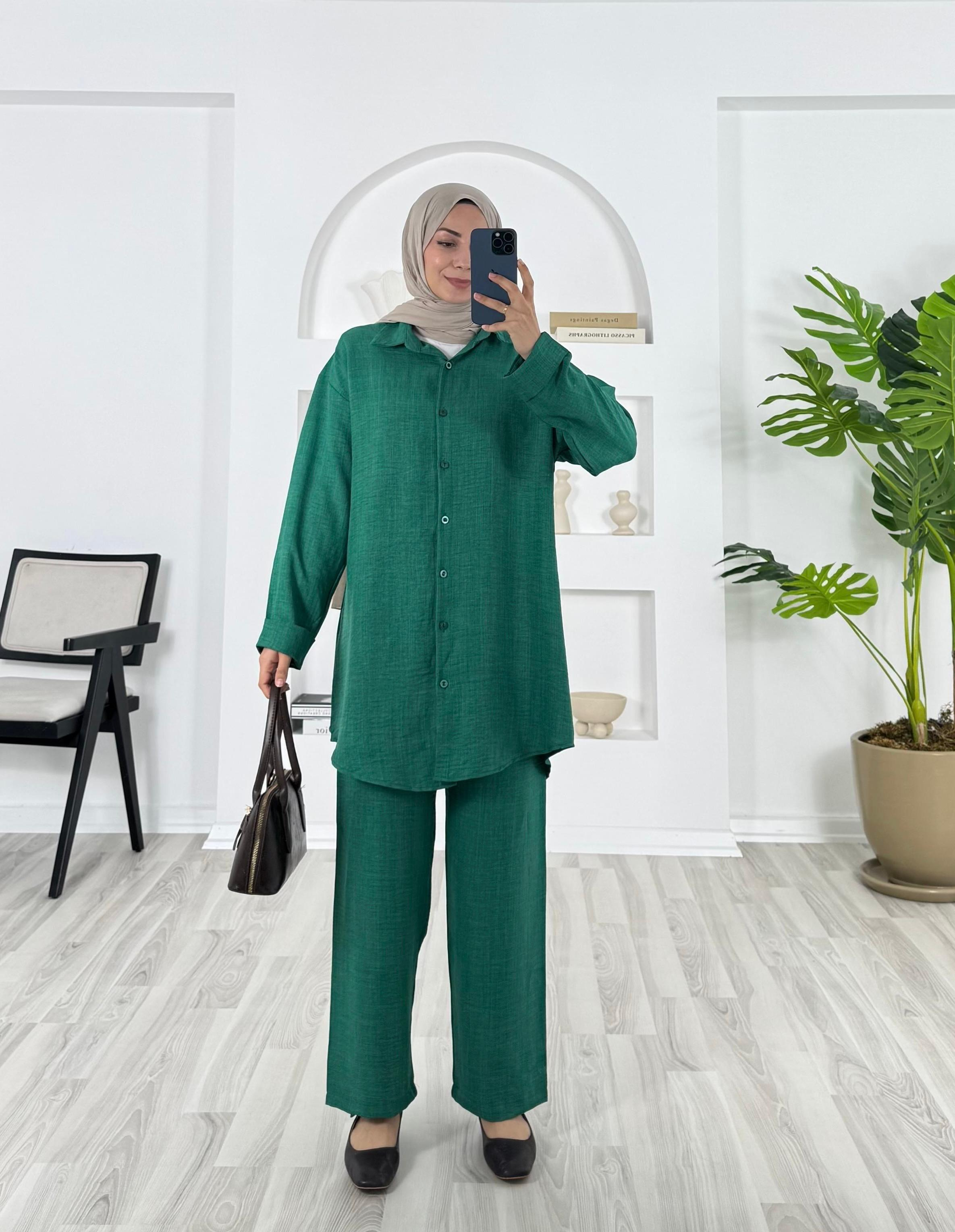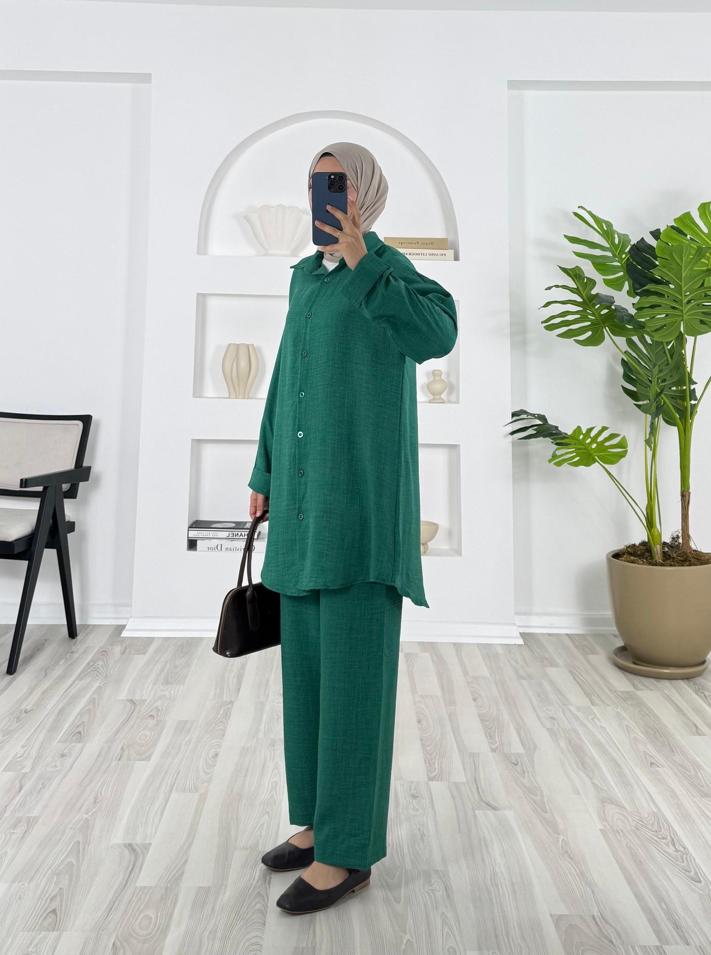 6184-keten kumaş-pantolonlu tunik takım-yeşil (6184)