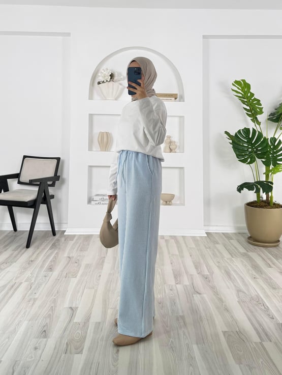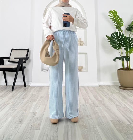 6345-su yolu kumaş-çizgili beli lastikli pantolon-bebe mavisi (6345)