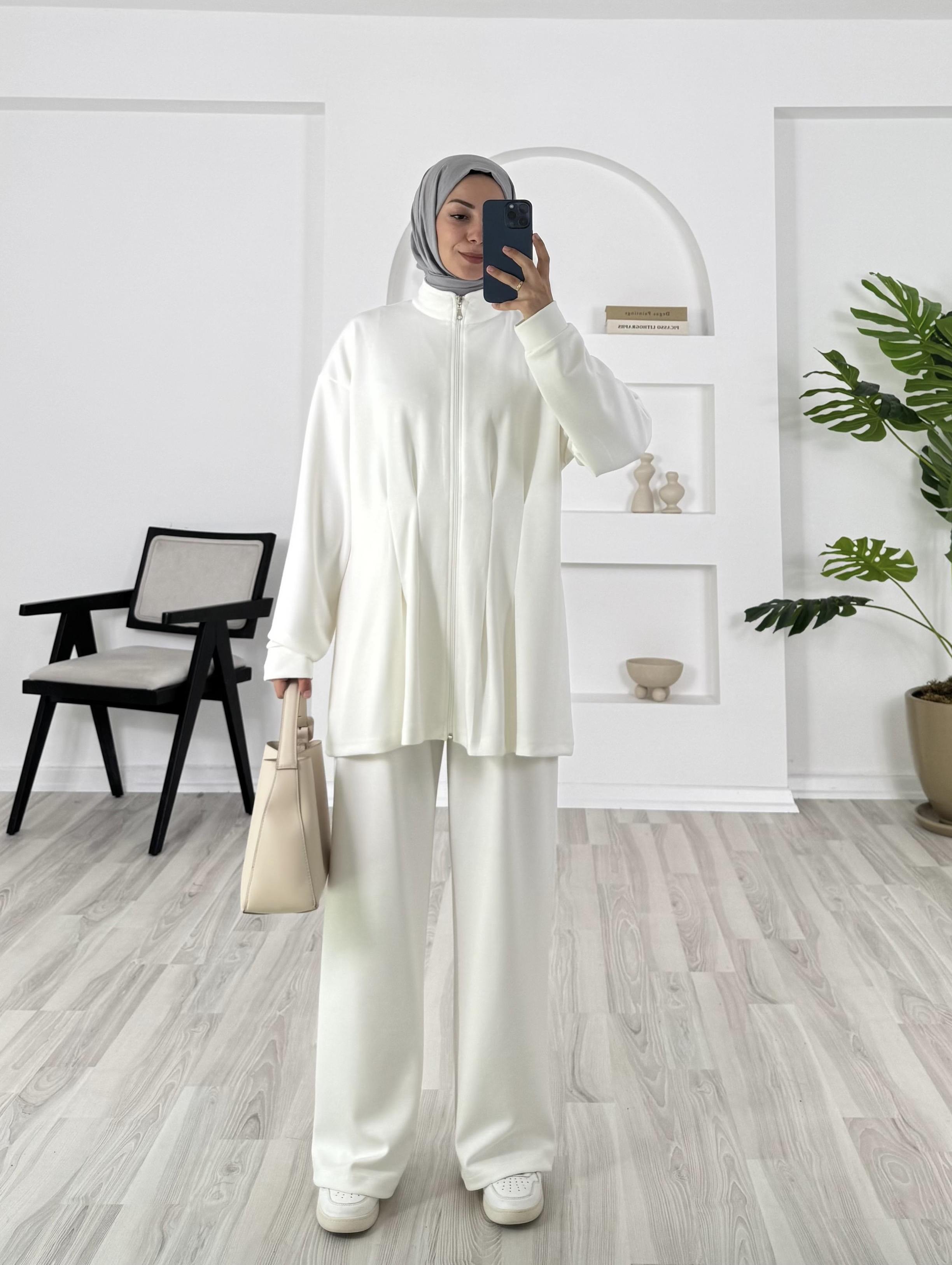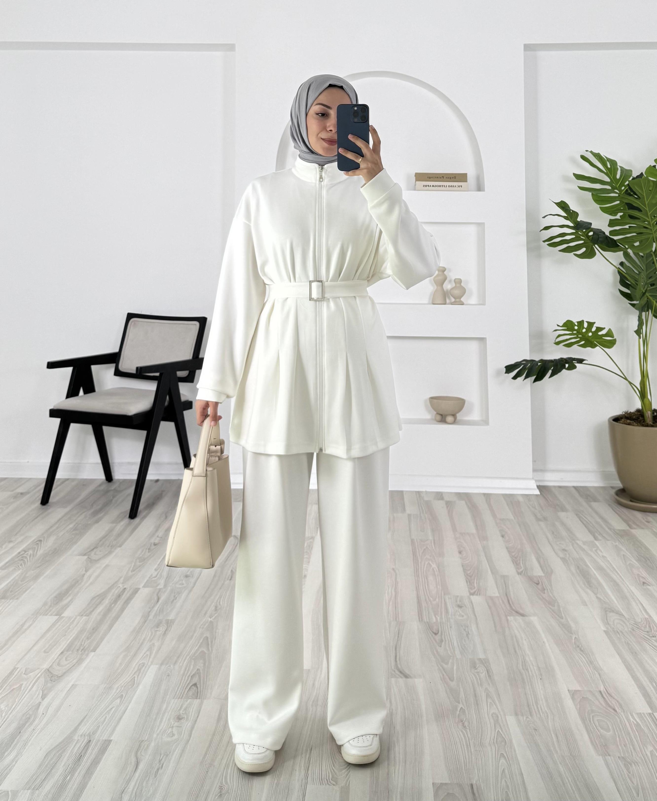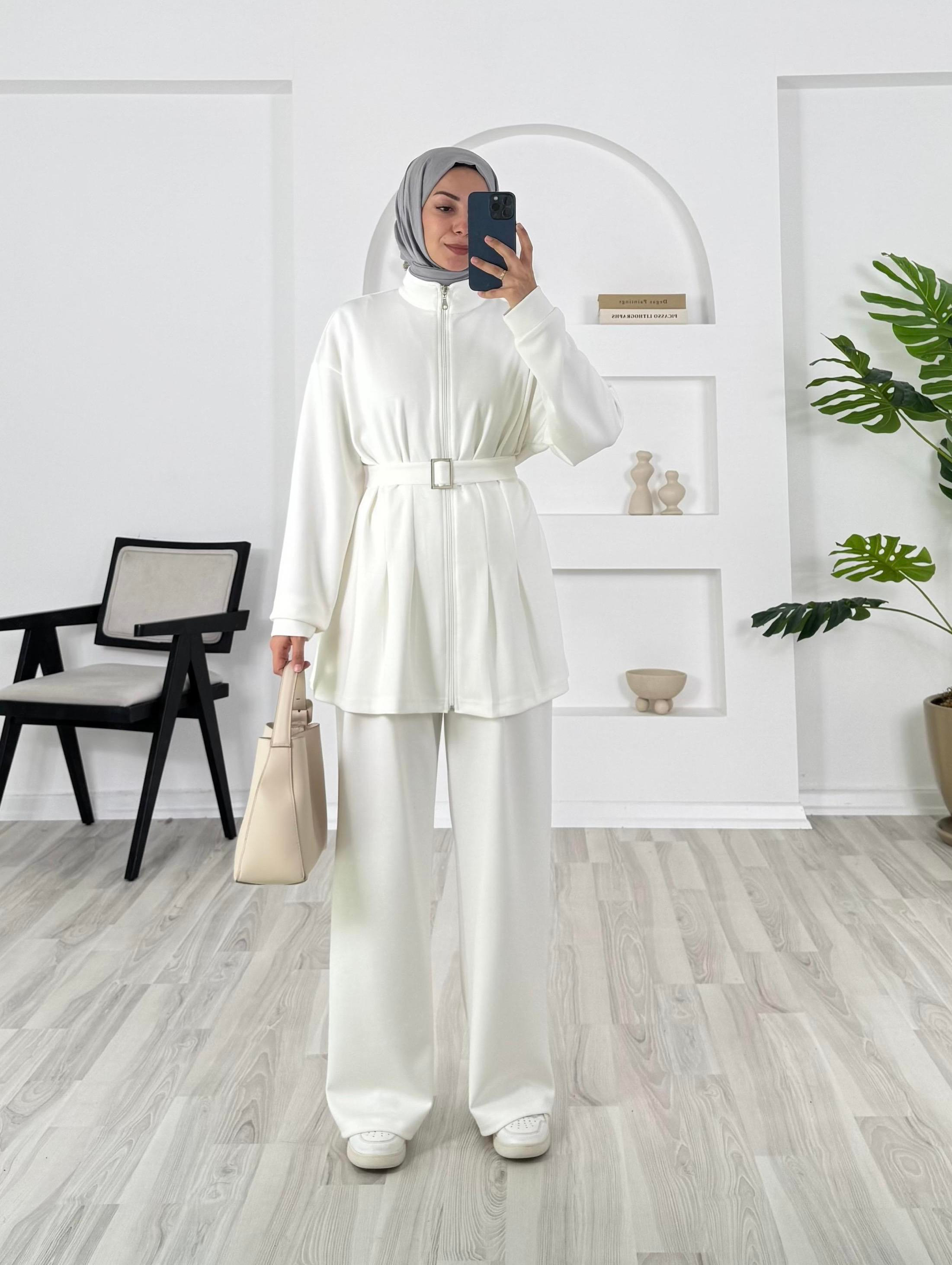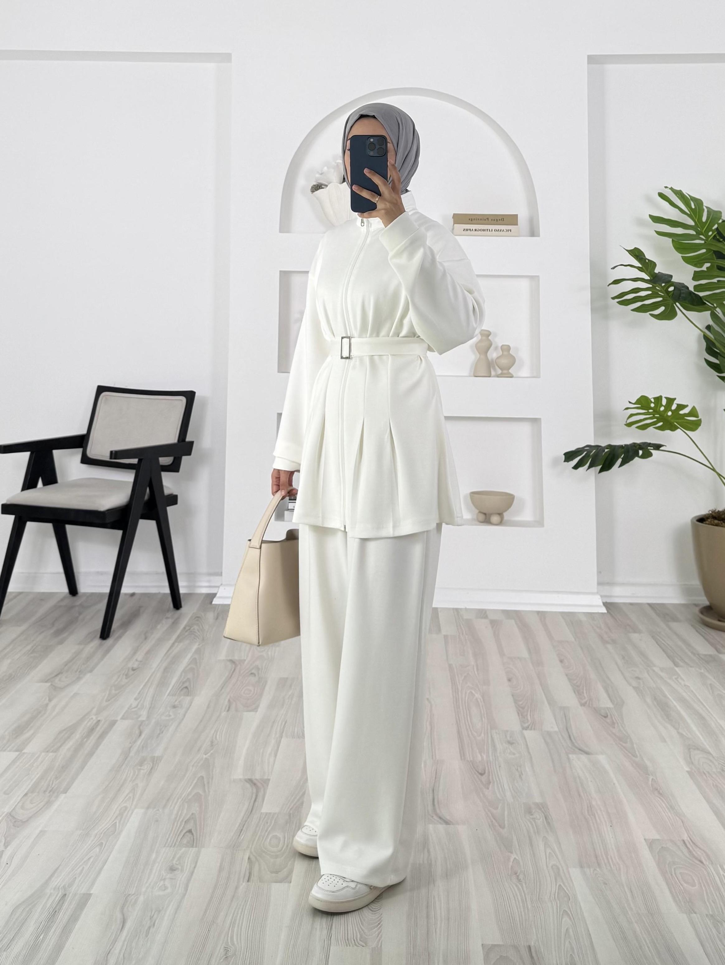 6352-oysho kumaş-kemer detaylı pantolonlu takım-beyaz (6352)