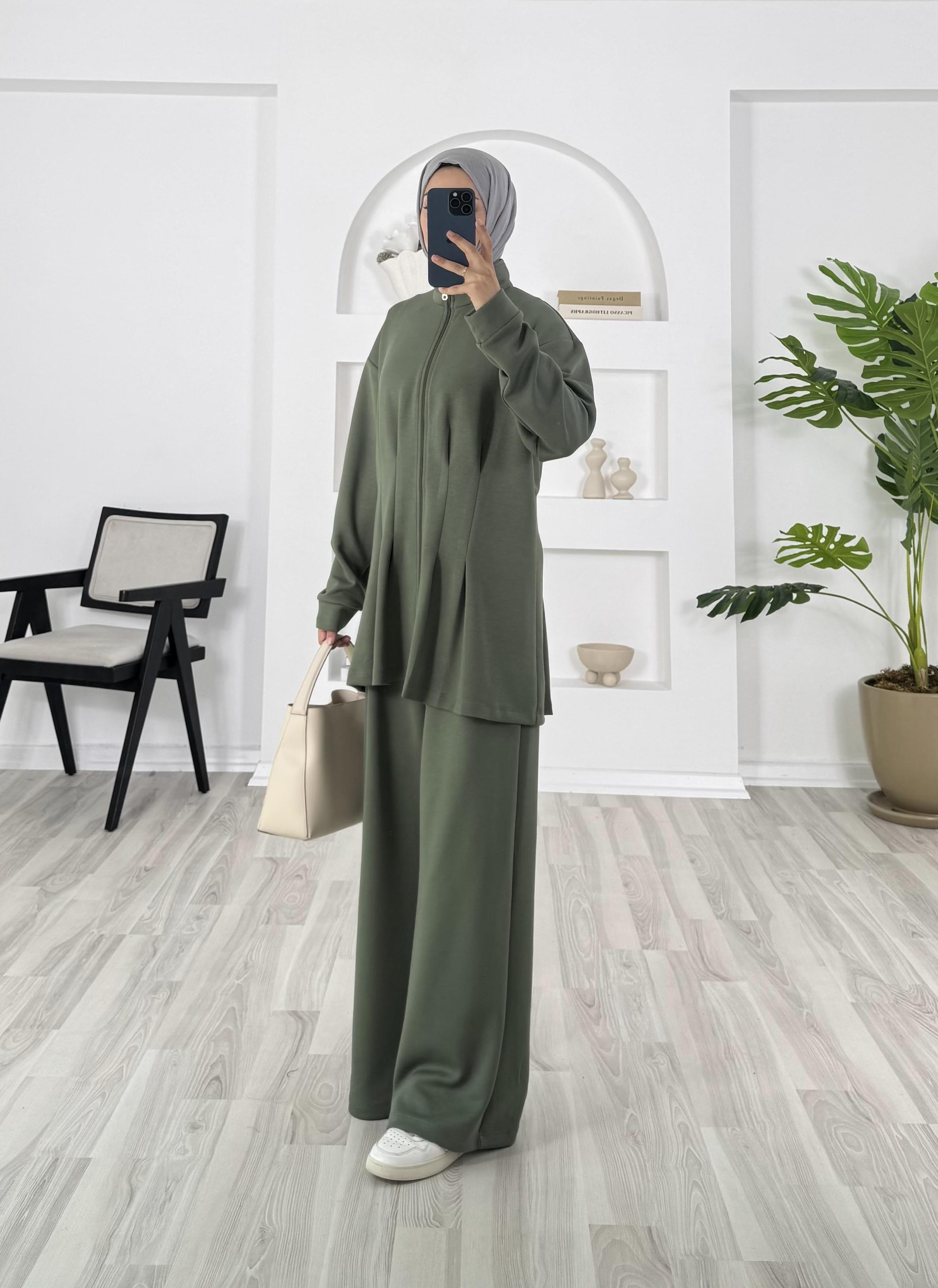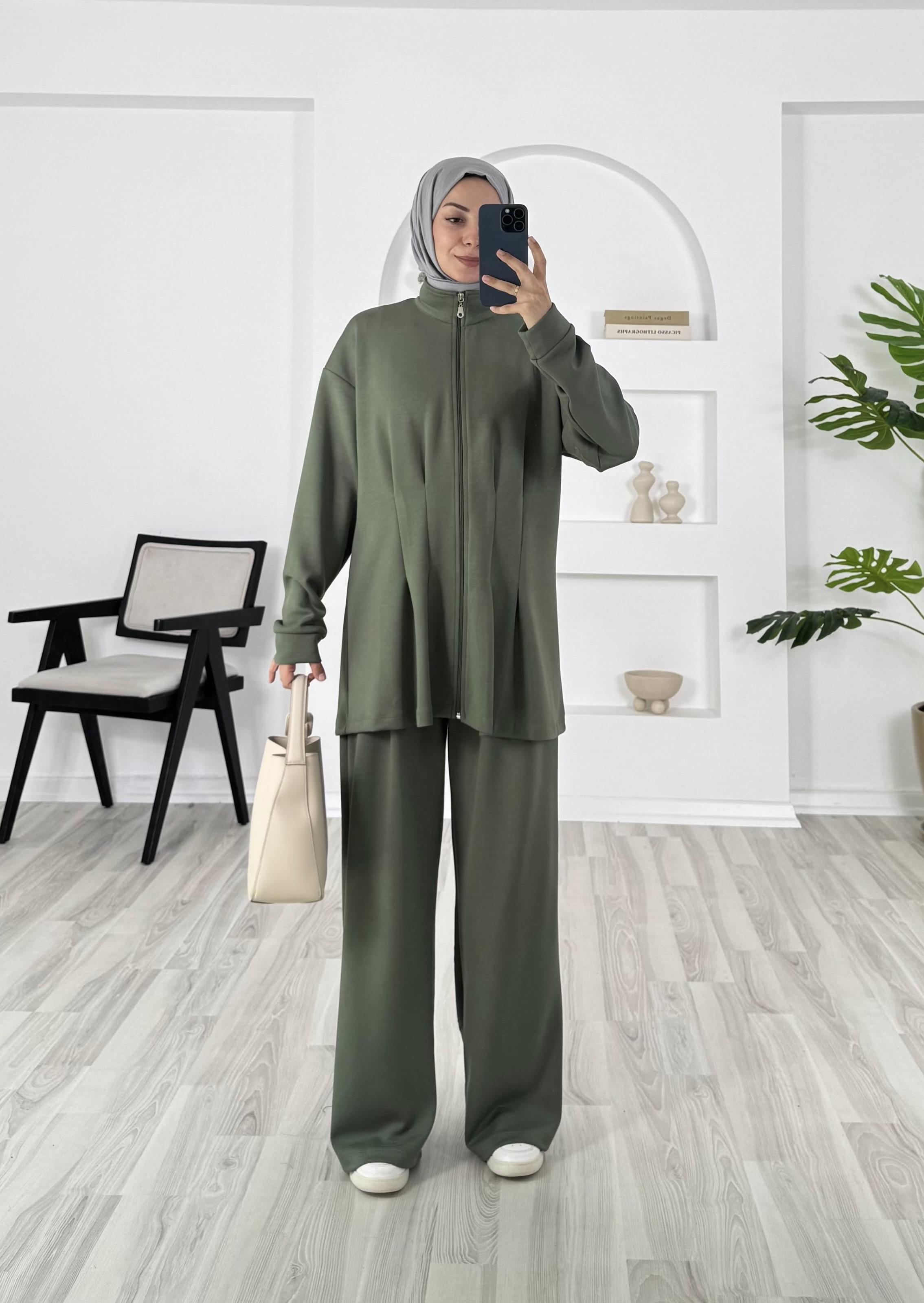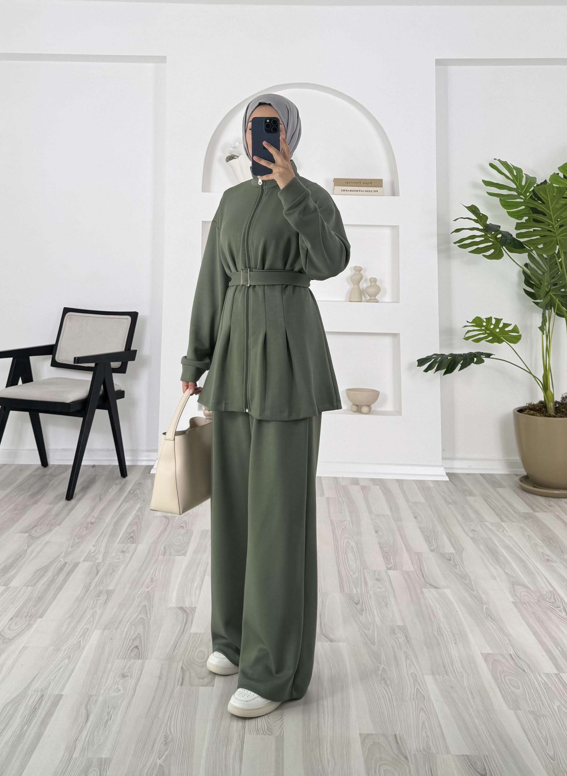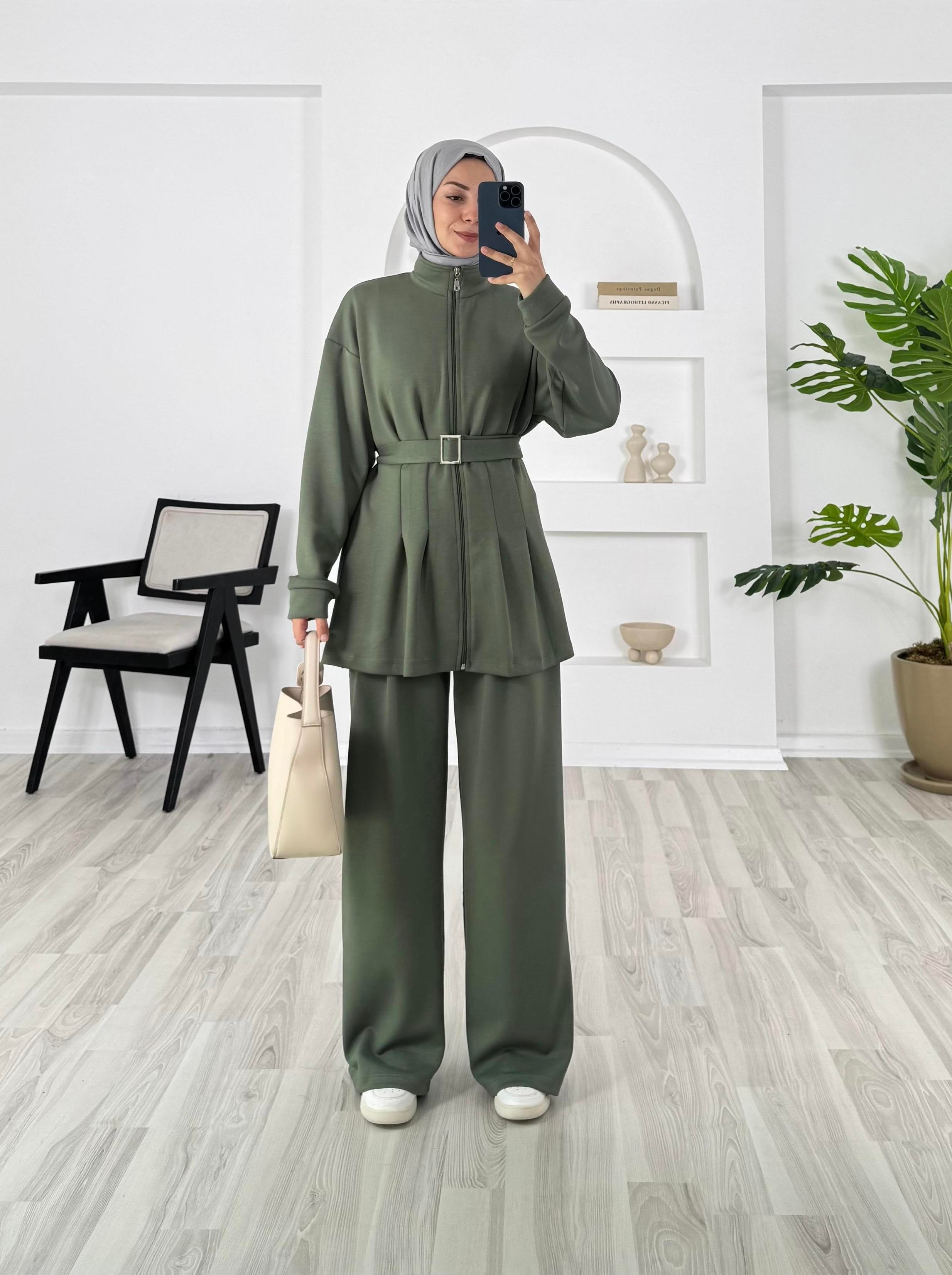 6352-oysho kumaş-kemer detaylı pantolonlu takım-yeşil (6352)