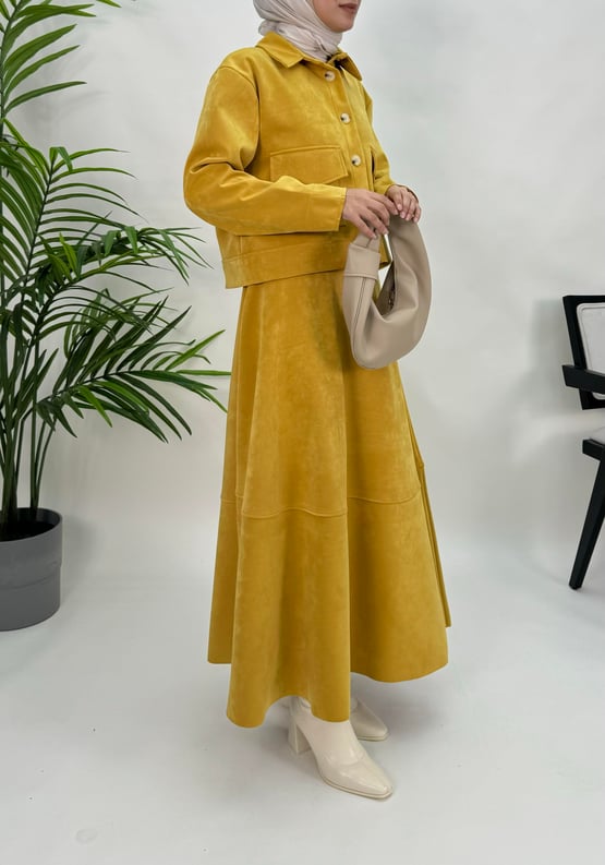 6354-süet kumaş-çift cep detaylı etekli takım-hardal (6354)