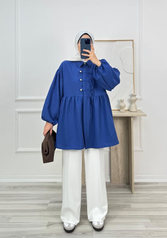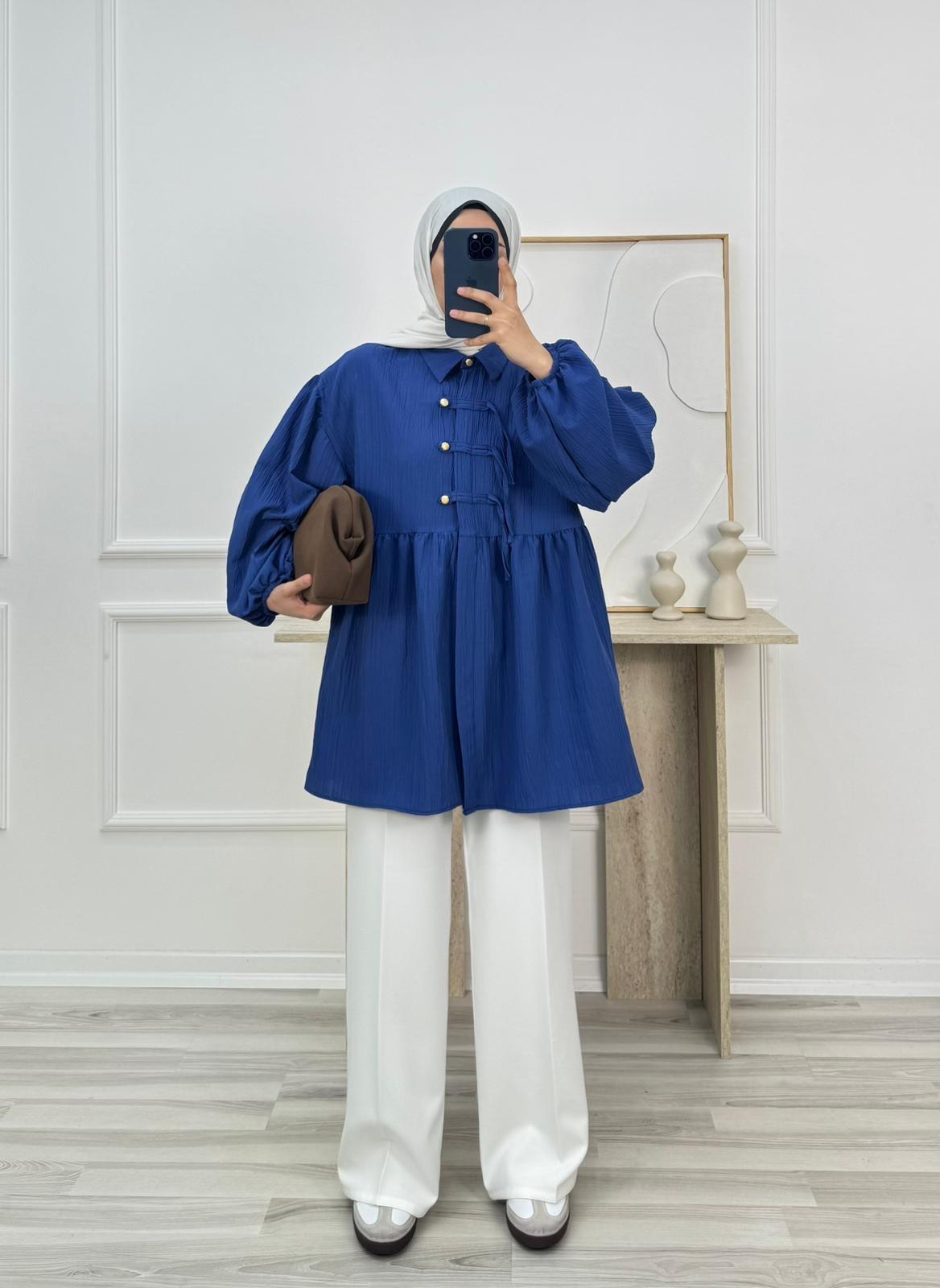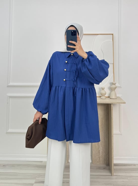 6358-nada kumaş düğmeli tunik-mavi (6358)